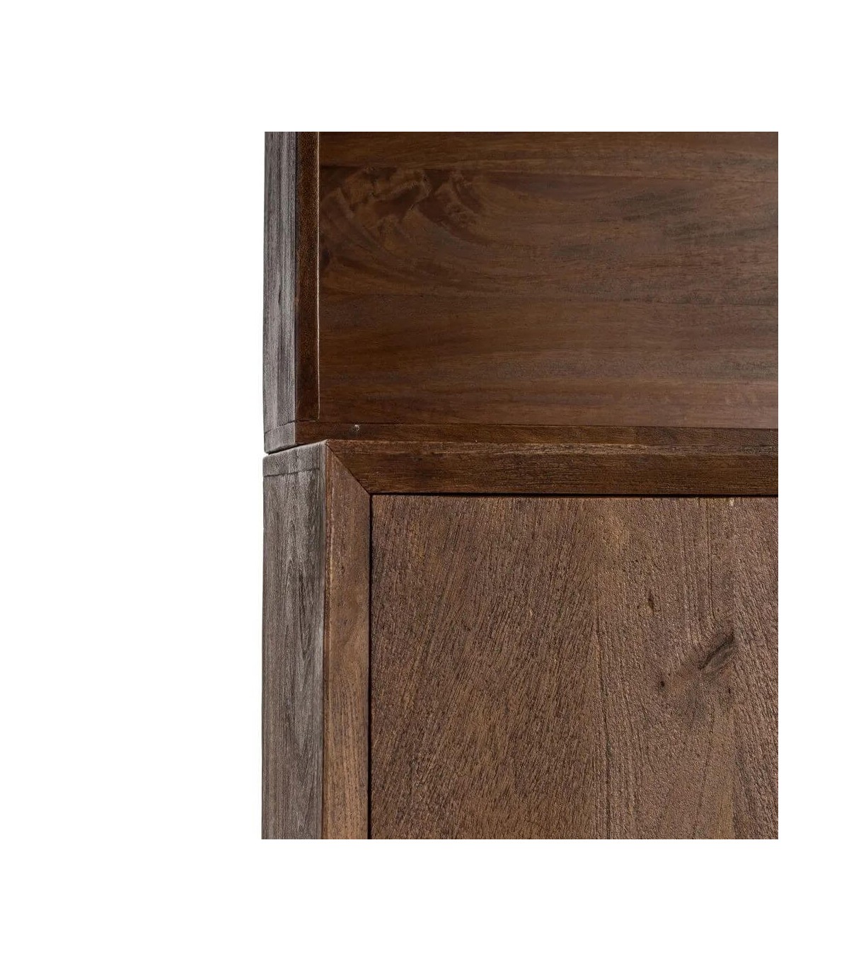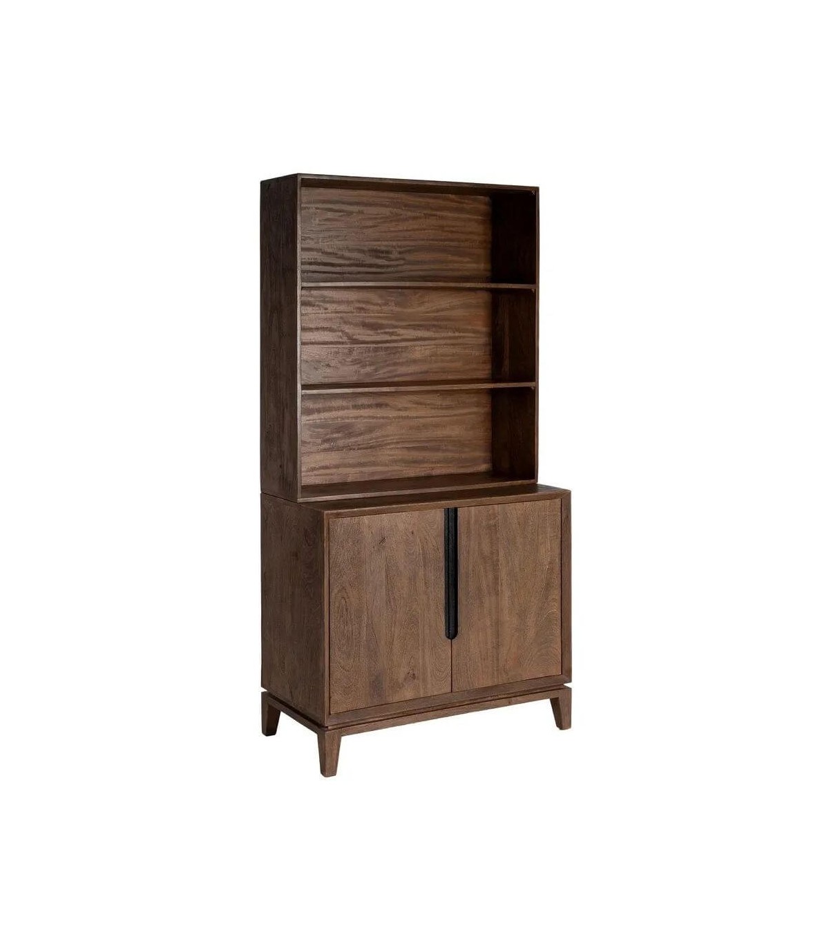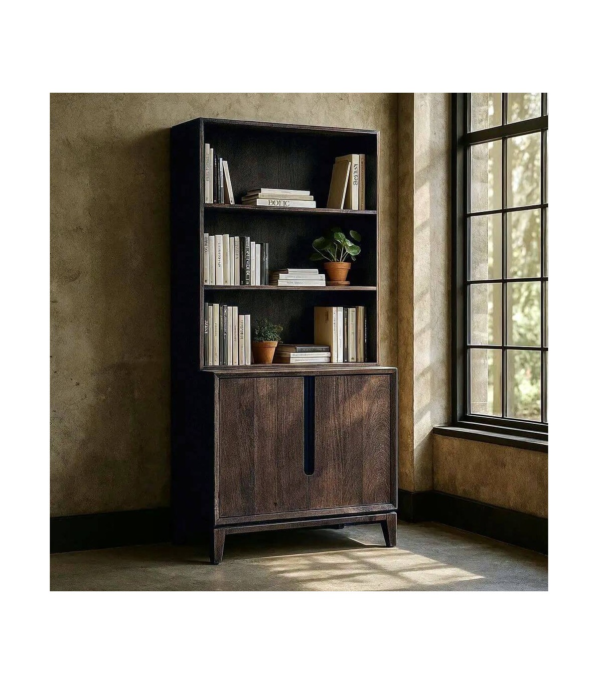 Estantería de estilo colonial con estructura alta y robusta fabricada en madera maciza de mango, acabada en un elegante tono nogal con detalles oscuros. La parte superior cuenta con dos amplios estantes abiertos para libros u objetos decorativos, mientras que la parte inferior incluye un práctico módulo cerrado con dos puertas.