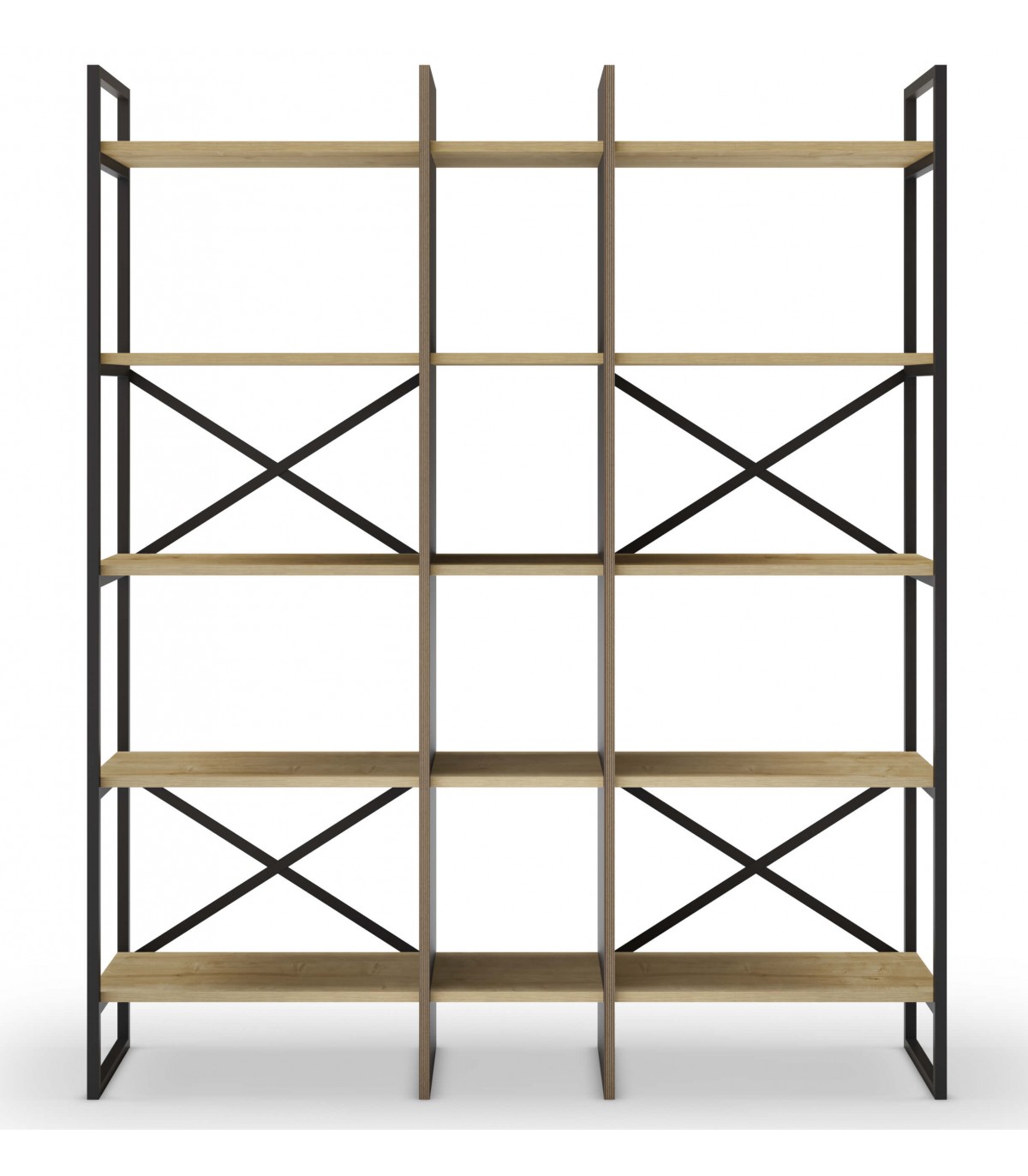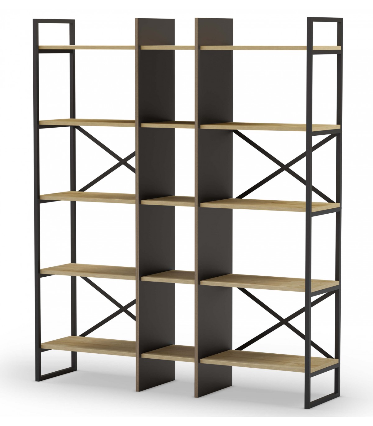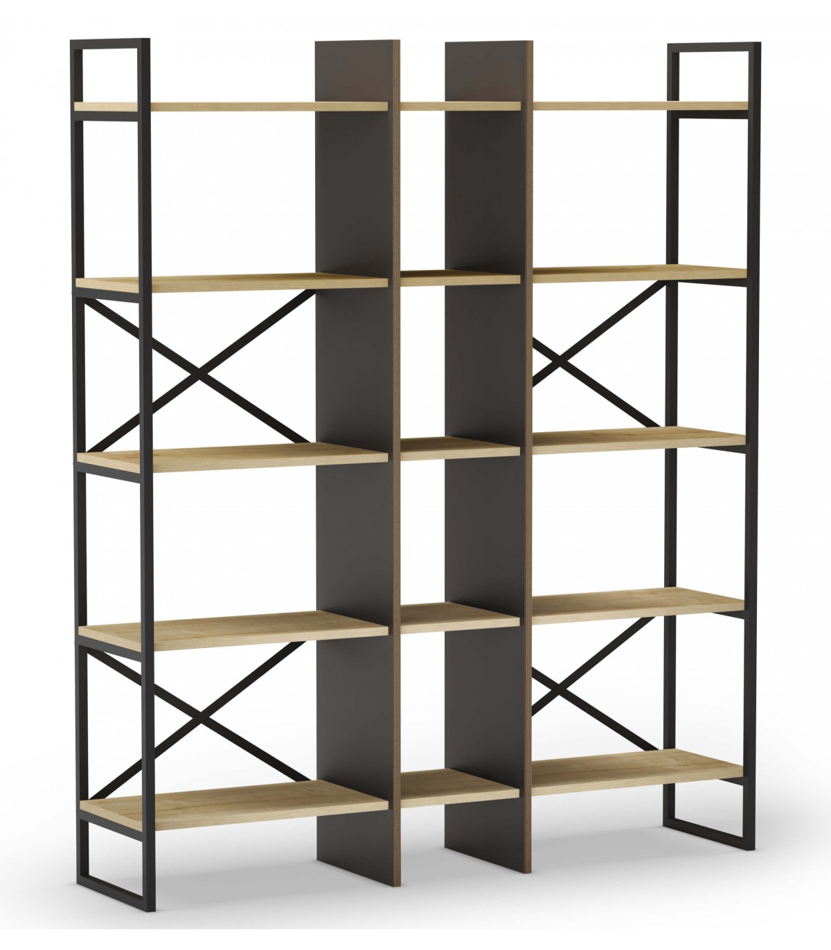 Librería estantería estable y robusta, realizada en madera mdf imitación roble natural y negro, metal negro, ideal para una habitación, salón o despacho.