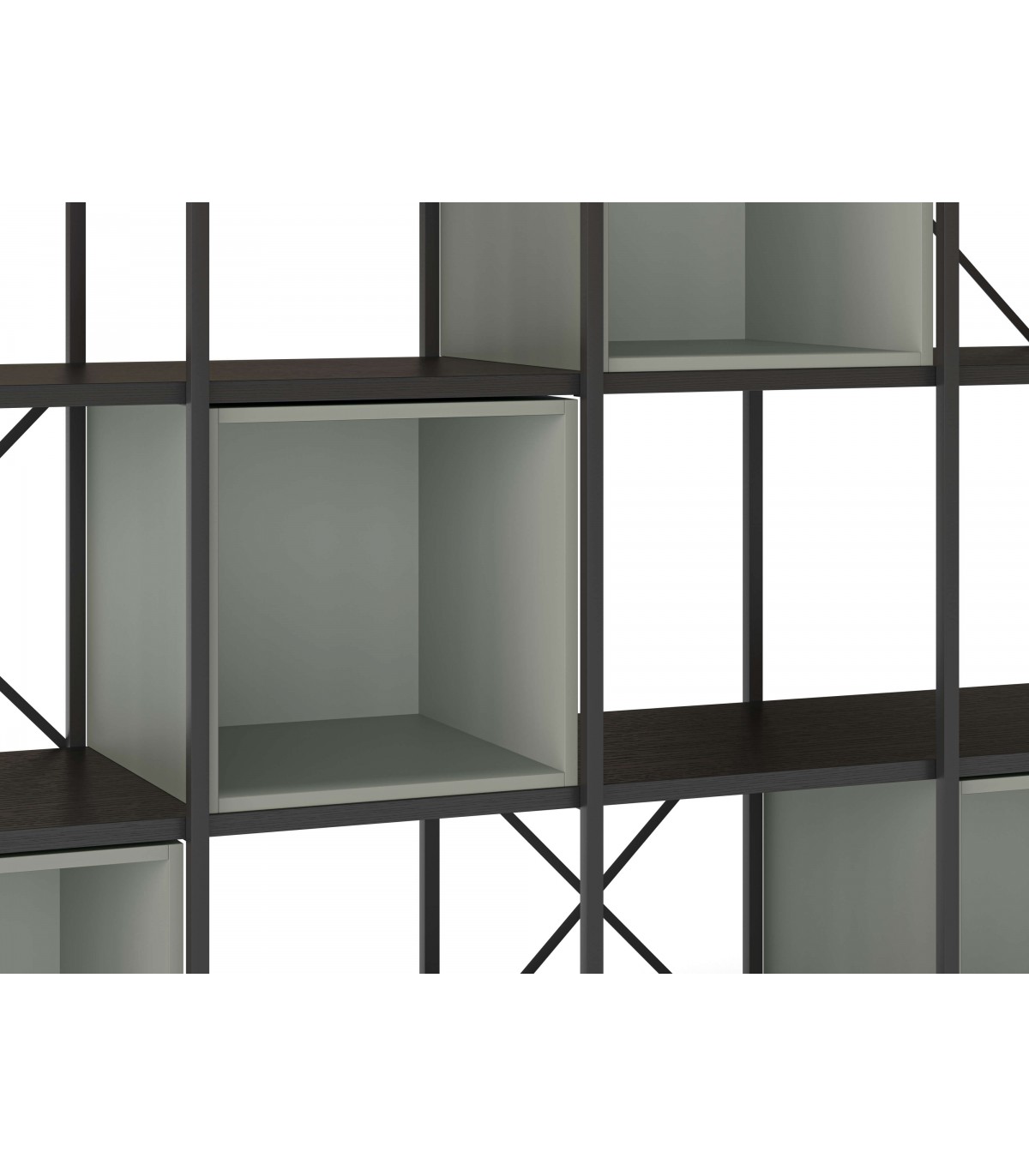 Esta estantería de gran formato ofrece un diseño contemporáneo con fuerte influencia industrial. La estructura metálica negra y los estantes en melamina verde mate crean un contraste sobrio y elegante. Dispone de compartimentos abiertos distribuidos en distintos niveles, perfectos para libros, decoración o almacenaje funcional.