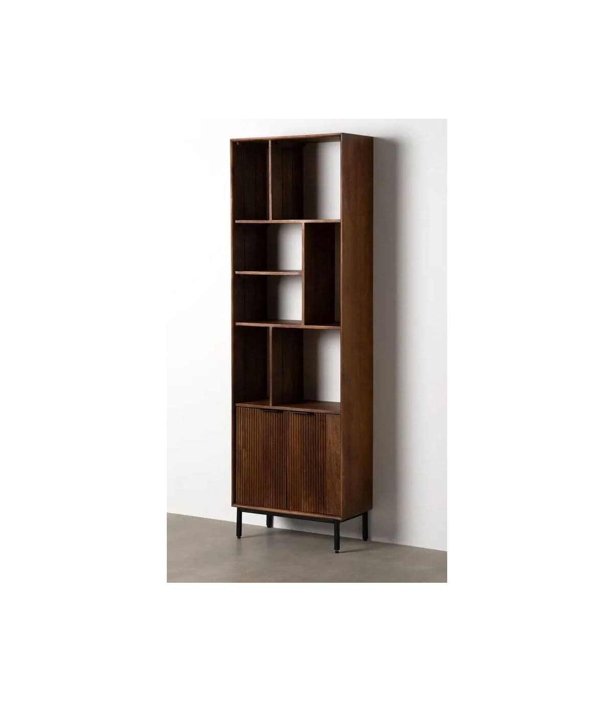 Librería estantería con 2 puertas estable y robusta, realizada en madera de mango con los tiradores y las patas en metal negro, ideal para una habitación, salón o despacho.