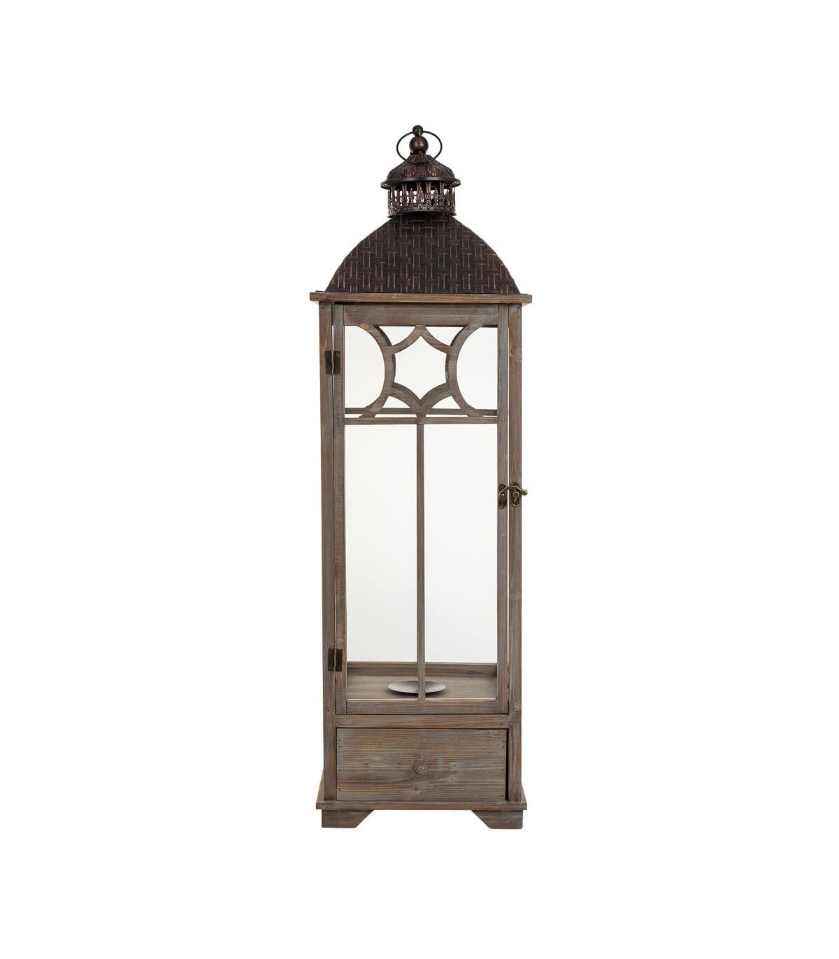 Inspirado en la elegancia atemporal de los interiores clásicos, este farol muy alto aporta calidez y presencia decorativa al espacio. La estructura de madera transmite una sensación natural y equilibrada que envuelve el conjunto. La puerta de cristal y el cajón inferior crean un juego funcional y estético bien proporcionado.
