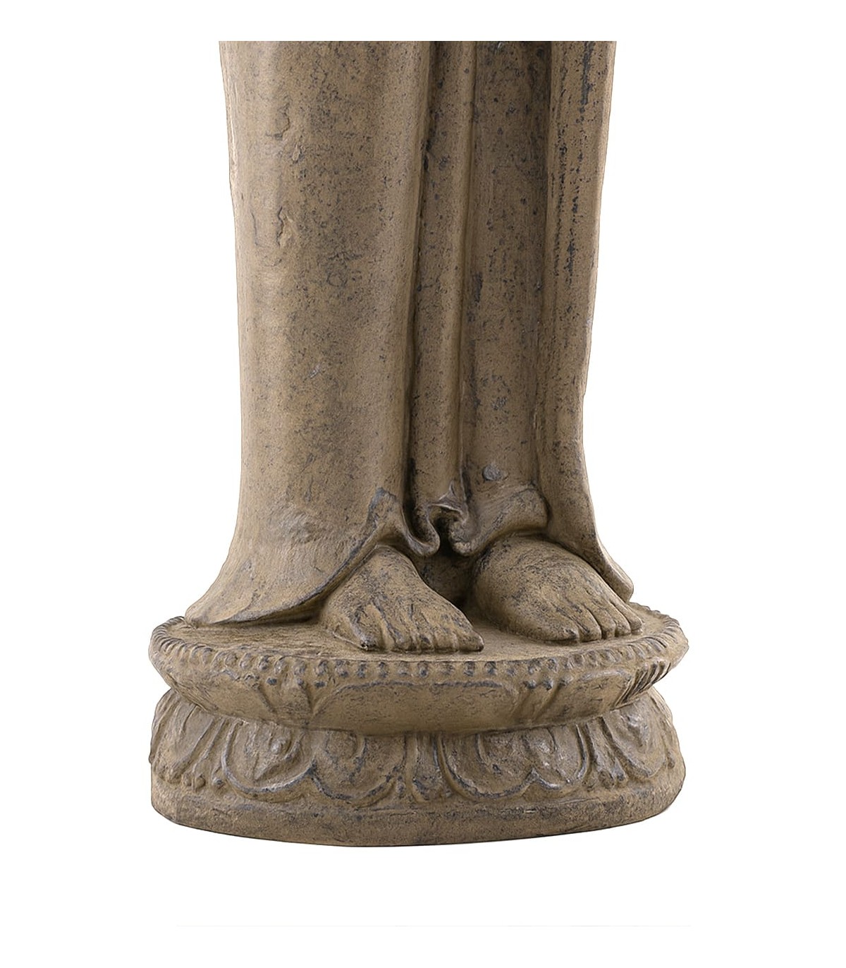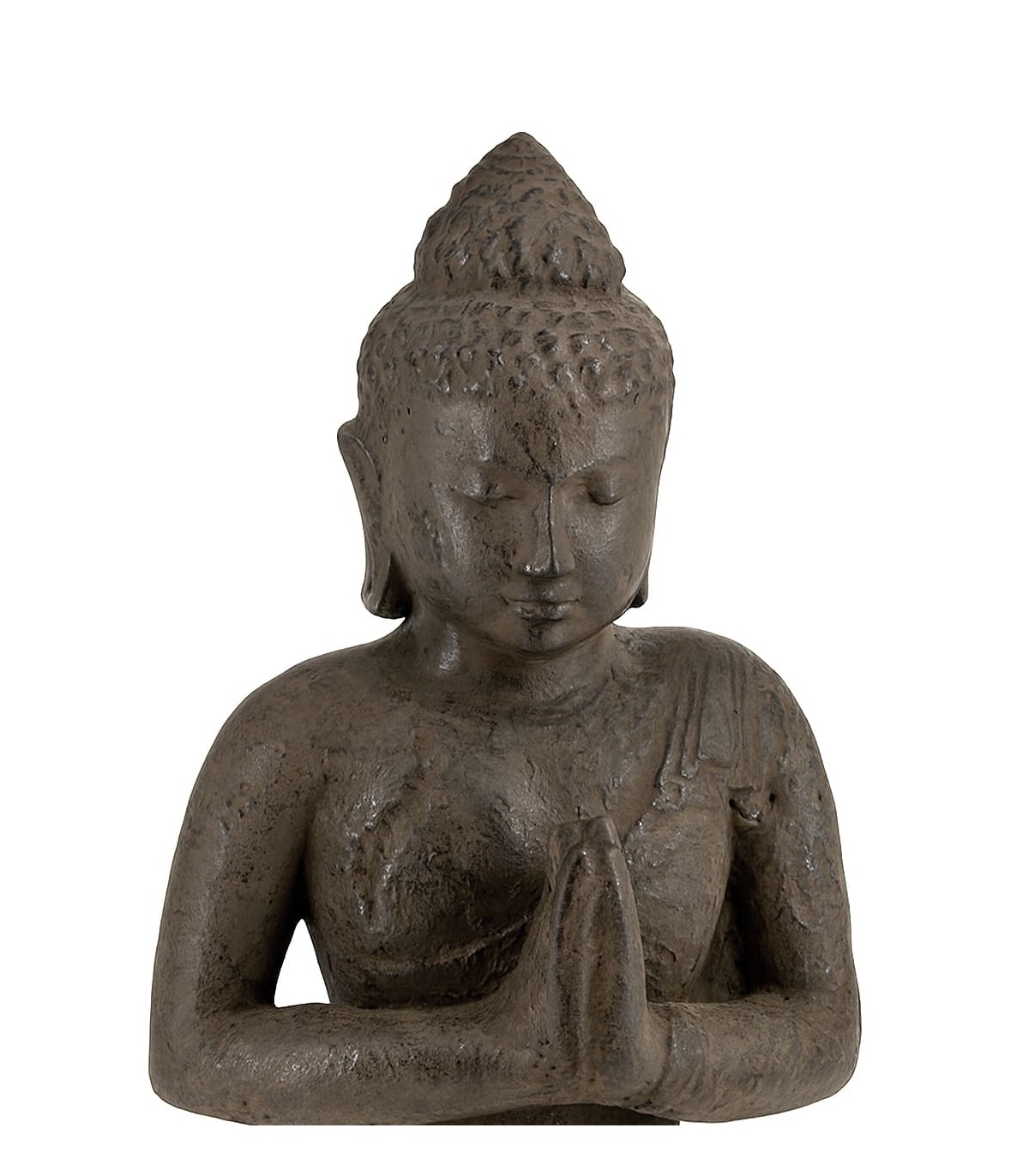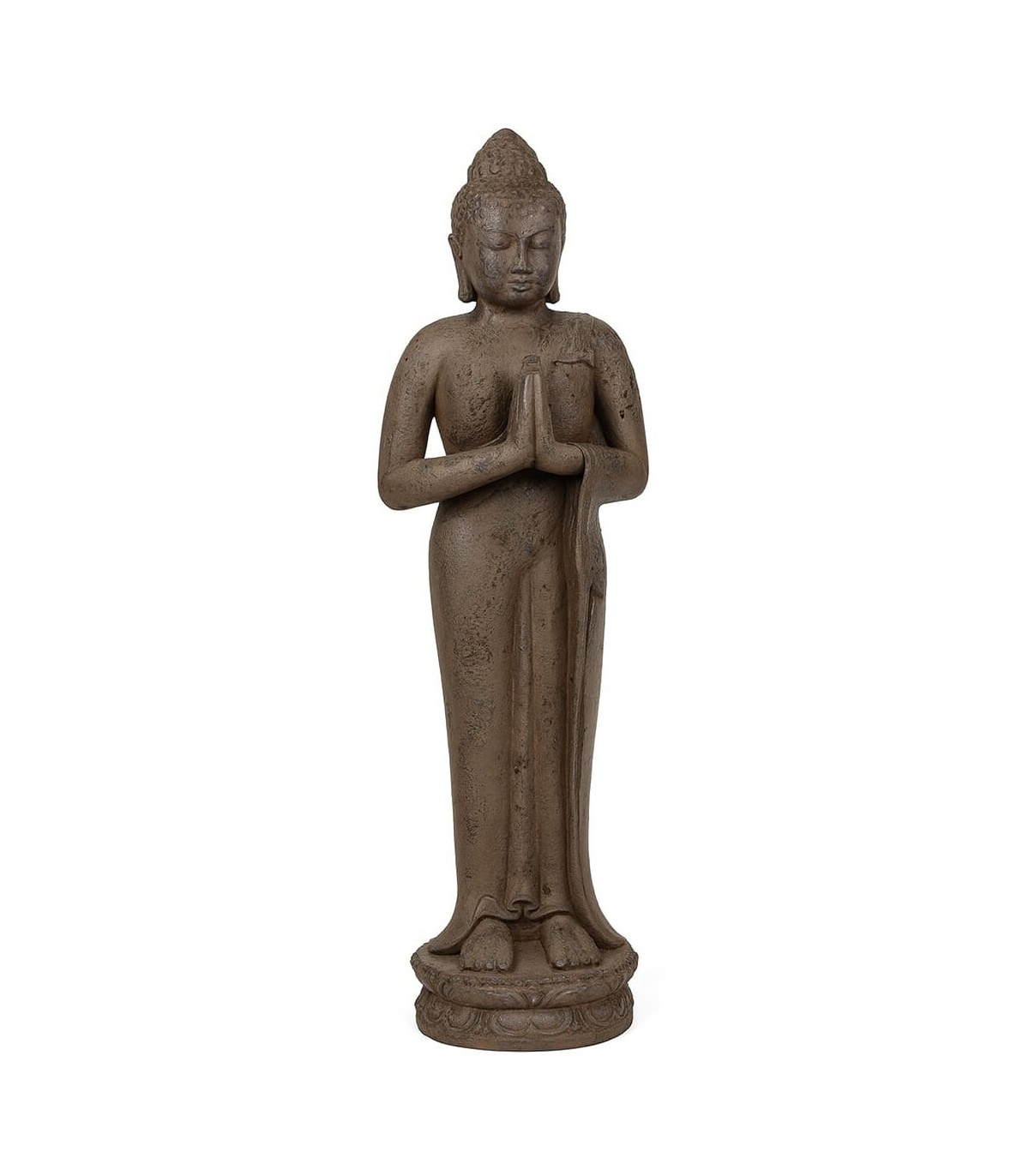 La presencia serena de esta figura decorativa aporta un aire étnico y espiritual al espacio, creando un punto de equilibrio tanto en interiores como en zonas exteriores protegidas. Su acabado en imitación bronce antiguo aporta profundidad y matices que enriquecen la textura del cemento, ofreciendo un aspecto envejecido y lleno de carácter.