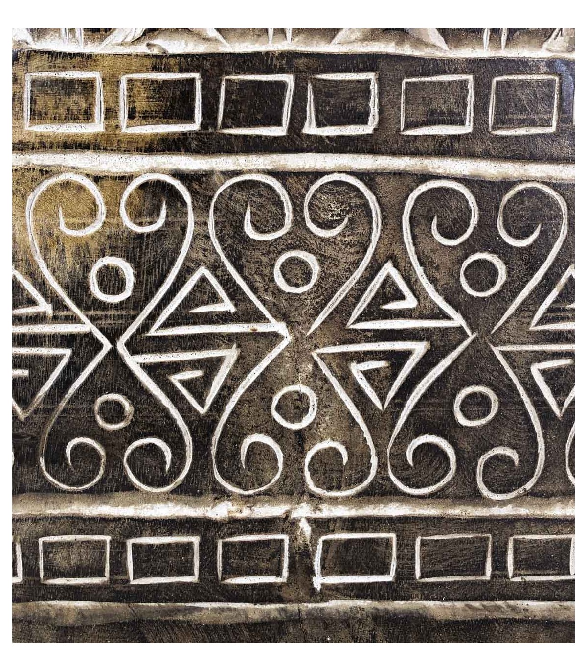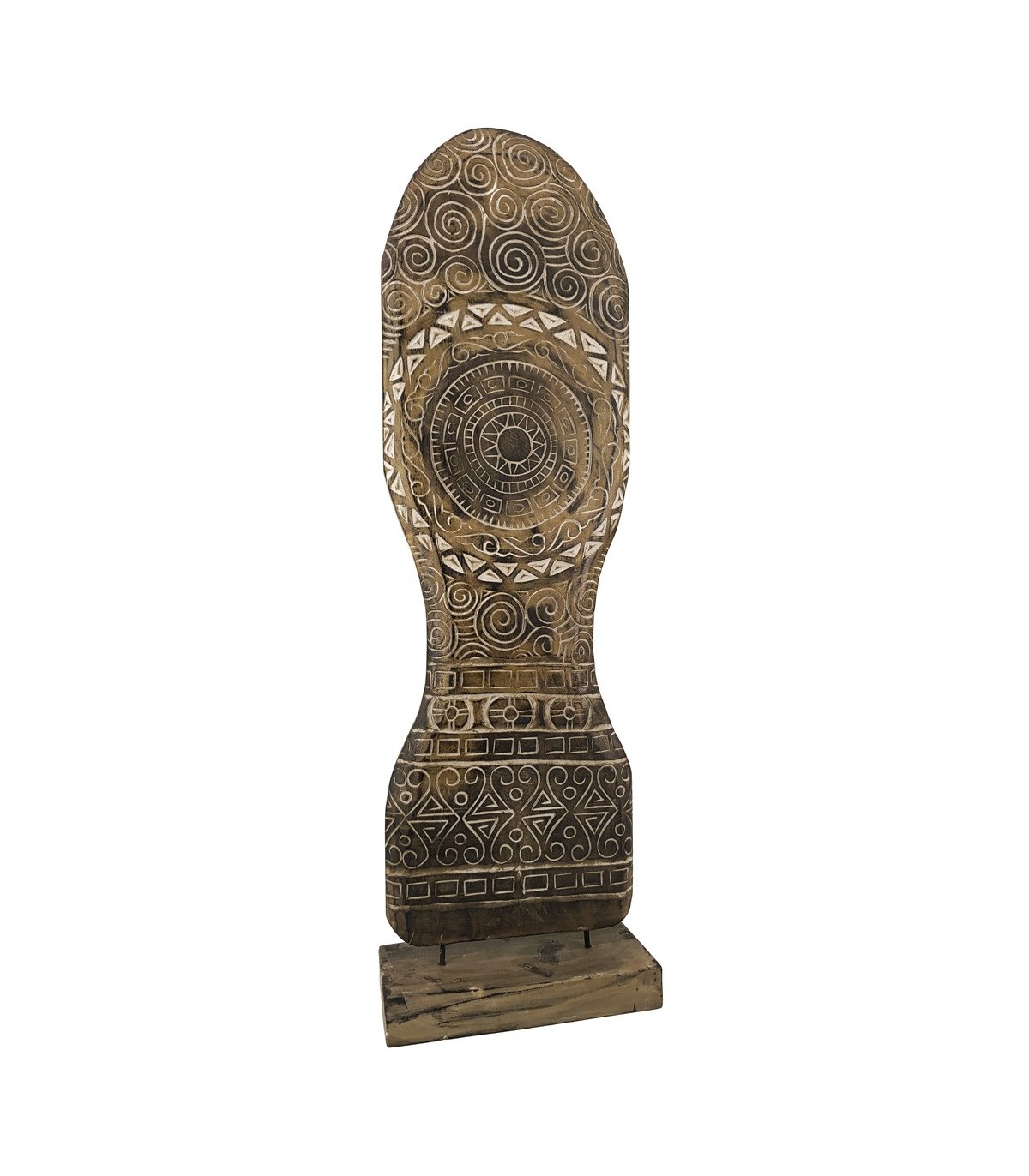 Figura decorativa de estilo étnico, fabricada en madera maciza de durian, es una pieza exclusiva tallada a mano por artesanos expertos. Su acabado con matices en blanco realza los detalles del tallado y aporta un efecto envejecido que resalta su belleza natural. Su diseño único y su gran tamaño la convierten en el complemento ideal para salones, recibidores, dormitorios o espacios de inspiración boho, rústica y exótica.
