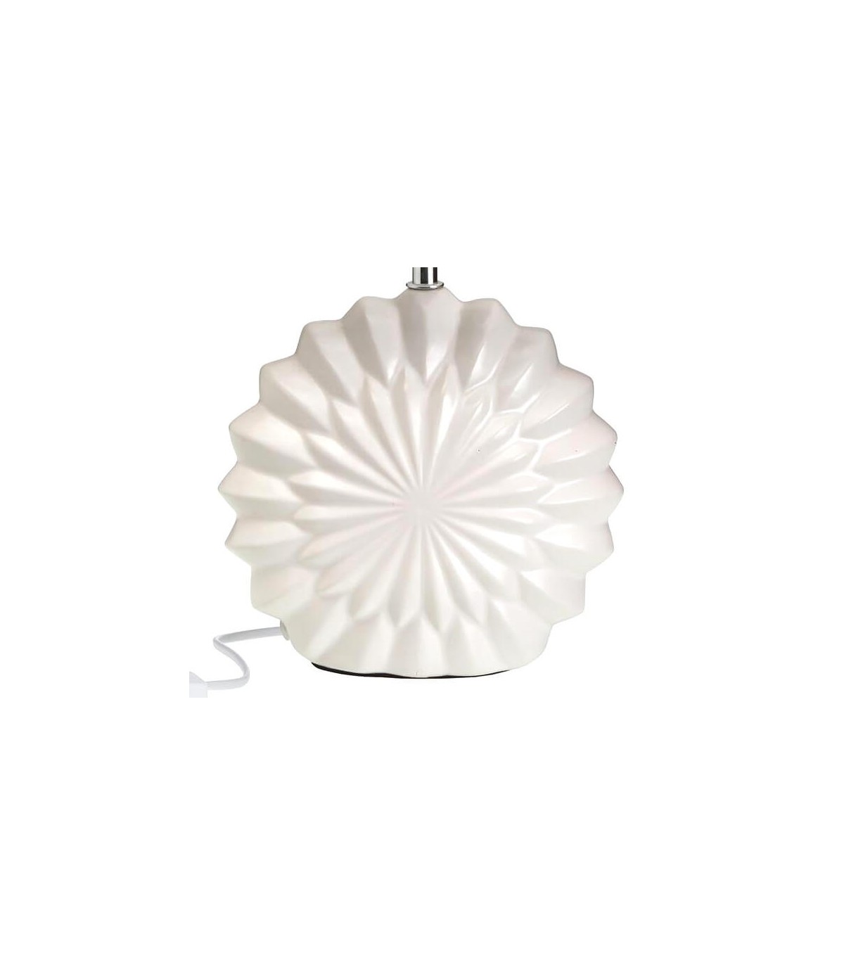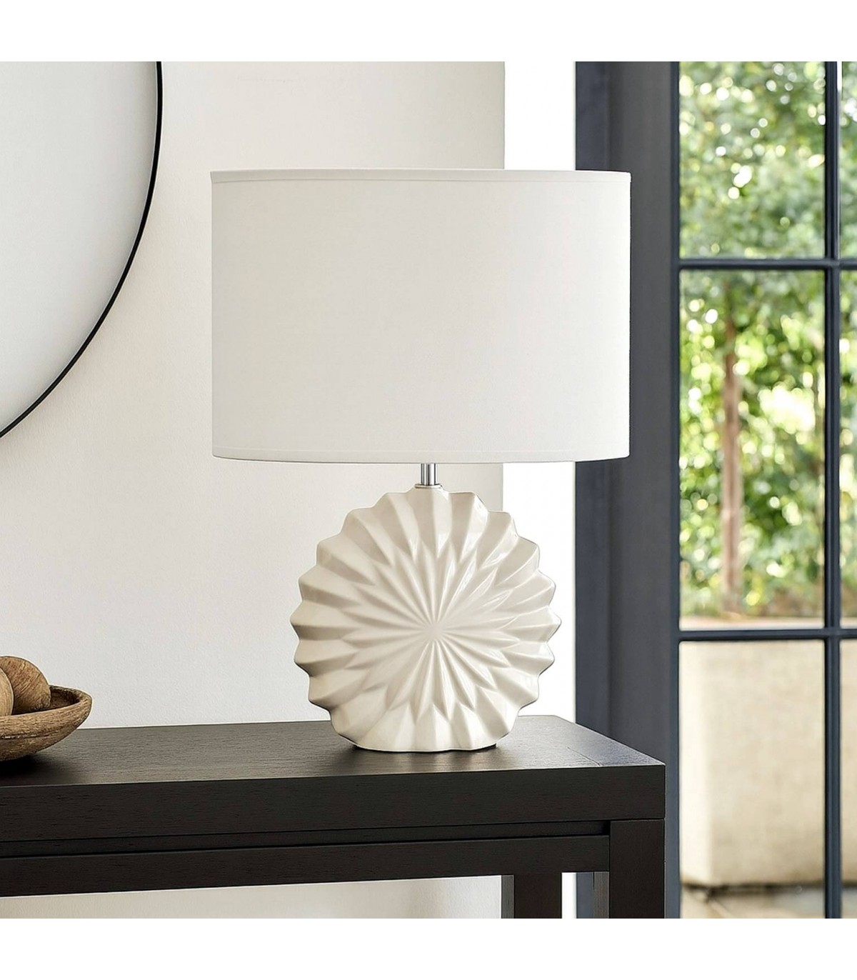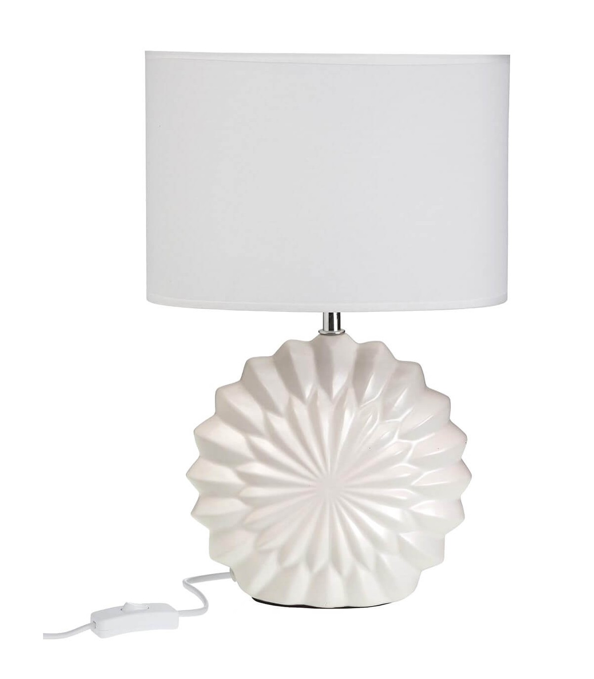 Esta lámpara de sobremesa destaca por su diseño escultórico y su pureza visual. La base de cerámica blanca, con forma circular estriada, aporta textura sin sobrecargar el ambiente. Su pantalla ovalada de lino blanco matiza la luz con suavidad, creando un efecto envolvente y cálido.