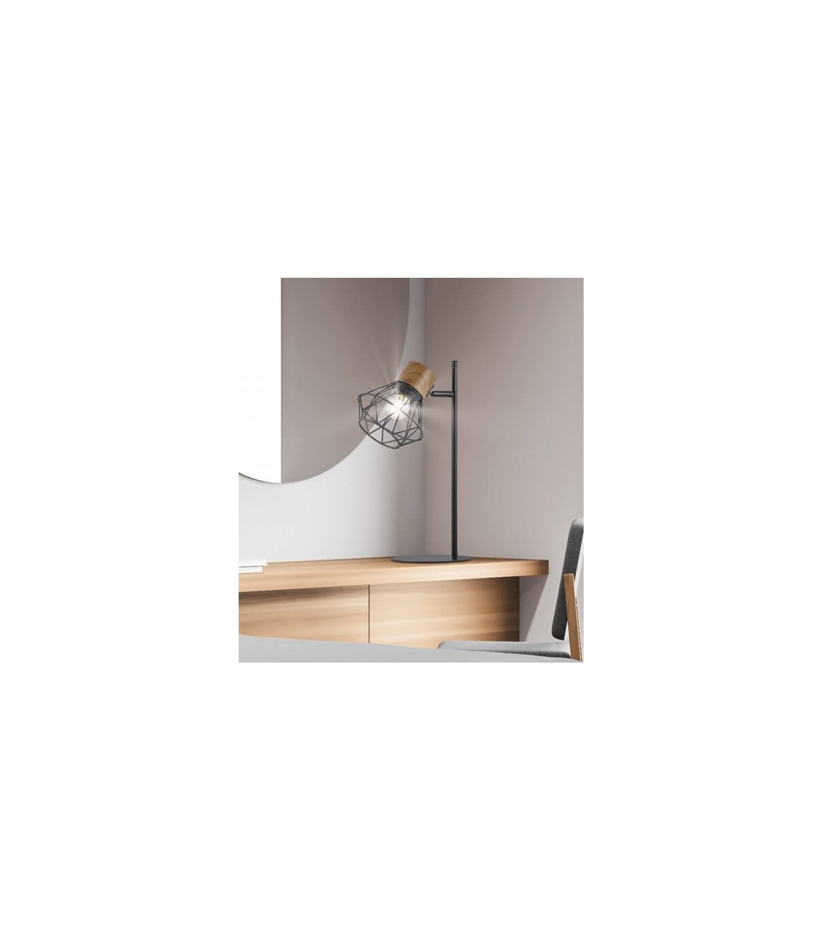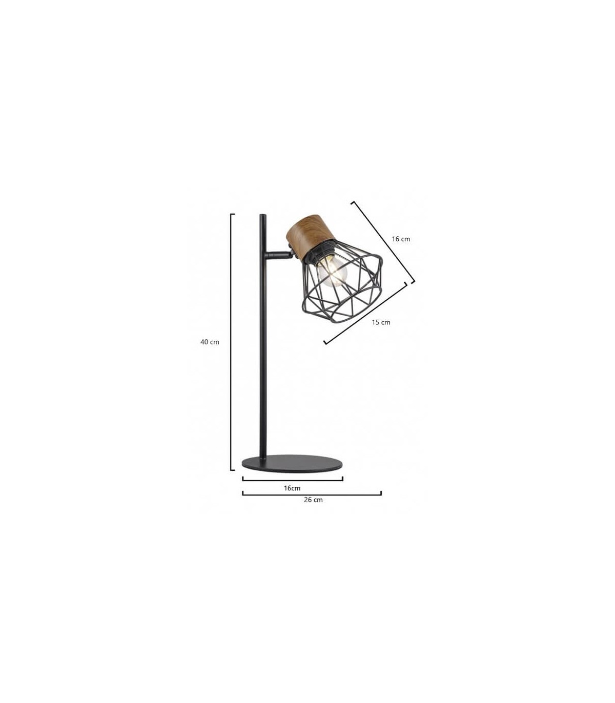 Lámpara de sobremesa realizada en metal negro y mdf imitación roble tostado, de estilo industrial. Con una de celdilla en metal, elegante y muy decorativa. Perfecta como luz de lectura o como luz de ambiente.