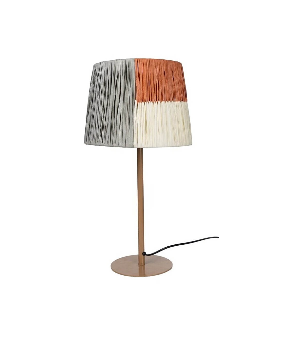 Lámpara de sobremesa original con la base en metal acabado oro viejo y la pantalla en cuerda de color gris, beige y marrón, una lámpara original y muy rica visualmente, perfecta para muebles de tamaño medio, como mesitas de noche, cómodas, aparadores y mesitas auxiliares.
