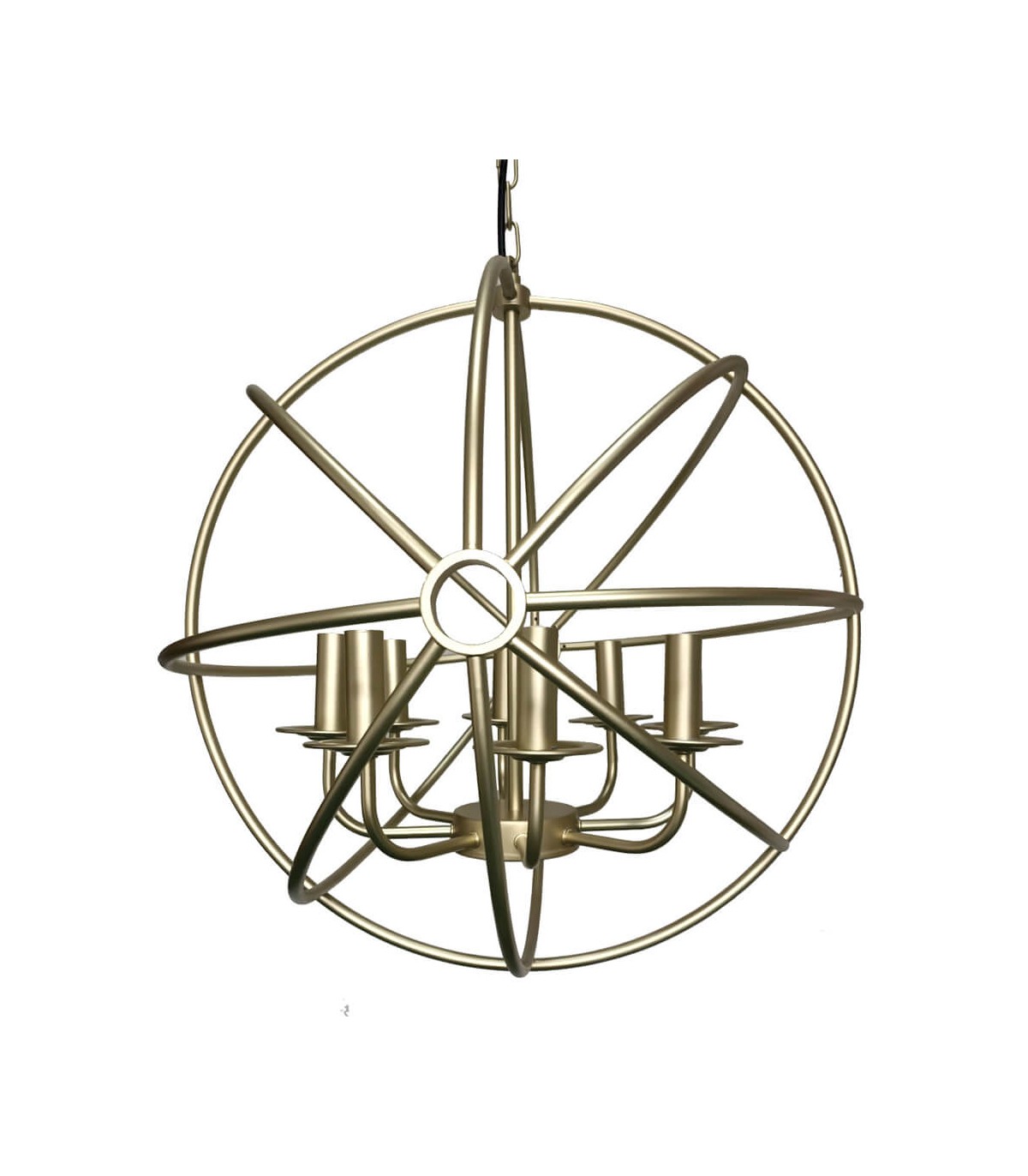 Lámpara de techo de diseño clásico, compuesta por una esfera estilo copérnico con 8 luces en su interior, realizada en metal acabado oro, regulable en altura perfecta para techos altos.