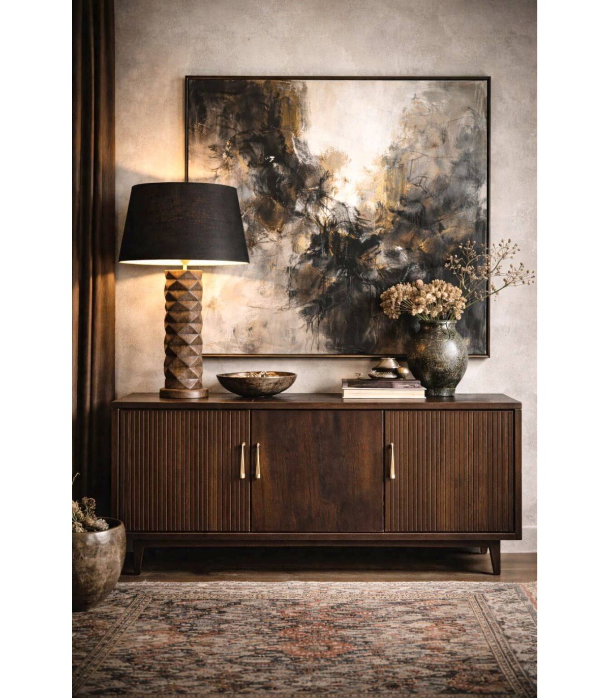 Lámpara de sobremesa de estilo colonial pensada para aportar calidez y presencia decorativa a cualquier estancia con una estética elegante y atemporal. El pie de madera tallada a mano destaca por su volumen y textura, convirtiéndose en el elemento protagonista del diseño.