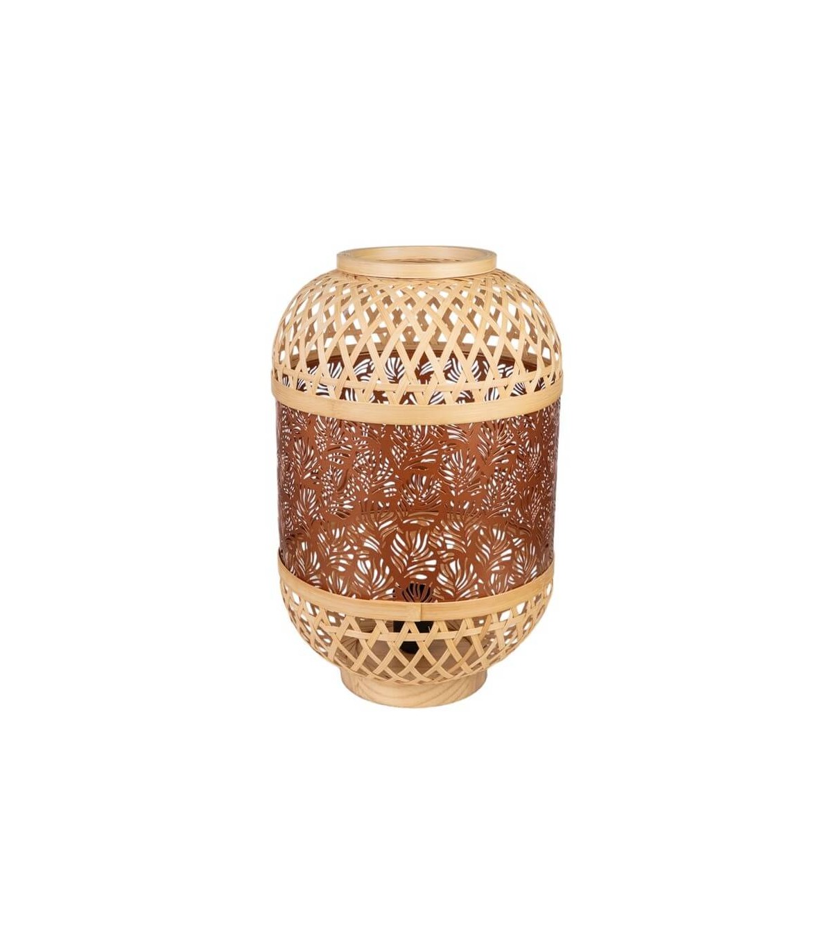 Aporta un aire exótico y relajante a tu hogar con esta lámpara de sobremesa de inspiración oriental. Su diseño combina bambú trenzado natural con una delicada estructura de metal repujado en color marrón, creando un juego de luces envolvente y cálido cuando se enciende.