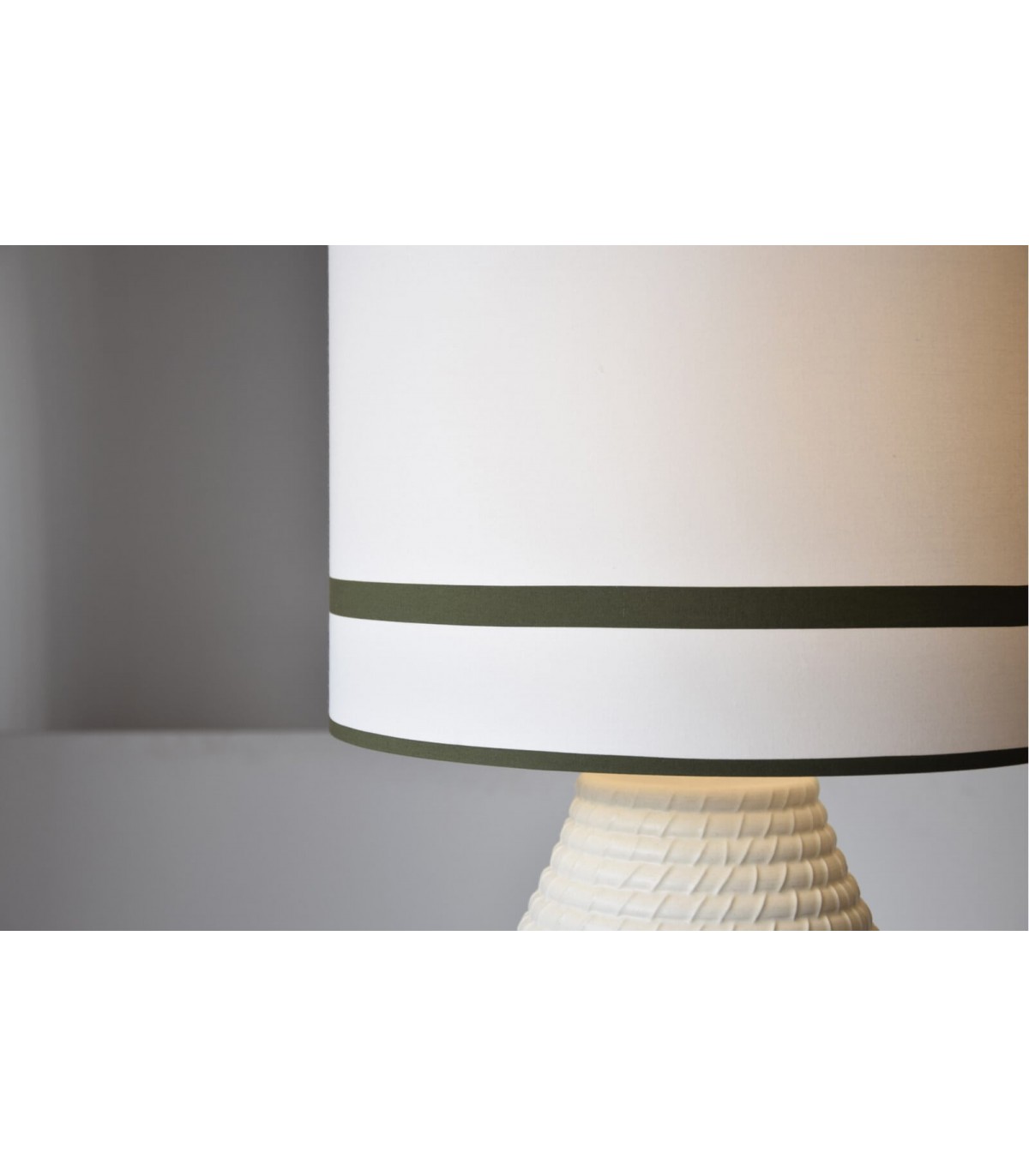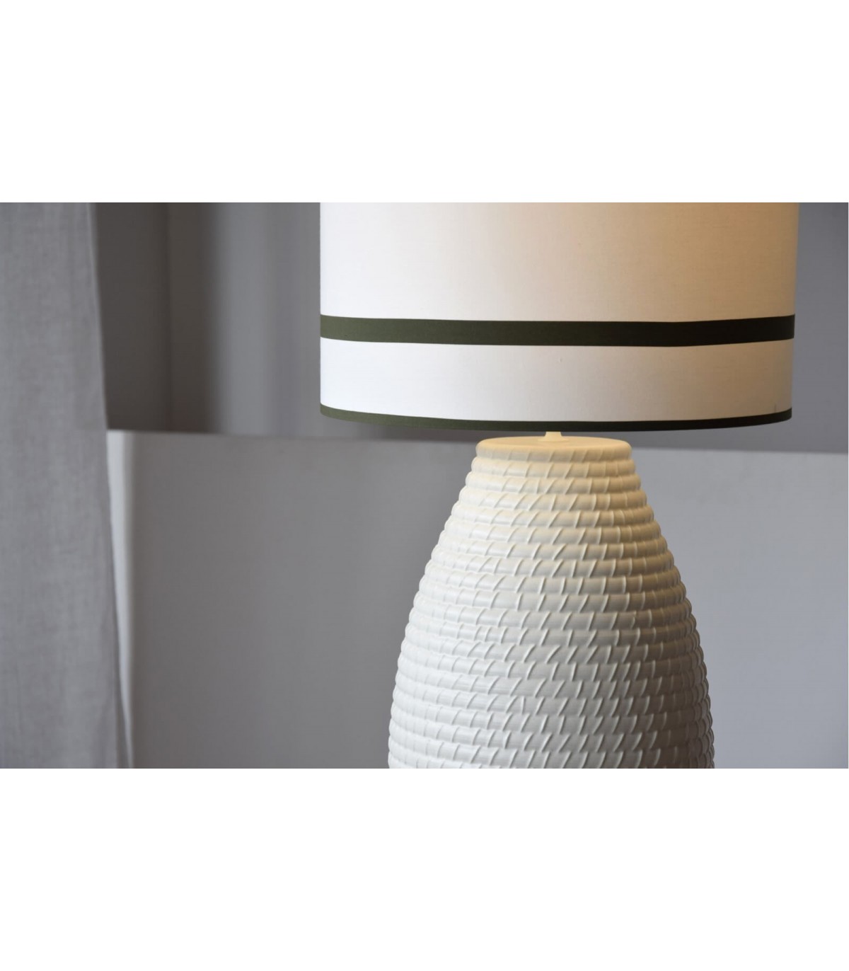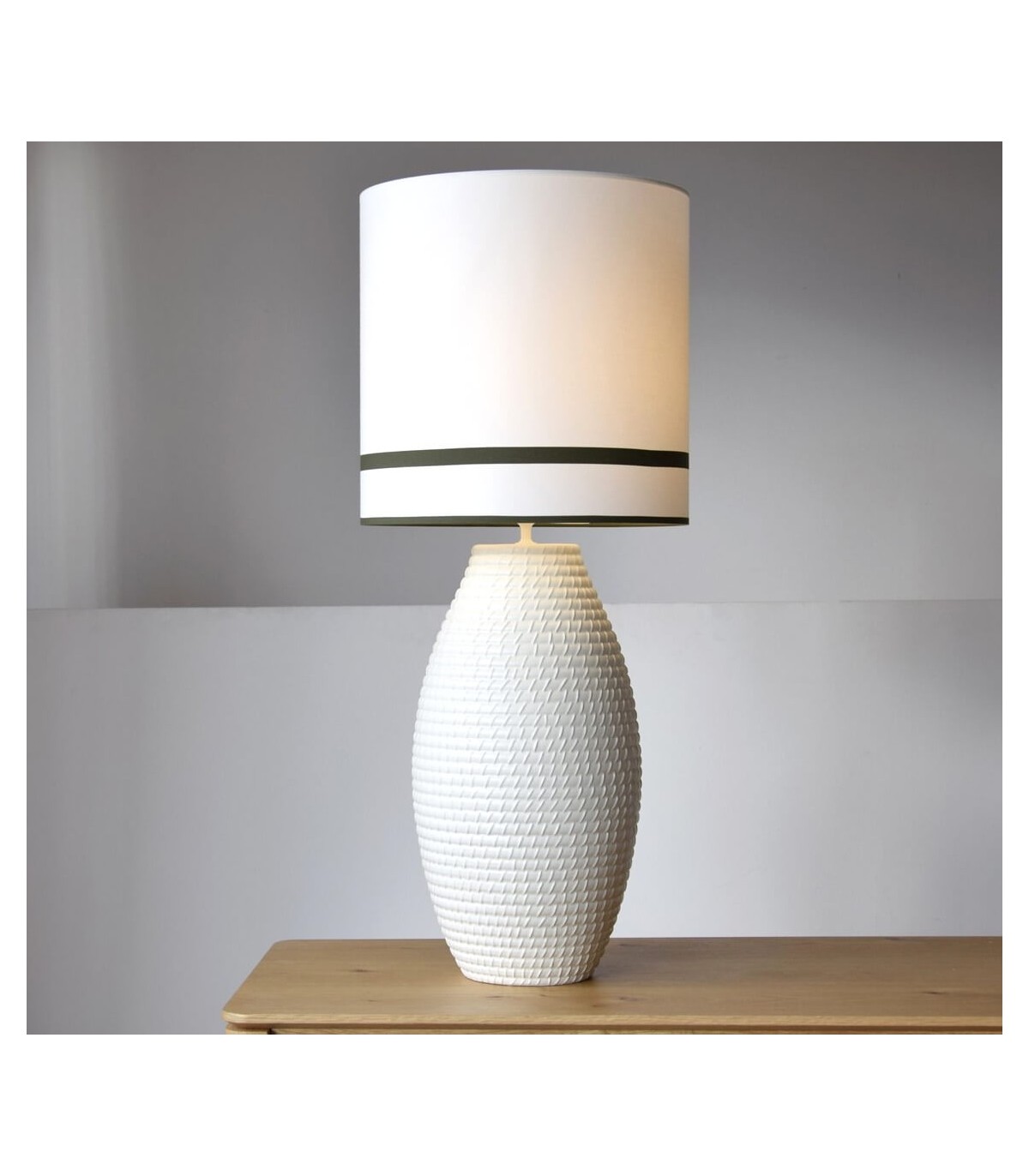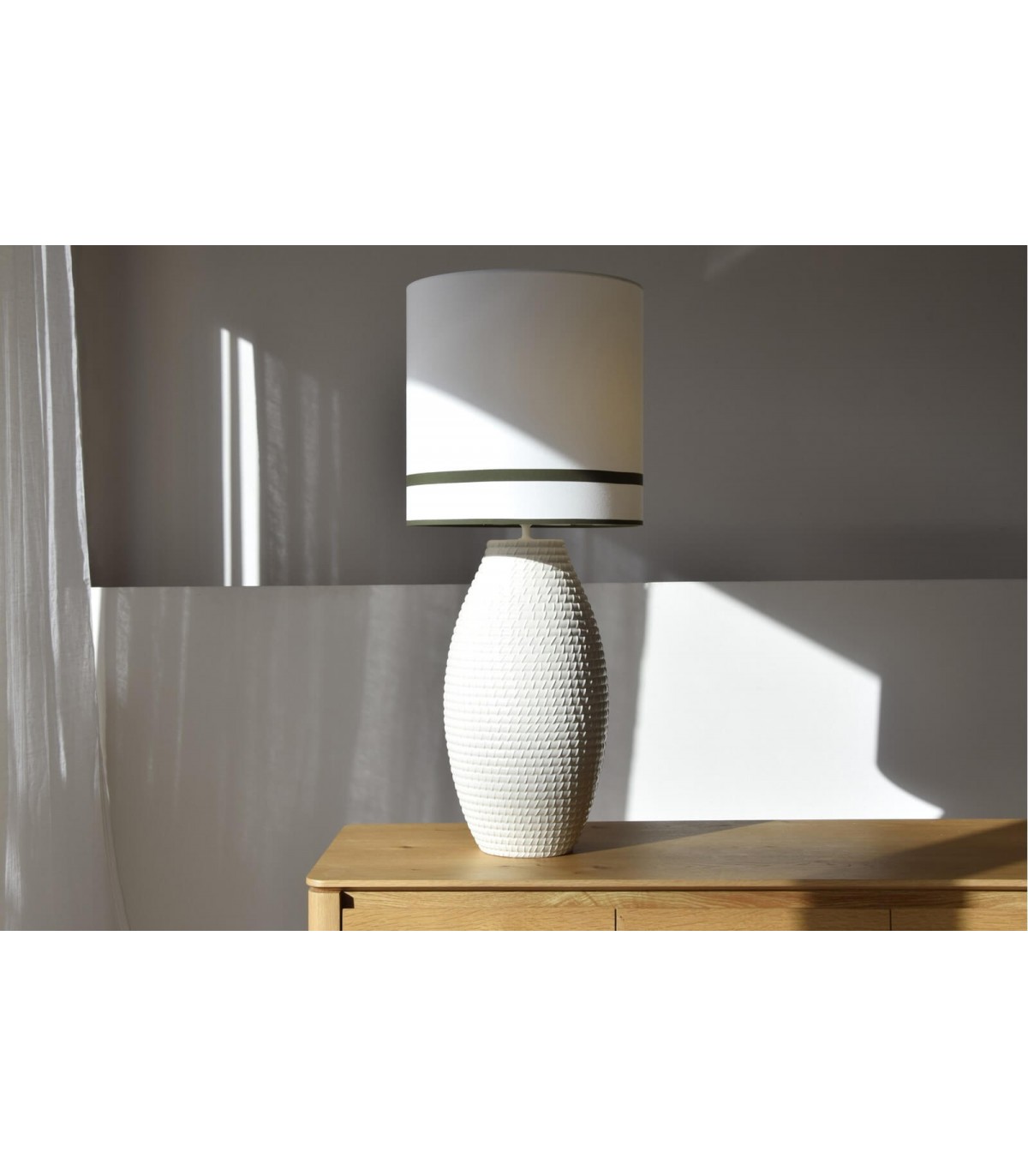 Esta lámpara de sobremesa de gran formato combina volumen y sutileza en un diseño contemporáneo pensado para destacar. Su base de cerámica blanca labrada aporta textura y luminosidad, mientras que la pantalla textil, también blanca, luce un discreto ribete verde que añade un toque fresco.