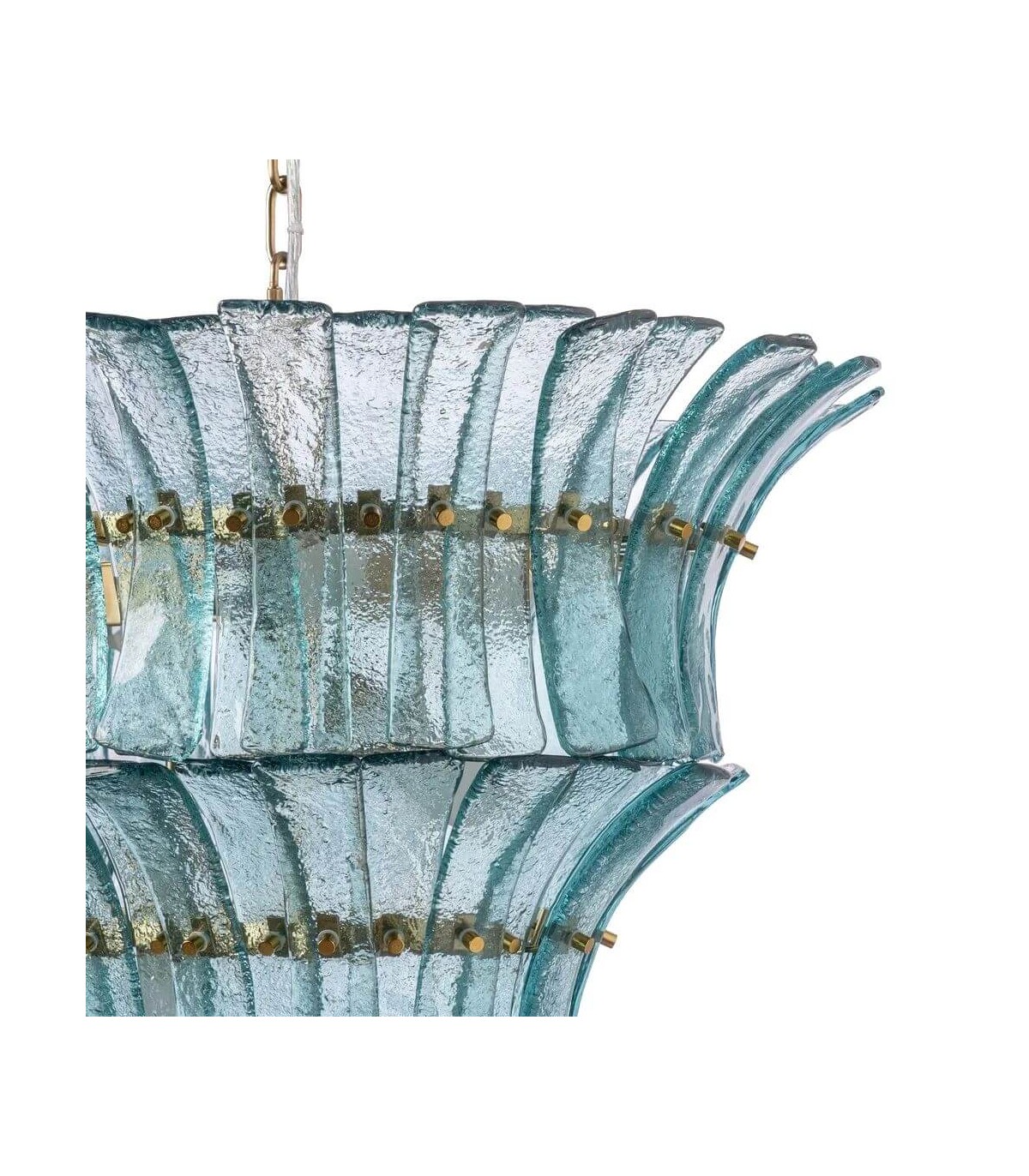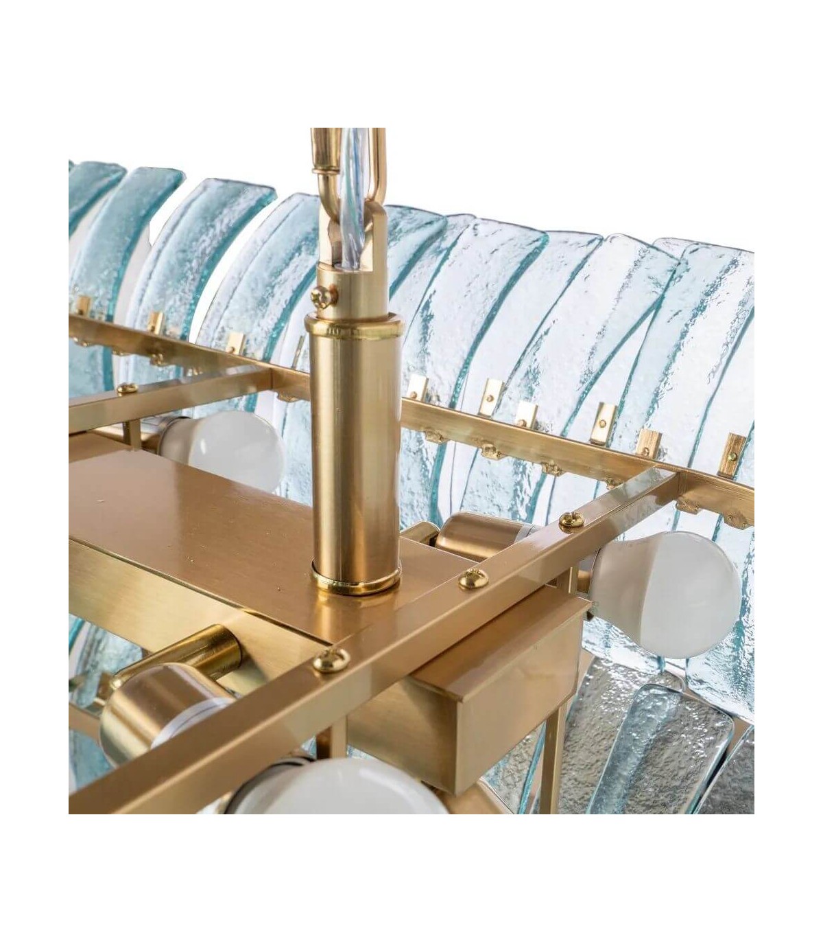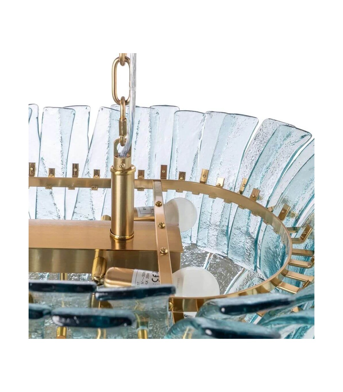 Esta lámpara de techo XL deslumbra con un diseño inspirado en el art decó que combina lujo y sofisticación en cada detalle. Sus piezas de cristal azul, trabajadas con un efecto translúcido, reflejan la luz con destellos elegantes y envolventes. La estructura metálica en dorado aporta brillo y contraste, creando un conjunto de gran impacto visual.