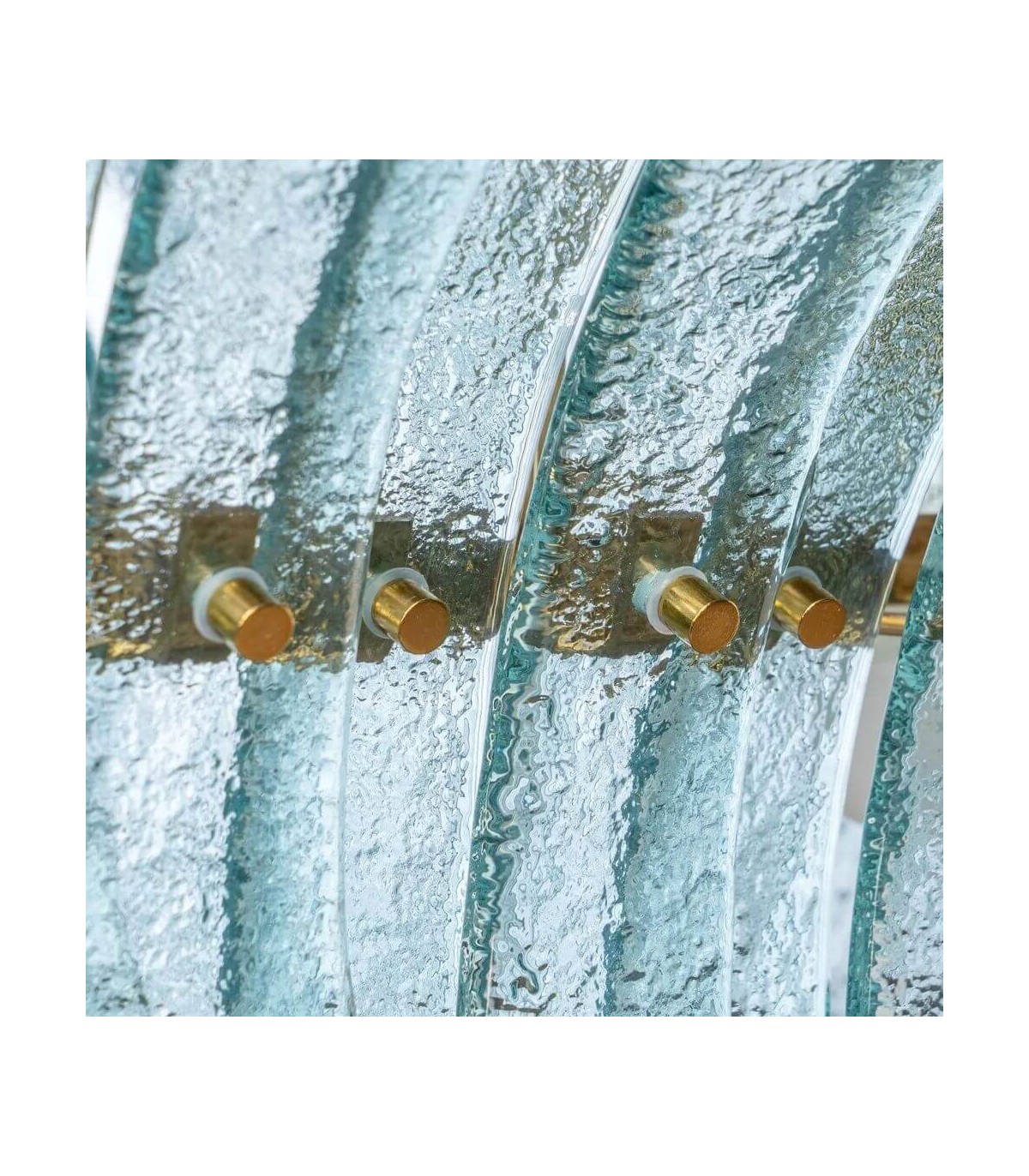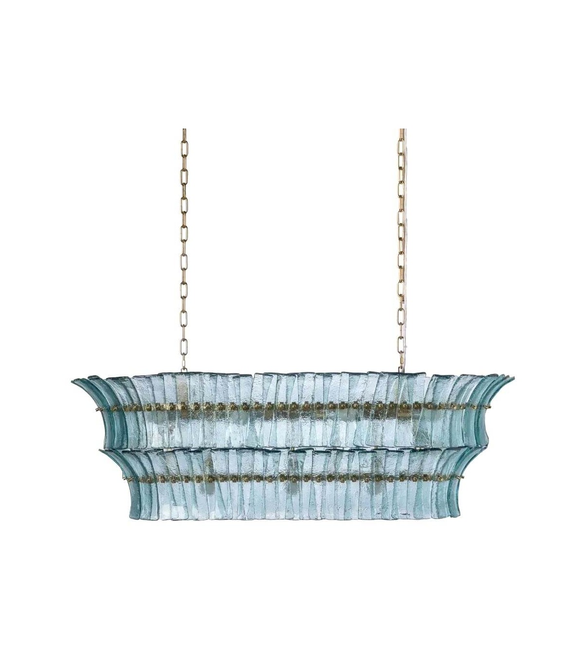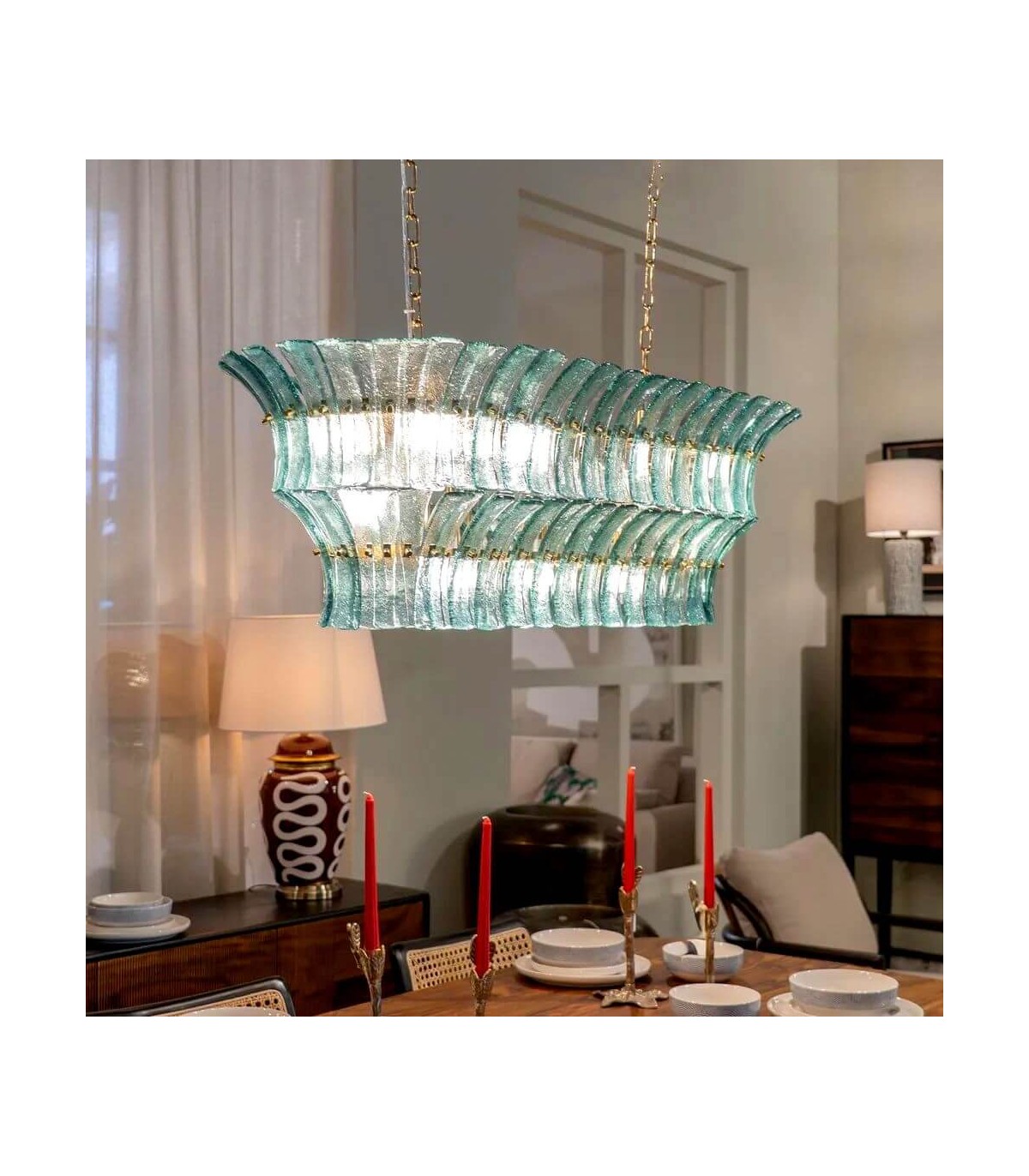 Esta lámpara de techo XL deslumbra con un diseño inspirado en el art decó que combina lujo y sofisticación en cada detalle. Sus piezas de cristal azul, trabajadas con un efecto translúcido, reflejan la luz con destellos elegantes y envolventes. La estructura metálica en dorado aporta brillo y contraste, creando un conjunto de gran impacto visual.