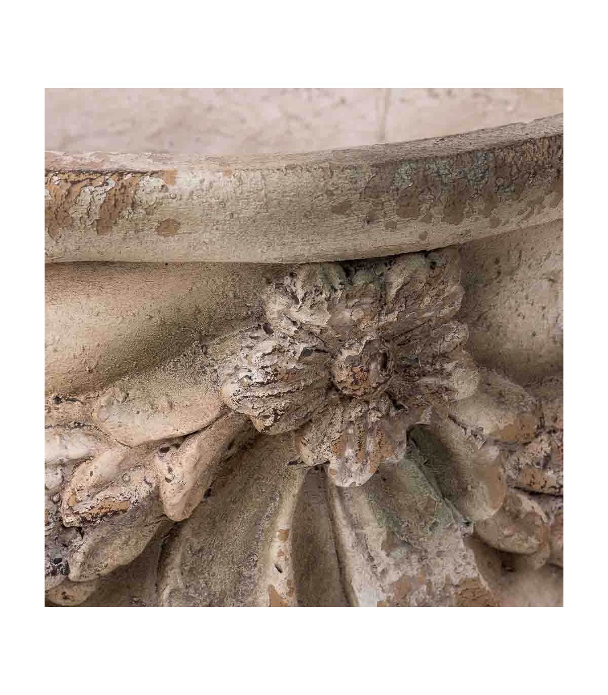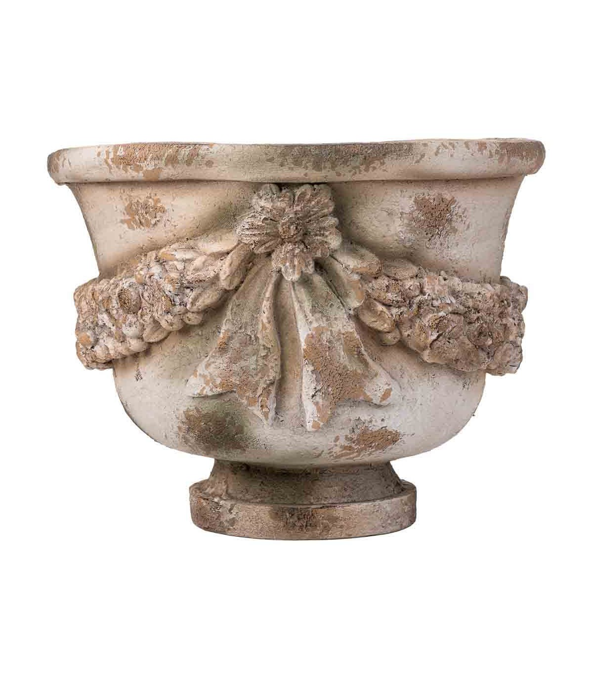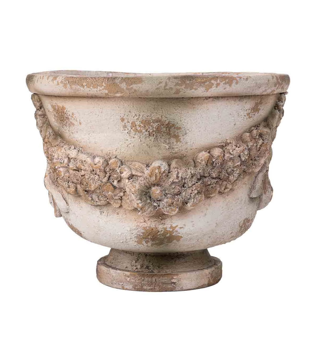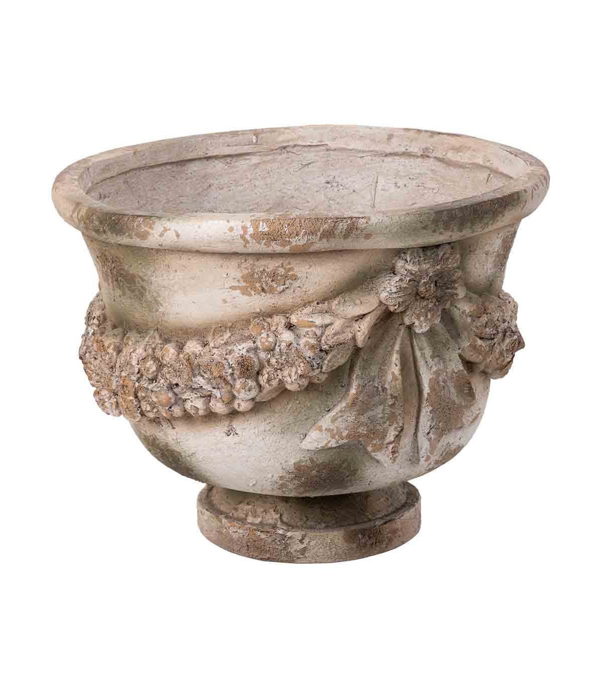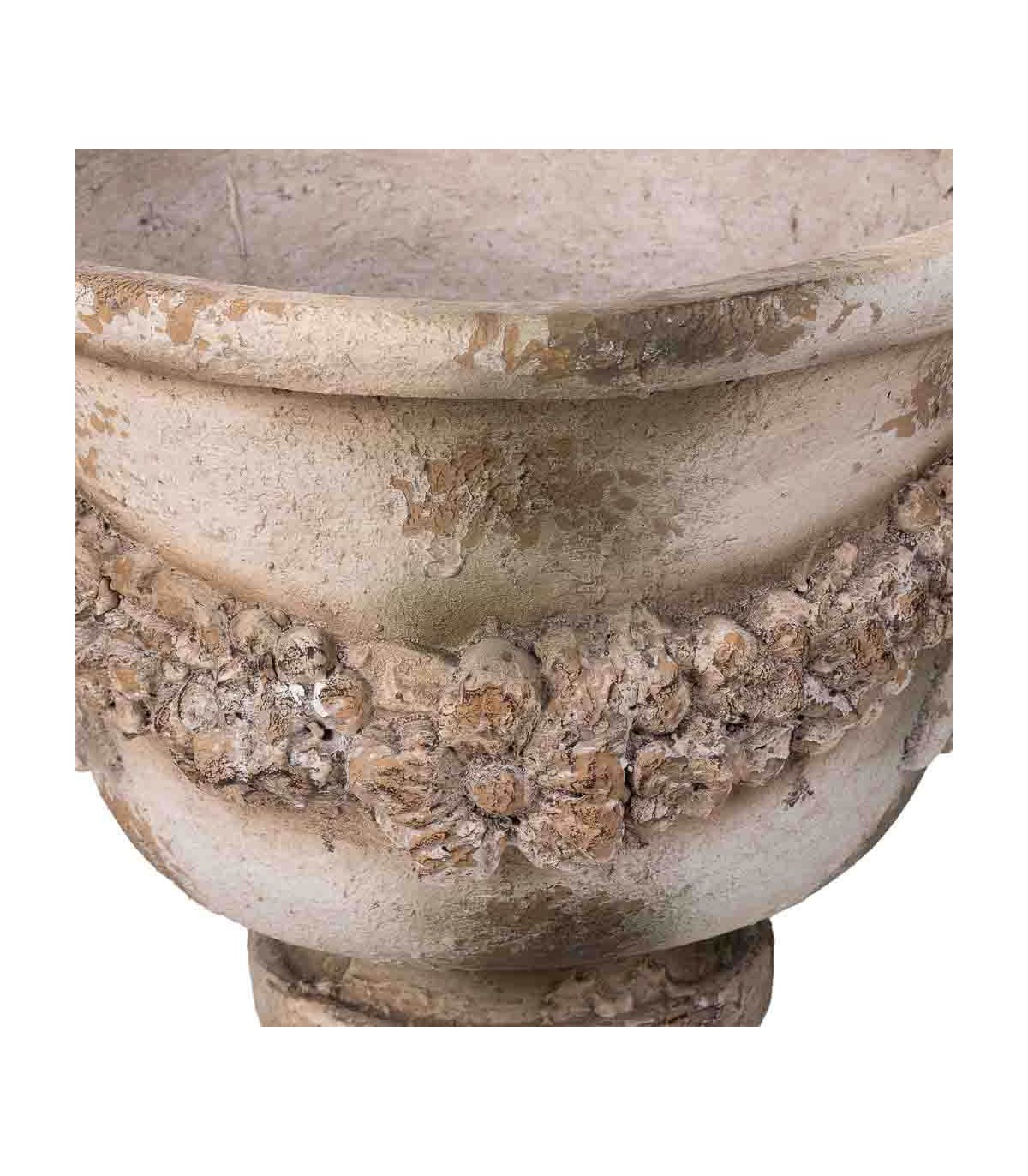 Este macetero decorativo de estilo clásico añade un toque distinguido tanto en interiores como en exteriores. Su diseño ornamentado con guirnaldas y flores en relieve transmite elegancia atemporal. Fabricado en magnesia de gran resistencia, ofrece un aspecto pétreo muy realista, imitando el desgaste natural del paso del tiempo.