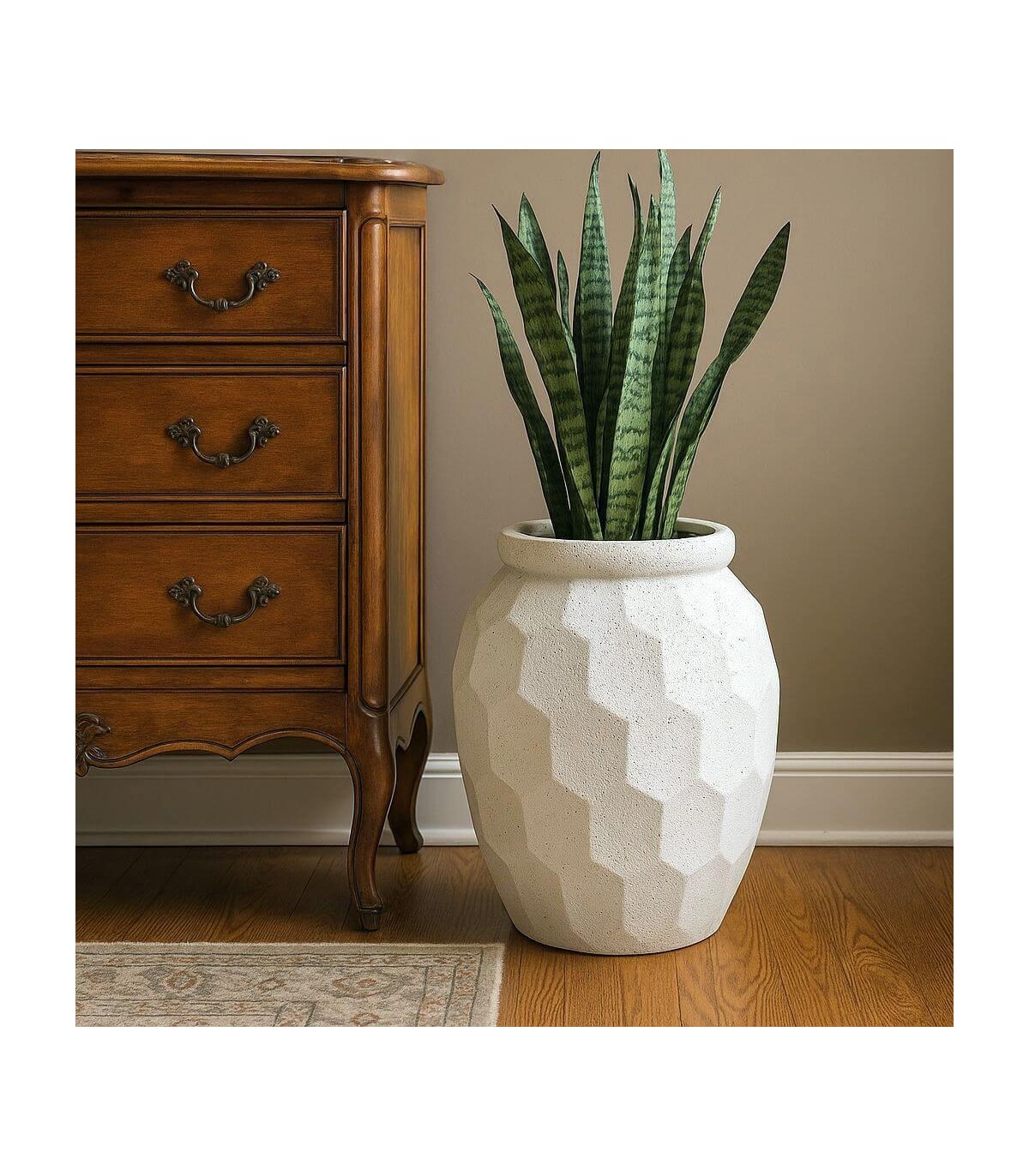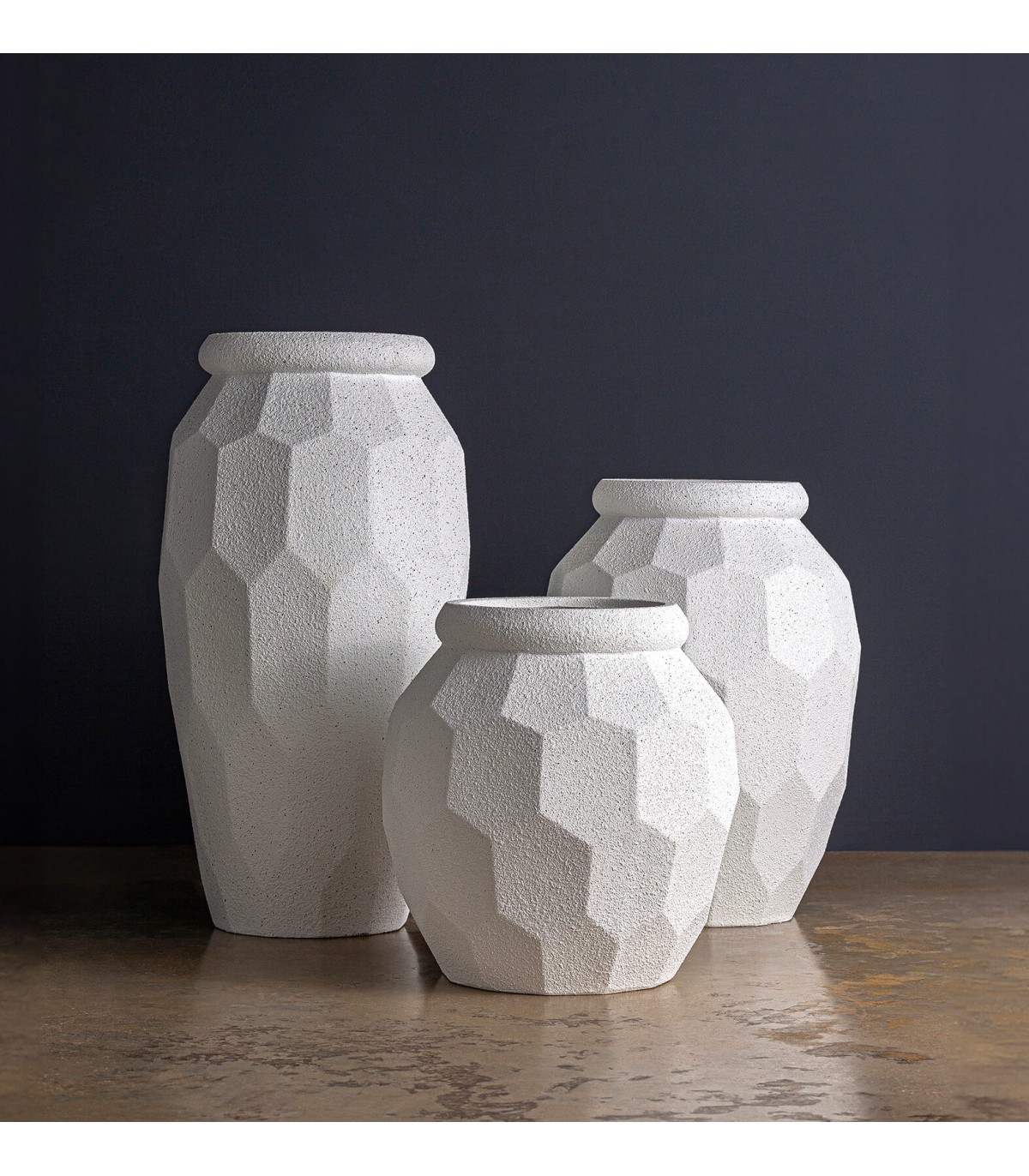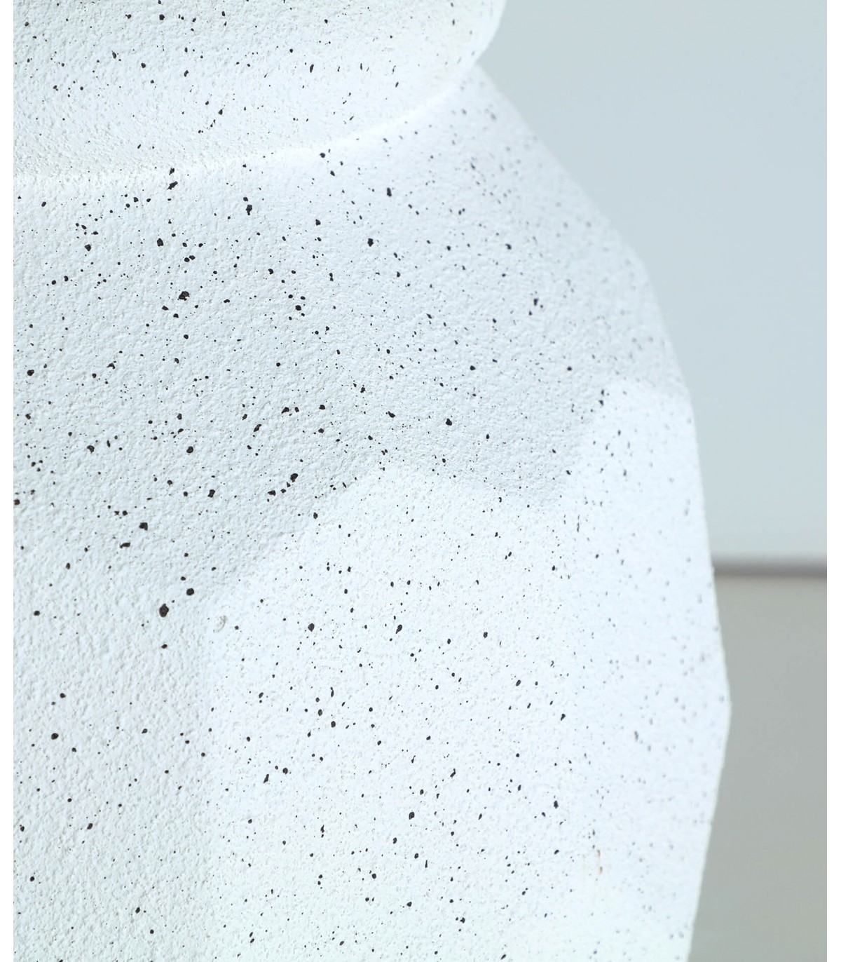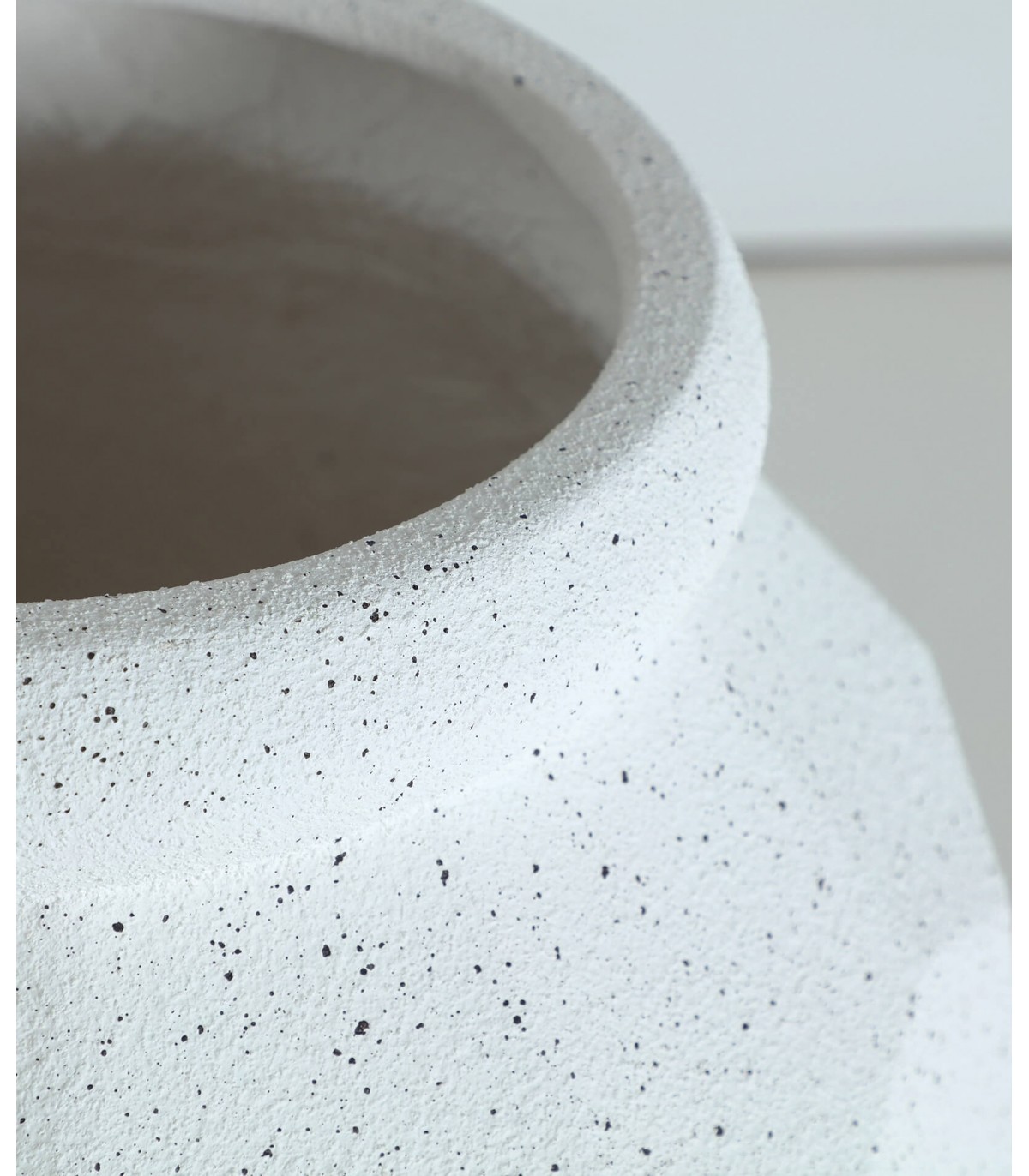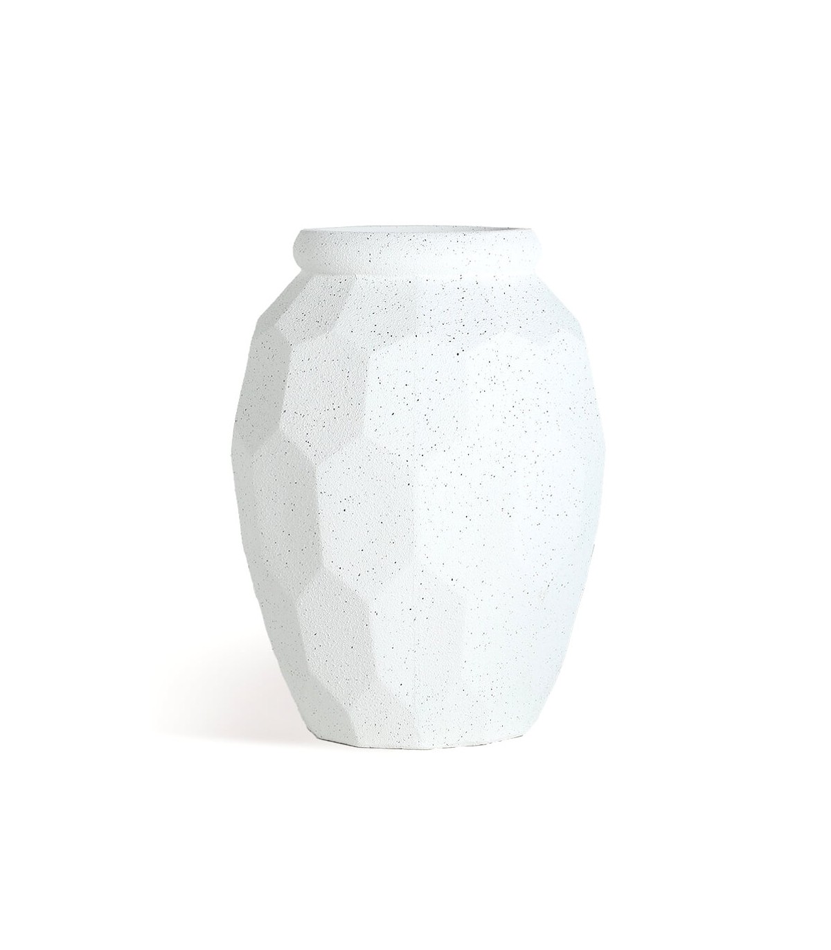 Este macetero de poli resina destaca por su diseño facetado de inspiración escultórica que juega con la luz y las sombras. Su textura rugosa y acabado blanco moteado le aportan un carácter decorativo muy actual, ideal para interiores minimalistas o ambientes exteriores protegidos.