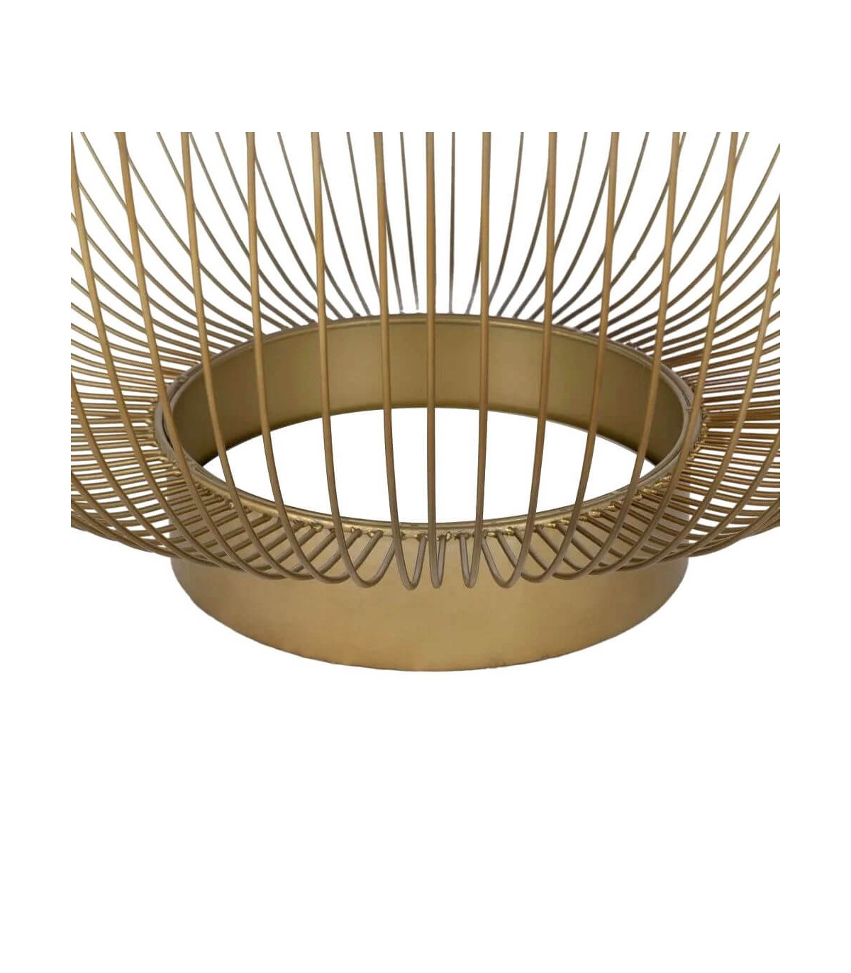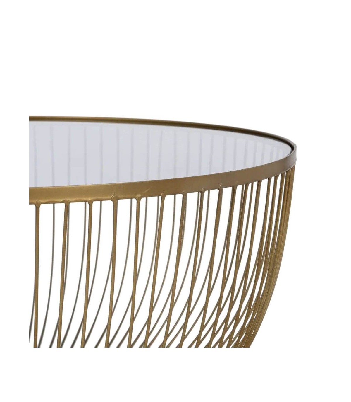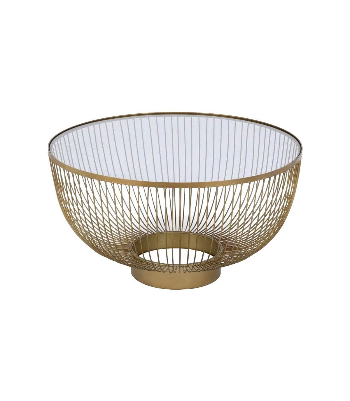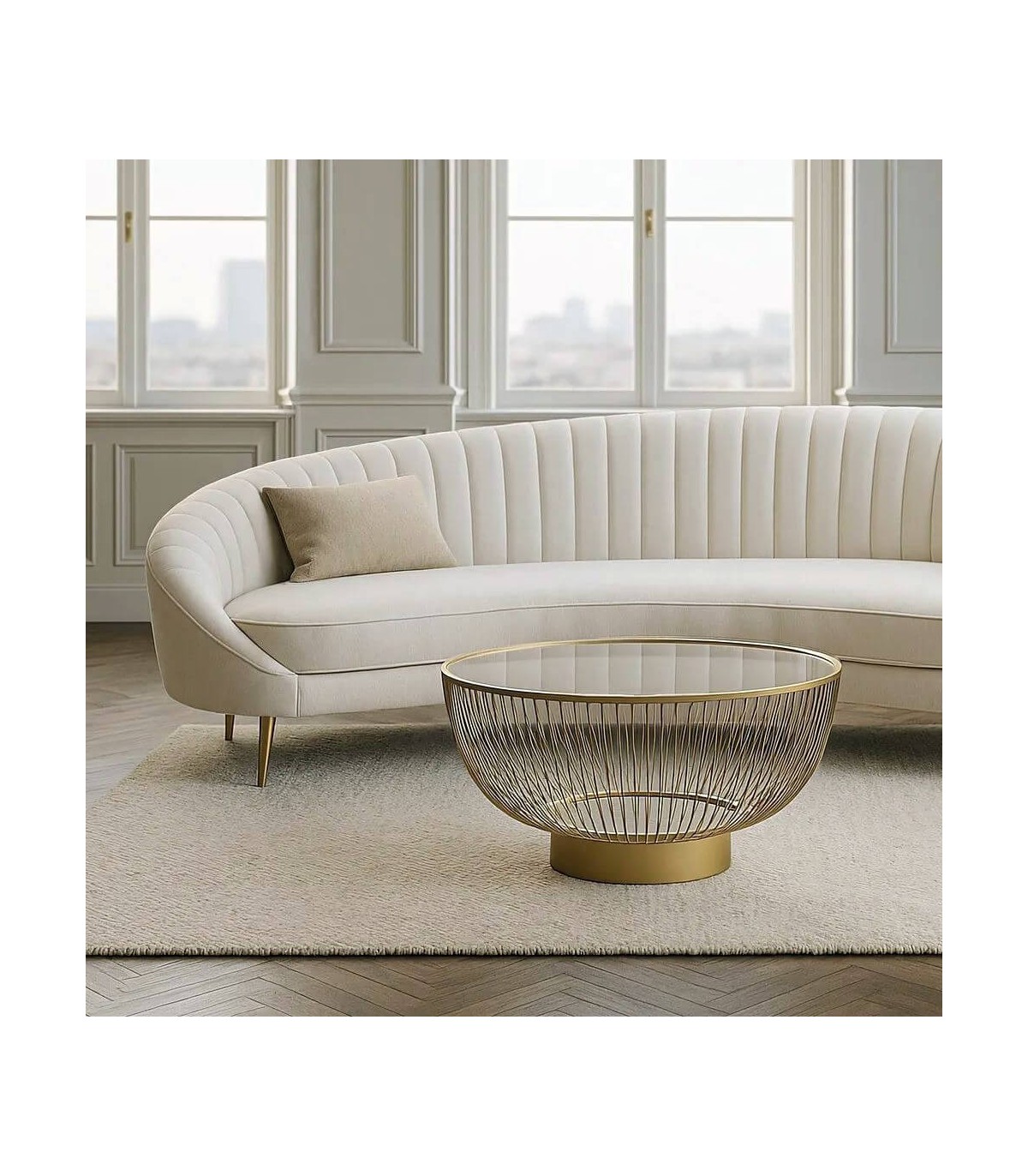 Una pieza elegante que combina diseño escultórico y líneas limpias. Esta mesa de centro redonda destaca por su estructura metálica en forma de copa, compuesta por finas varillas doradas que aportan ligereza visual sin renunciar a la presencia.