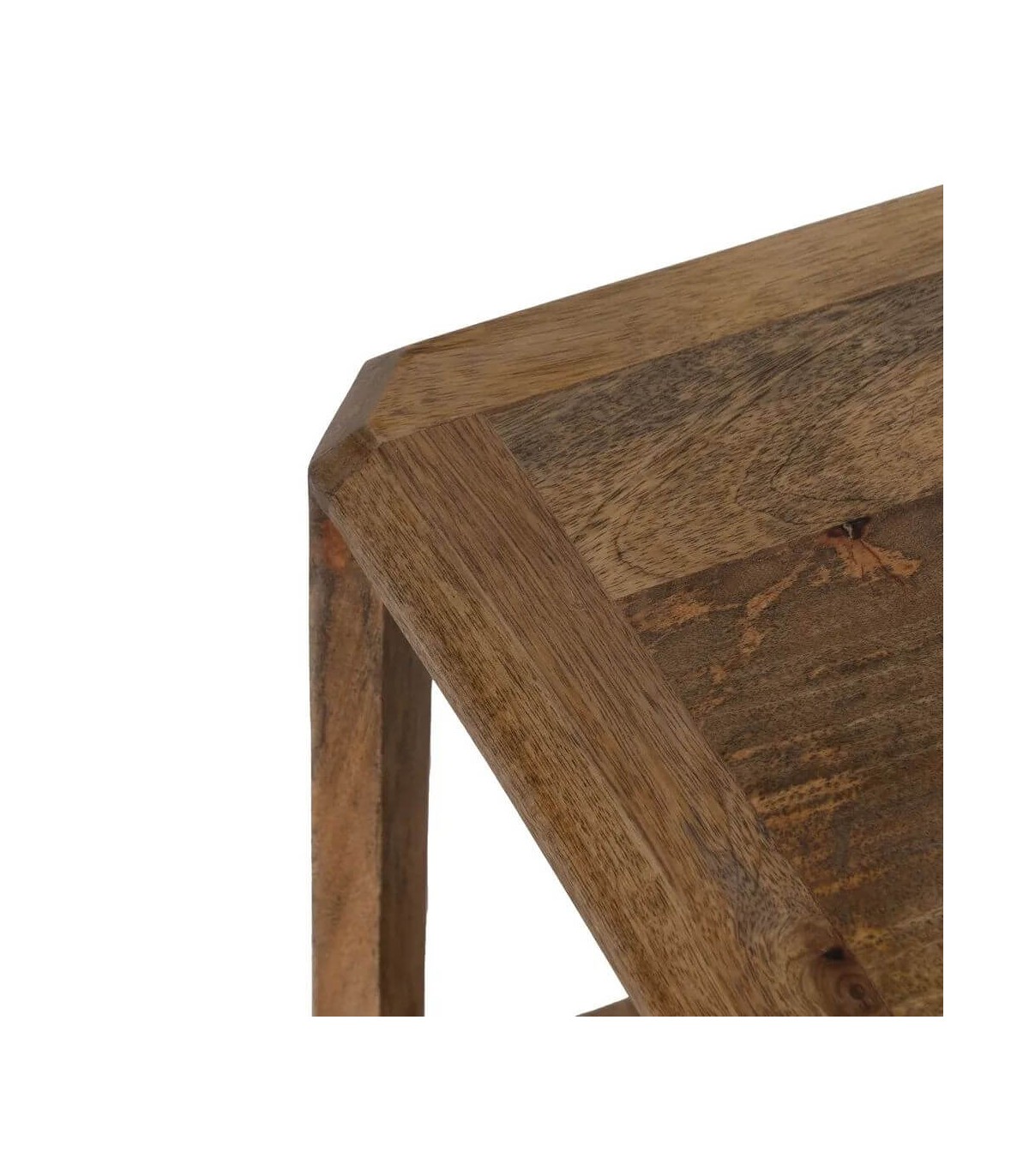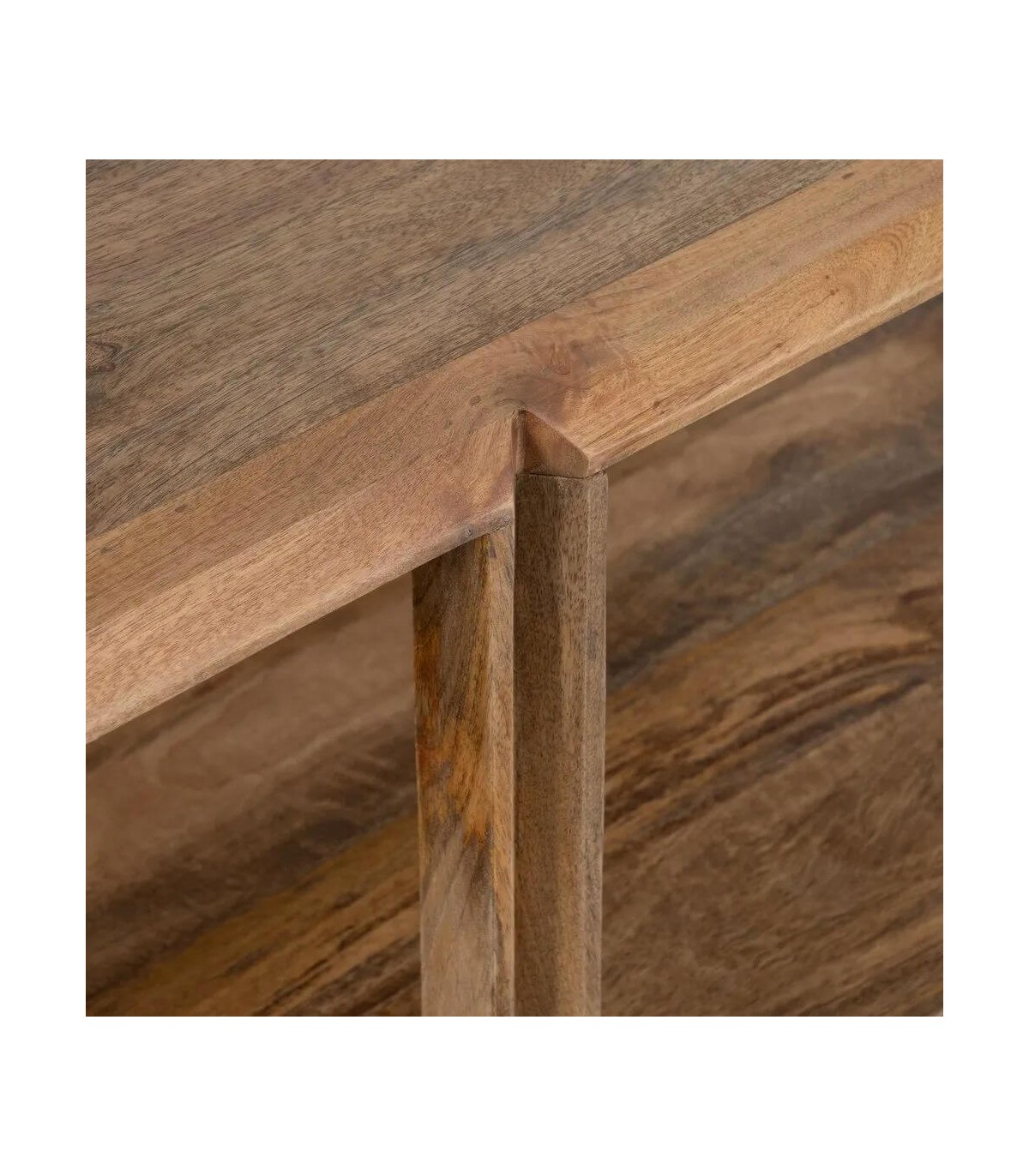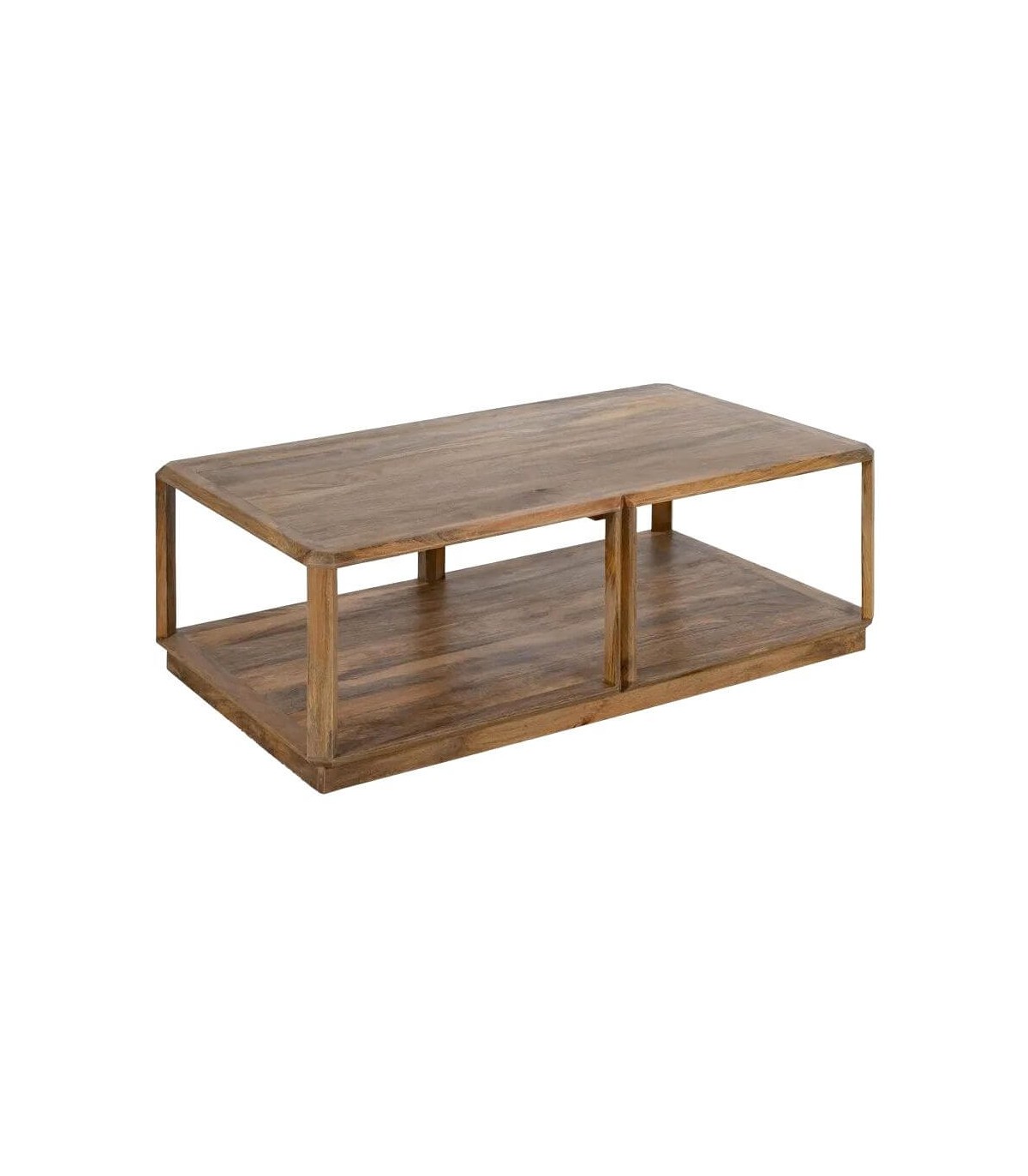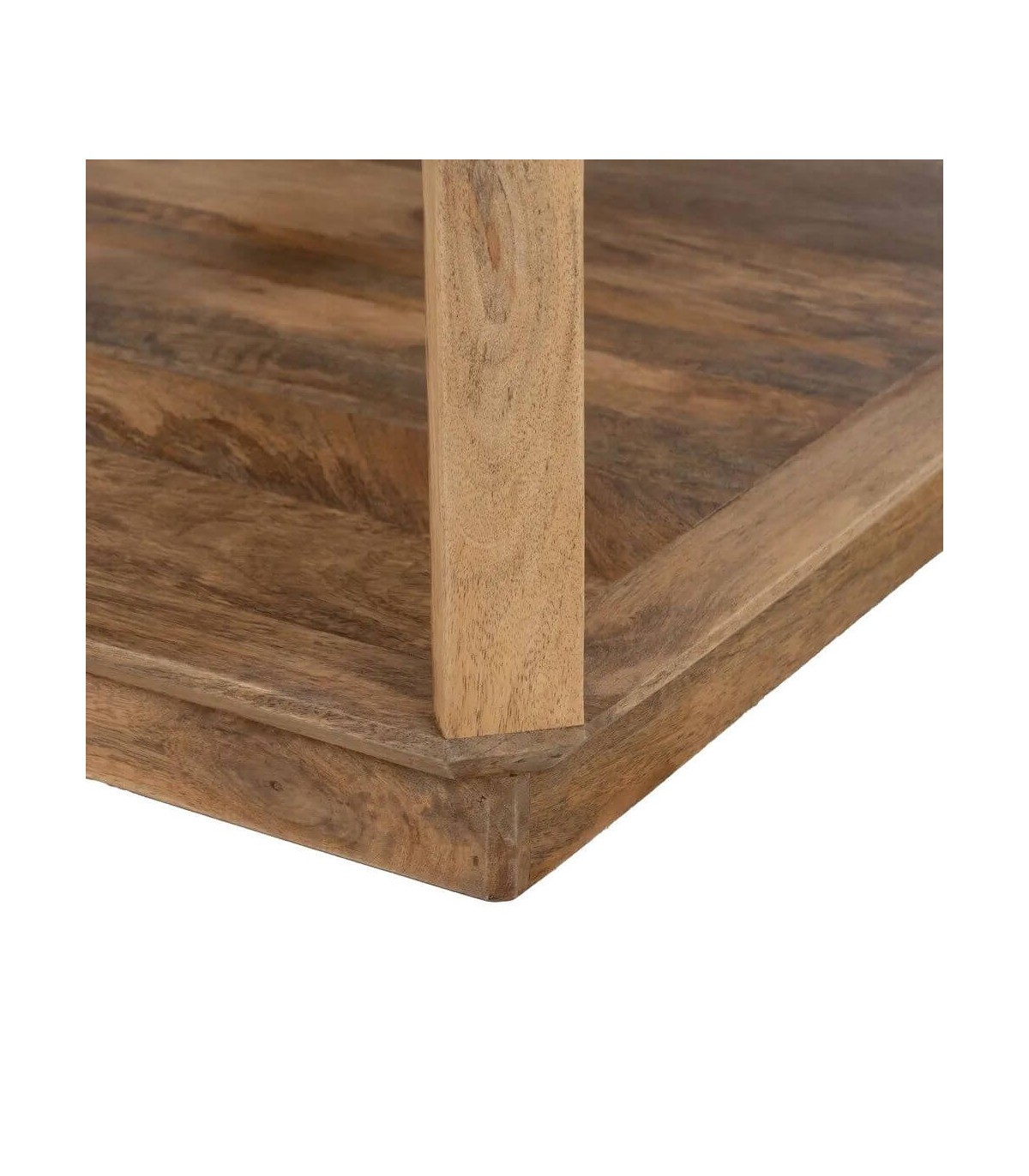 Esta mesa de centro destaca por su diseño robusto y líneas puras que evocan la calidez del estilo colonial. Fabricada en madera maciza de mango, ofrece una superficie amplia y una balda inferior ideal para organizar libros, revistas o decoración.