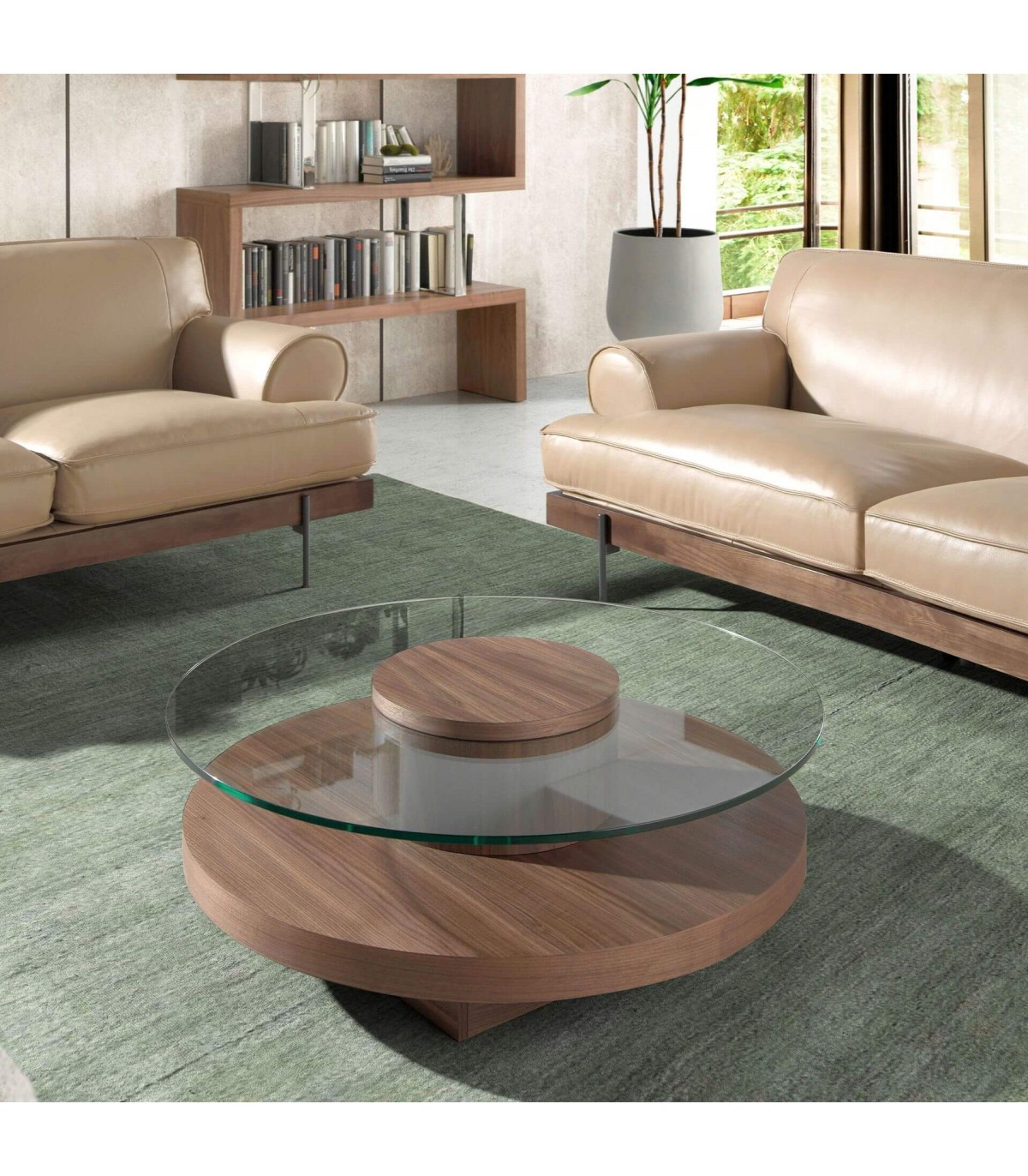 Esta mesa de centro redonda fusiona elegancia y funcionalidad en un diseño moderno y exclusivo. Fabricada en madera chapada en nogal con un acabado natural cálido y refinado, incorpora una superficie en cristal templado de 1,2 cm de grosor, que aporta ligereza visual y sofisticación.