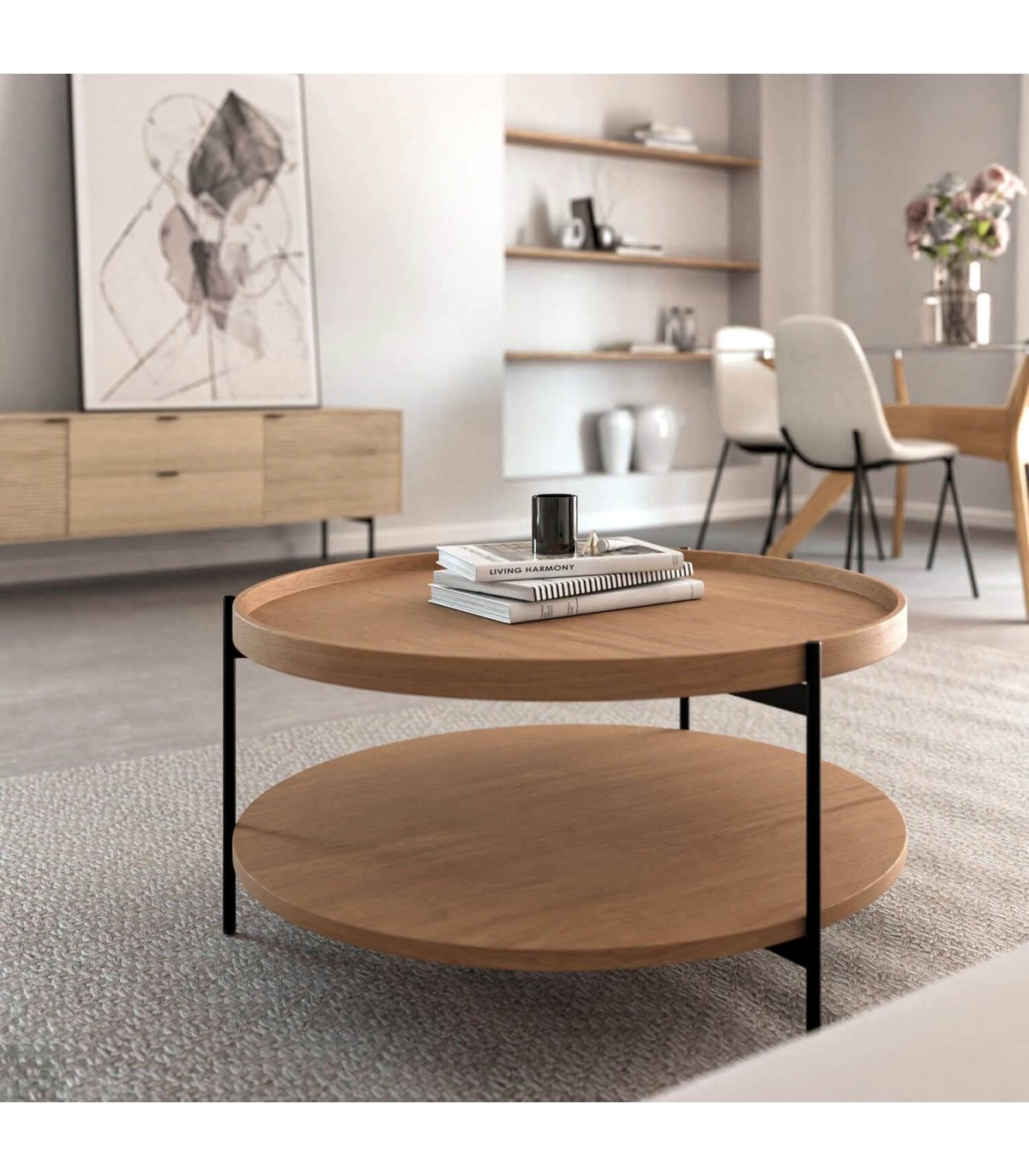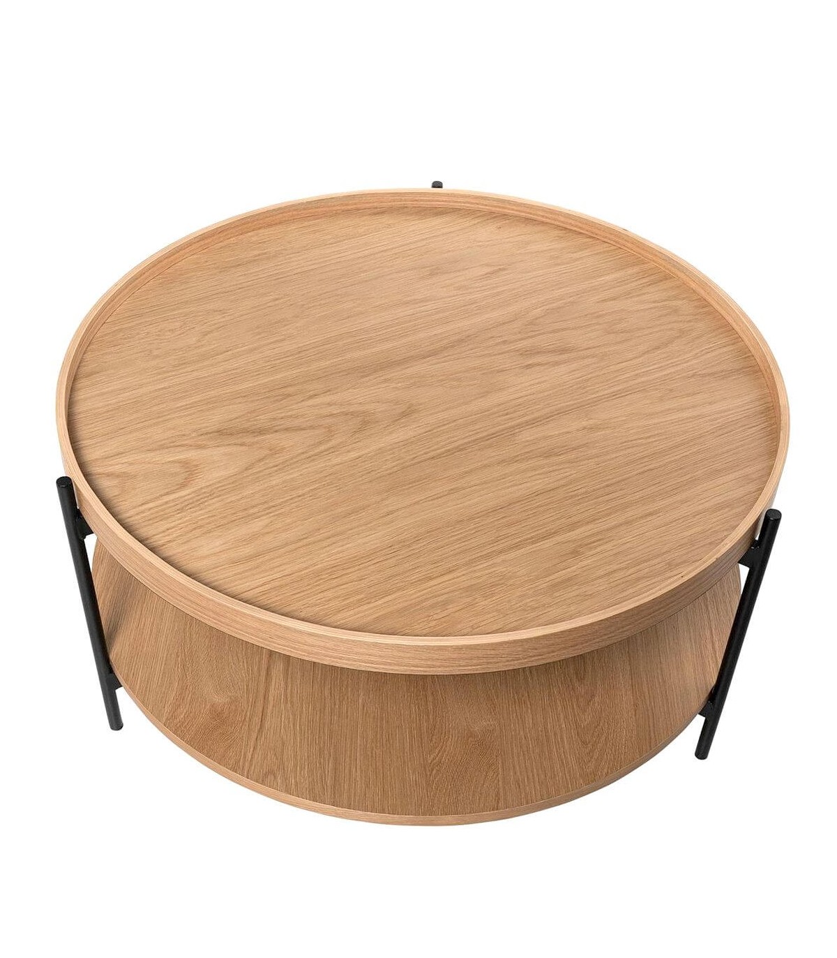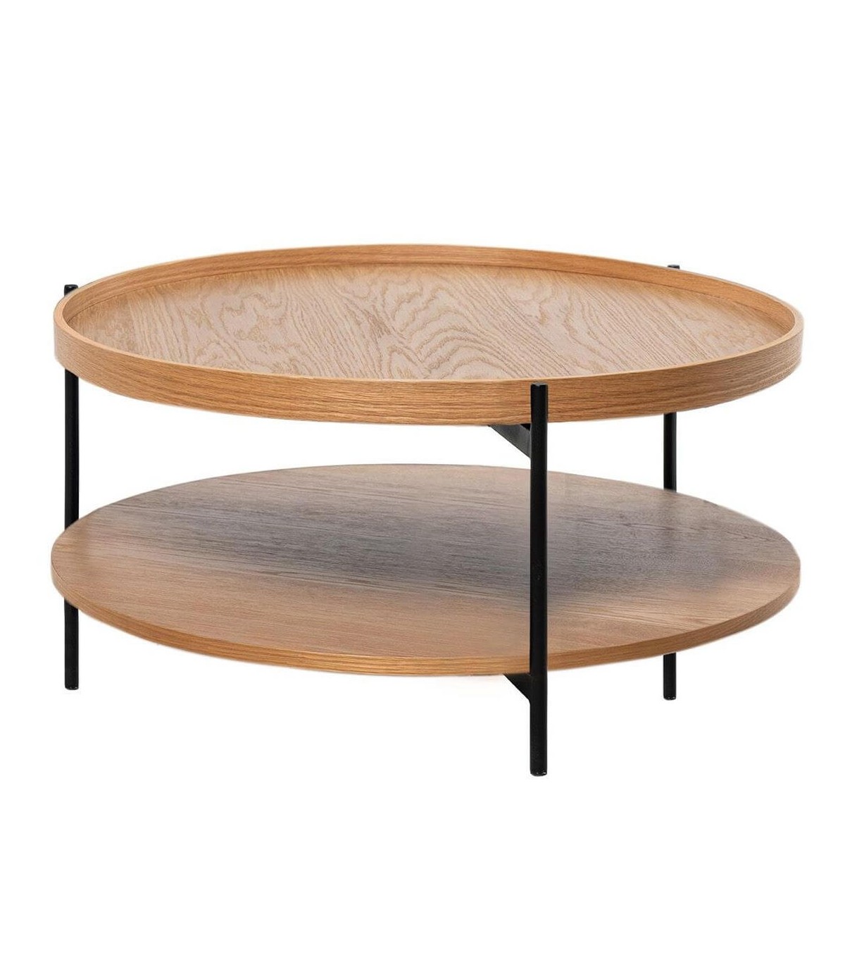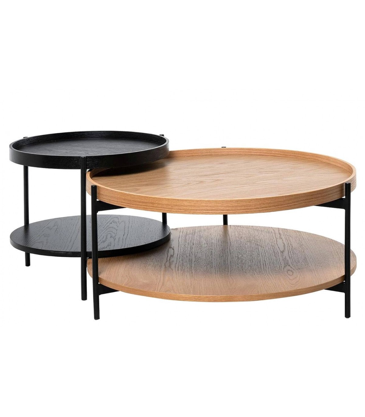 Esta mesa de centro redonda combina la calidez del roble natural con la sobriedad del metal negro en una pieza funcional y elegante. Su diseño de líneas limpias incluye dos superficies circulares que amplían el espacio de uso sin recargar el ambiente.