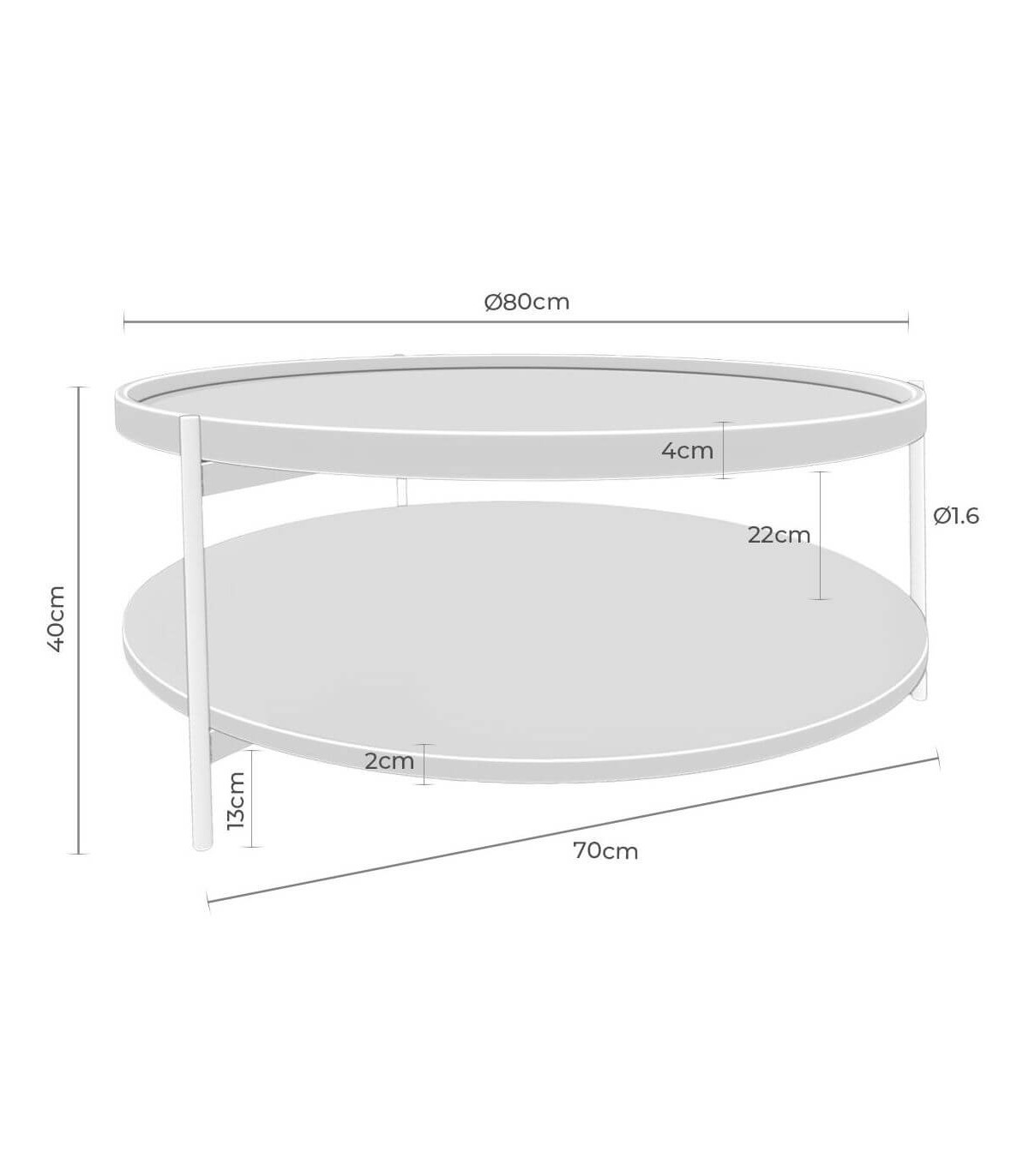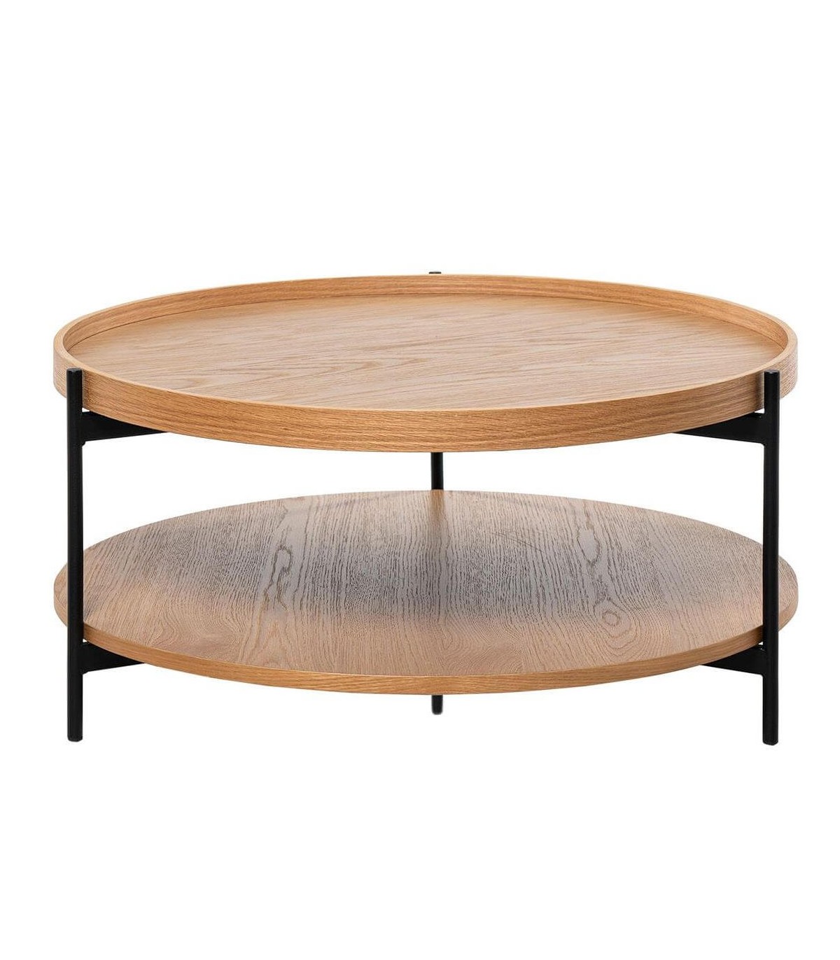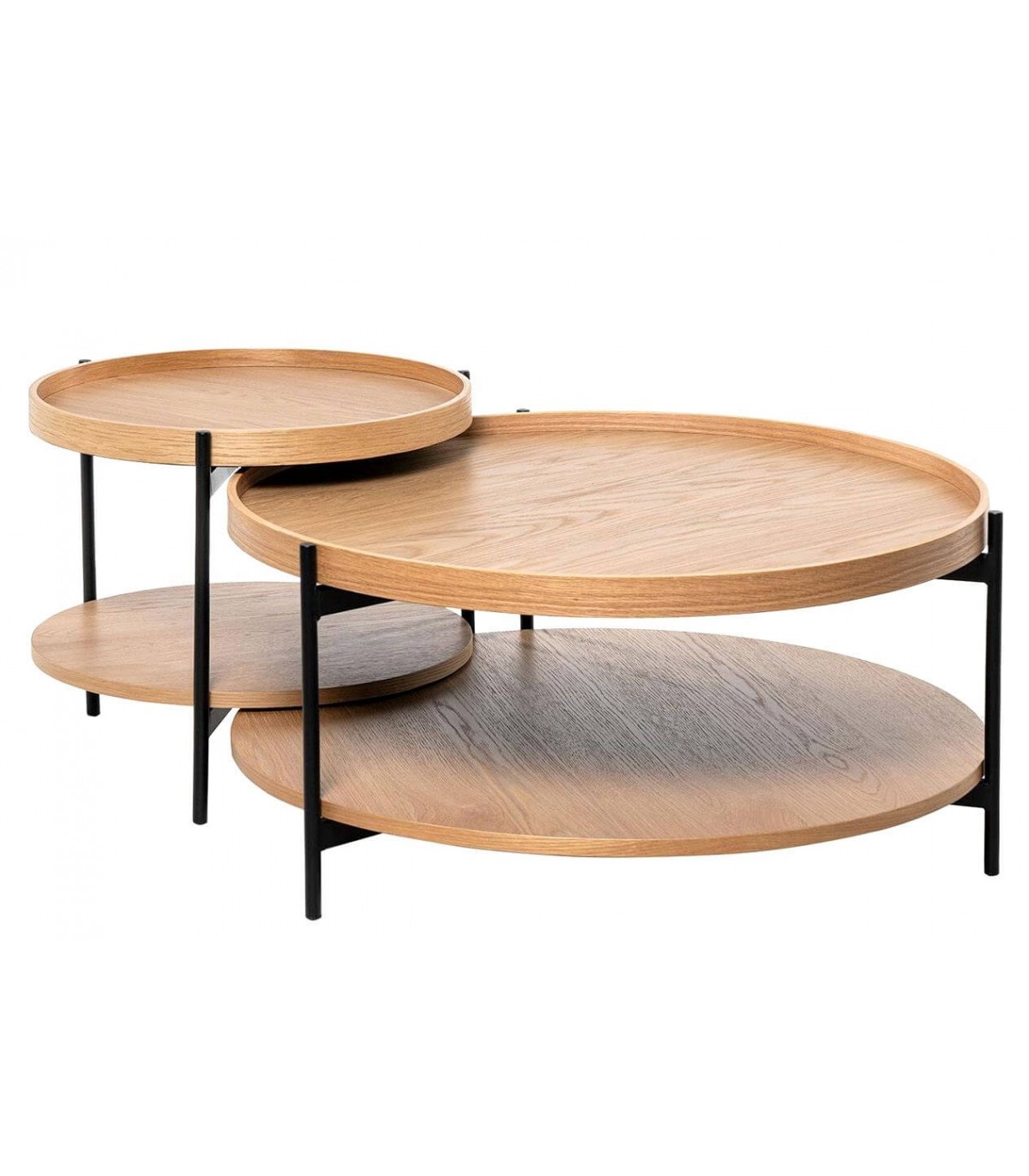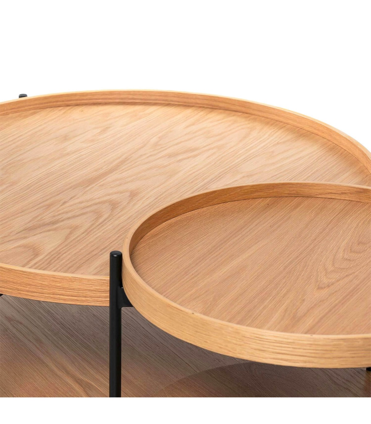Esta mesa de centro redonda combina la calidez del roble natural con la sobriedad del metal negro en una pieza funcional y elegante. Su diseño de líneas limpias incluye dos superficies circulares que amplían el espacio de uso sin recargar el ambiente.