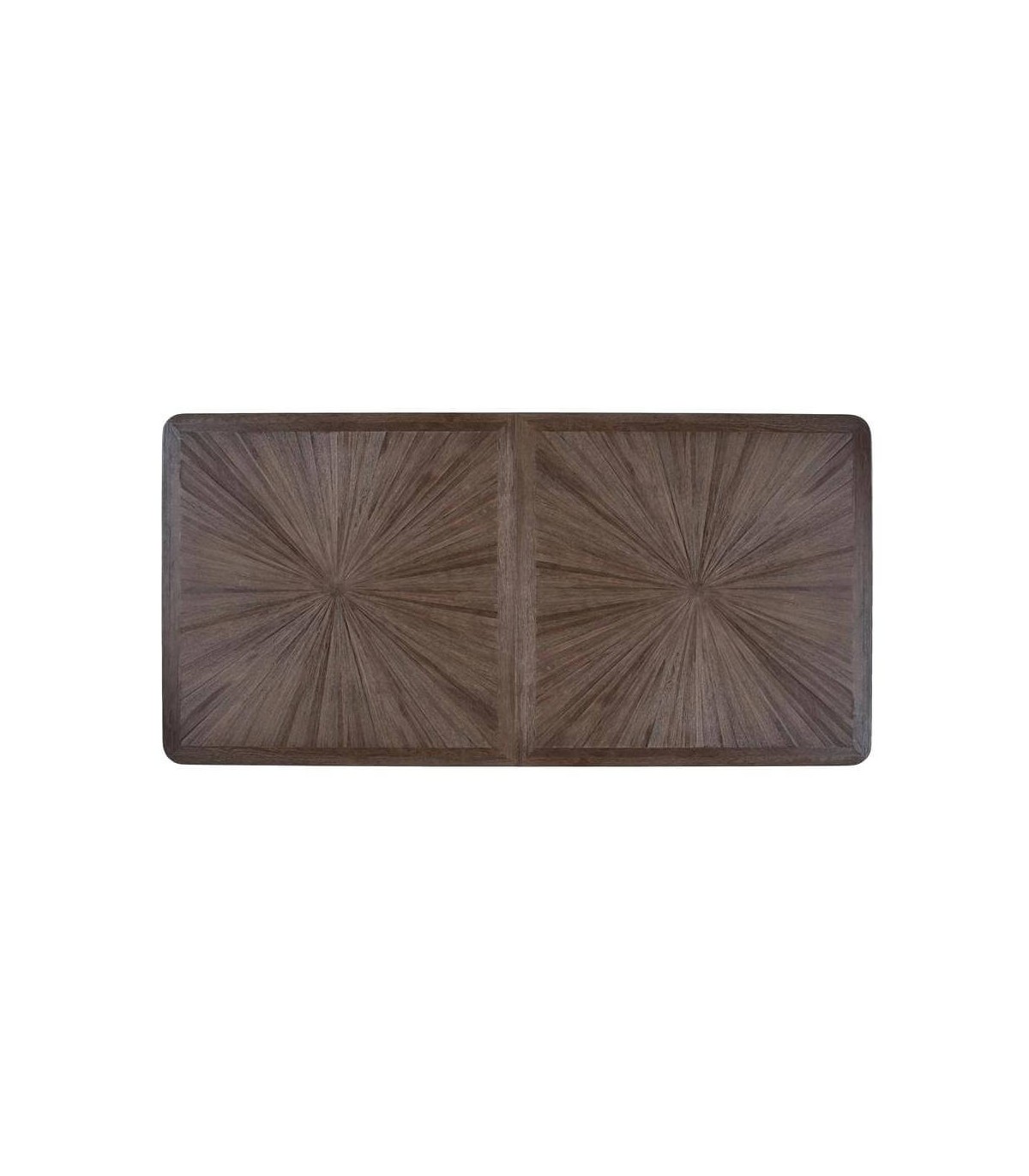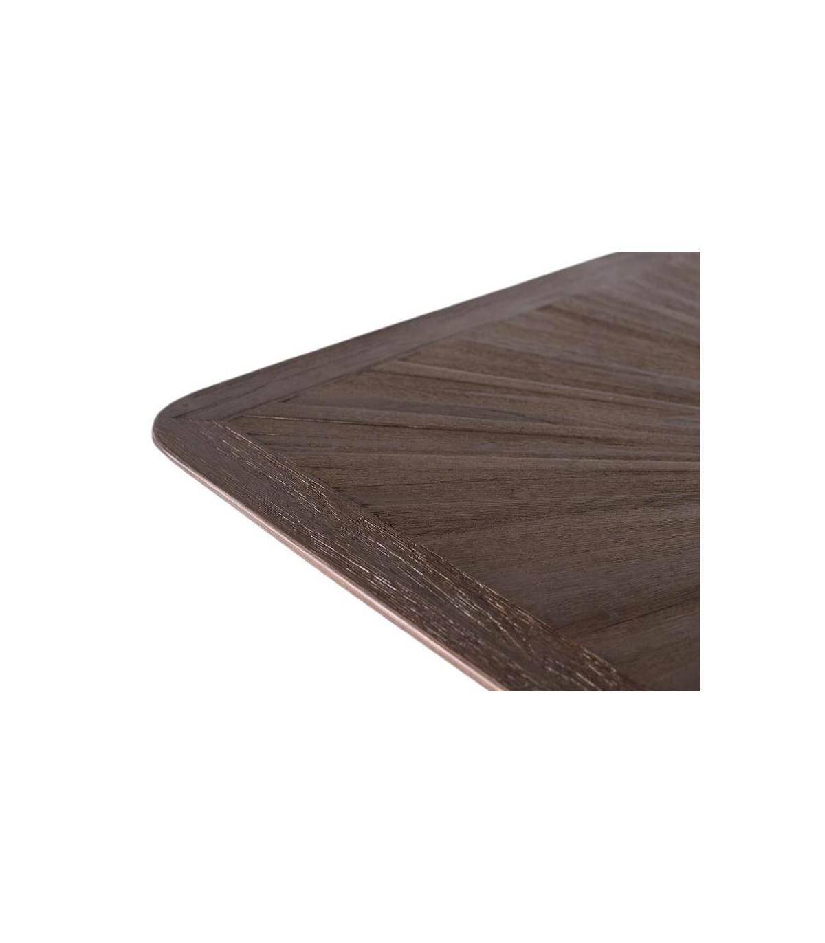 Esta mesa de comedor rectangular destaca por su elegante diseño industrial que combina madera maciza de teca reciclada teñida en color nogal con un acabado plumado que resalta la belleza natural de la madera.