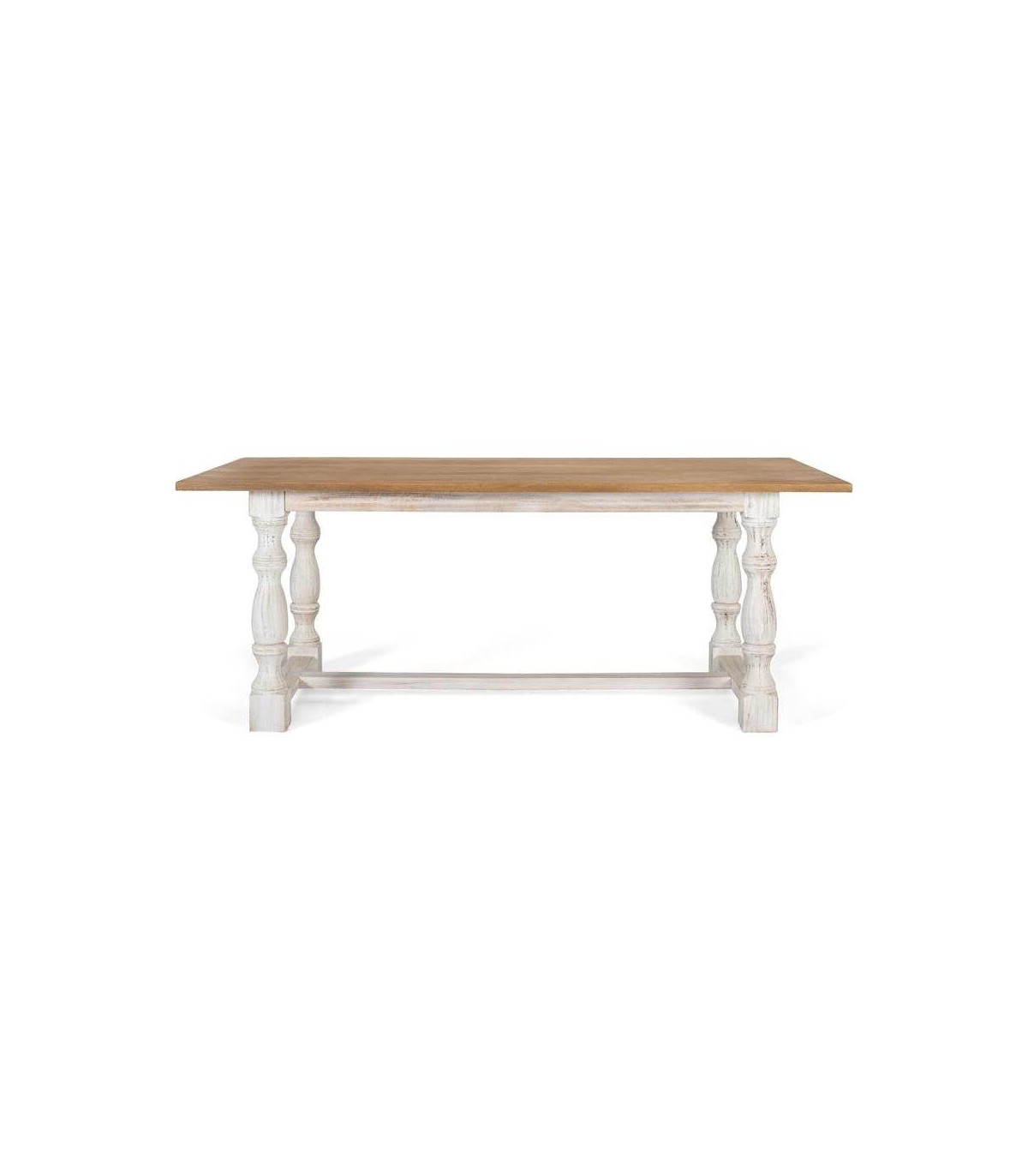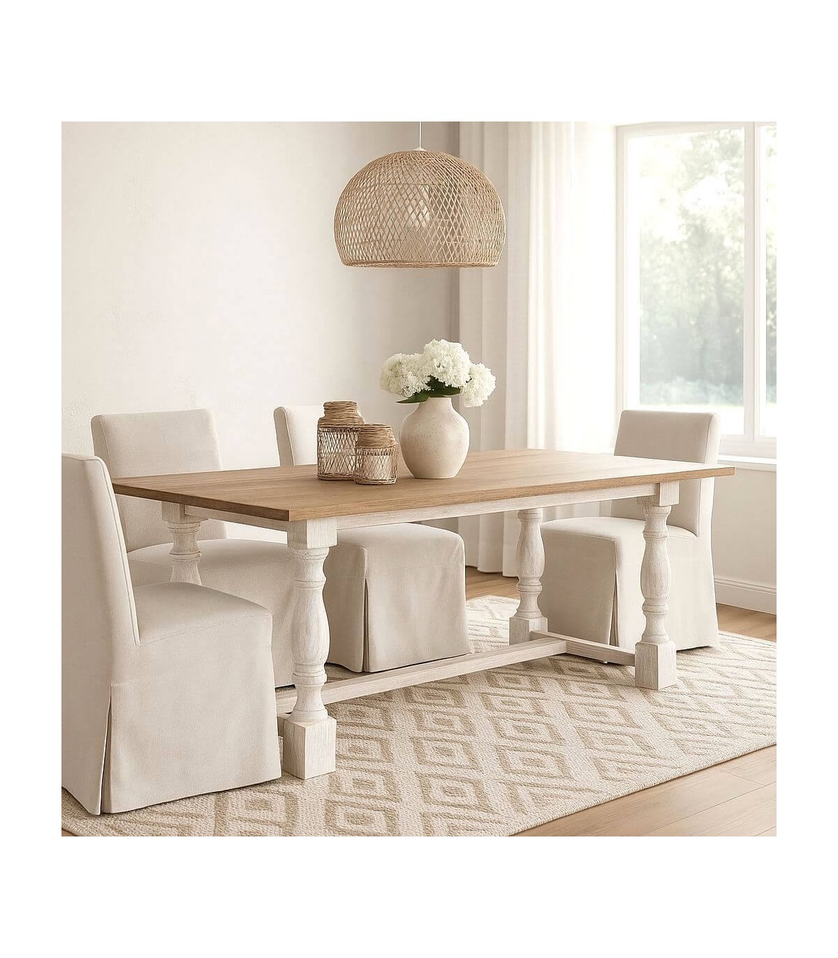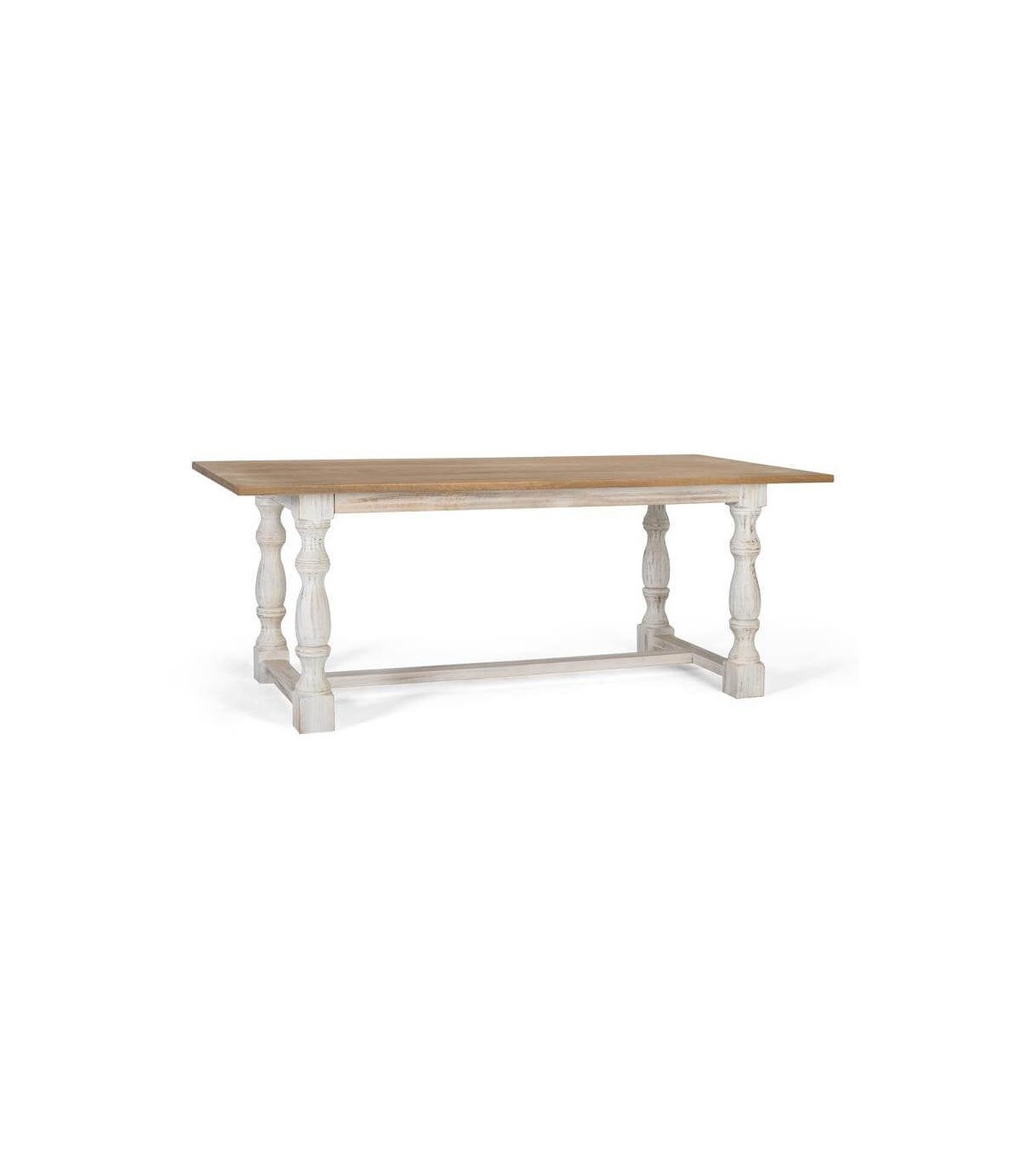 Elegante y robusta, esta mesa de comedor XL combina una amplia tapa de madera maciza de mango con una estructura de patas torneadas en blanco rozado. Su diseño recupera el encanto de lo artesanal con un aire rústico refinado que aporta carácter sin sobrecargar.