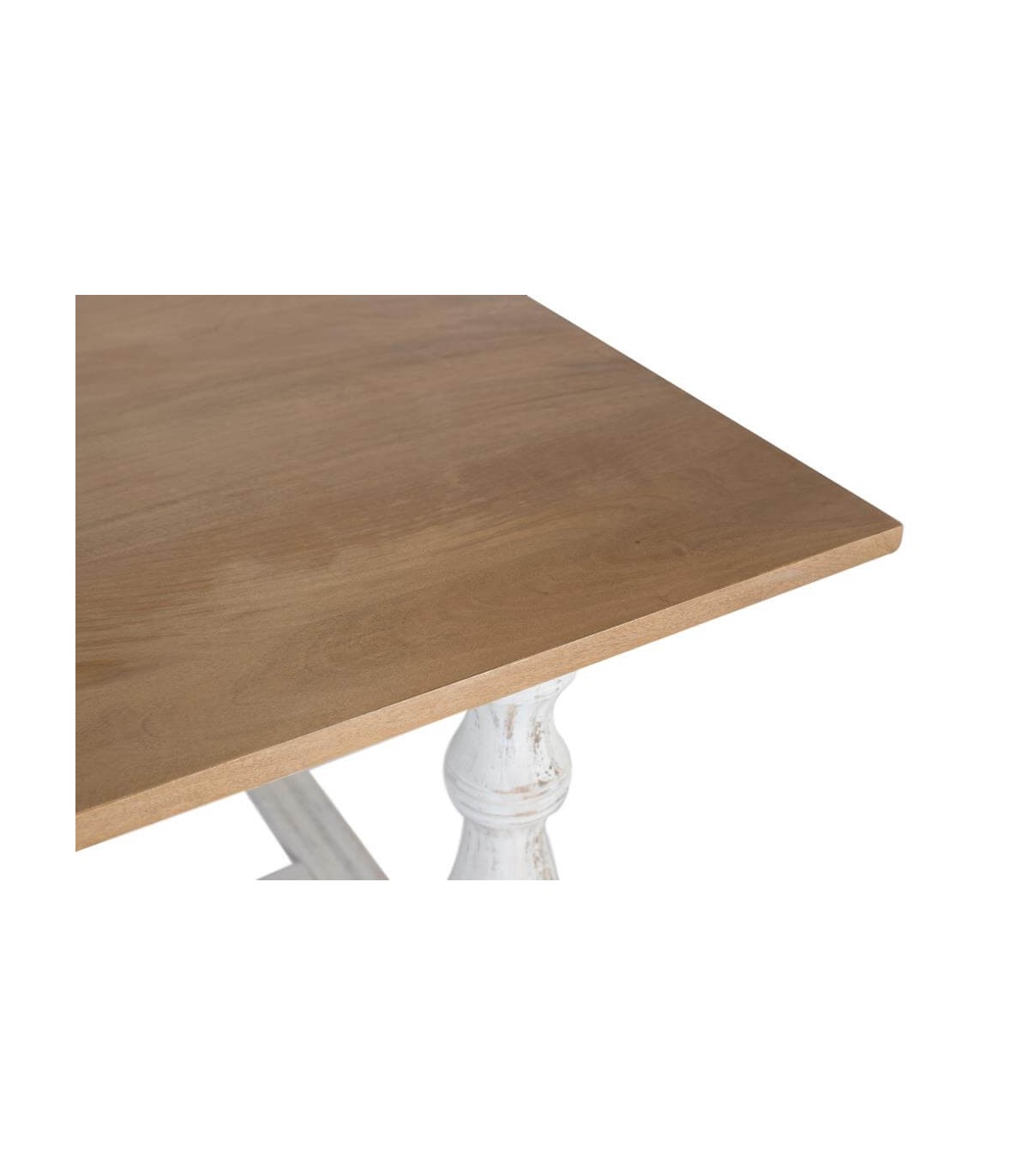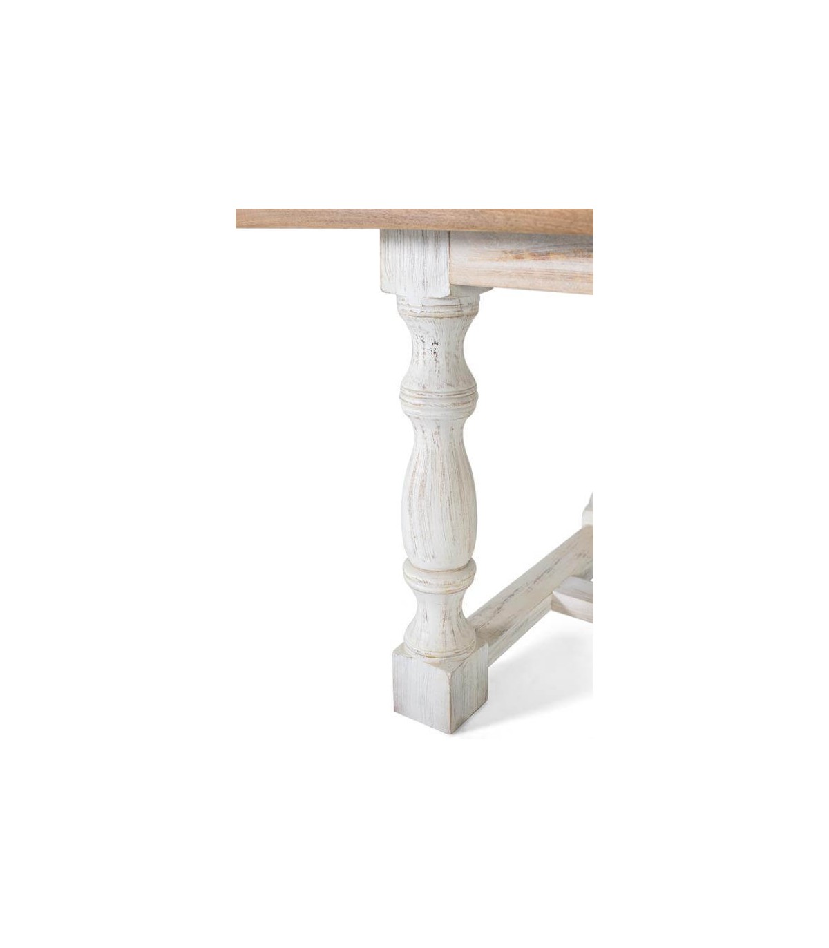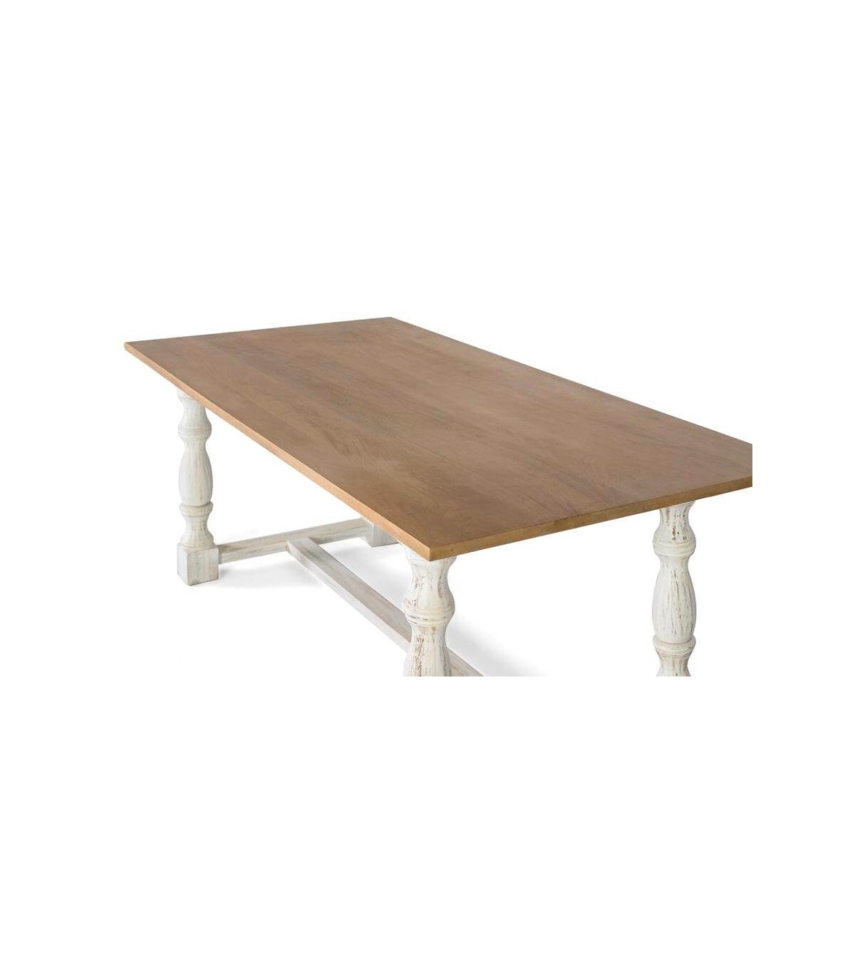 Elegante y robusta, esta mesa de comedor XL combina una amplia tapa de madera maciza de mango con una estructura de patas torneadas en blanco rozado. Su diseño recupera el encanto de lo artesanal con un aire rústico refinado que aporta carácter sin sobrecargar.