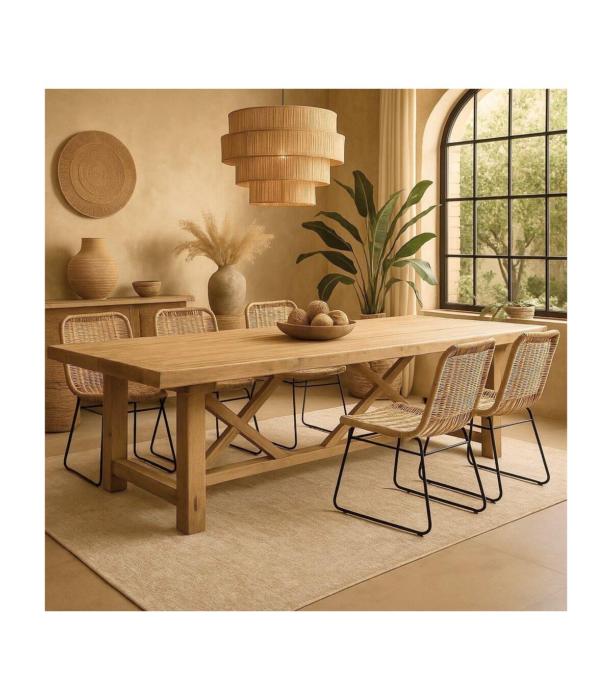 Su estructura con cruces laterales aporta un aire campestre y relajado, ideal para espacios abiertos, acogedores y con esencia slow. Perfecta para grandes reuniones familiares o momentos compartidos, invita a vivir el presente con calma y estilo. Una mesa con carácter que hace del comedor el verdadero corazón del hogar.