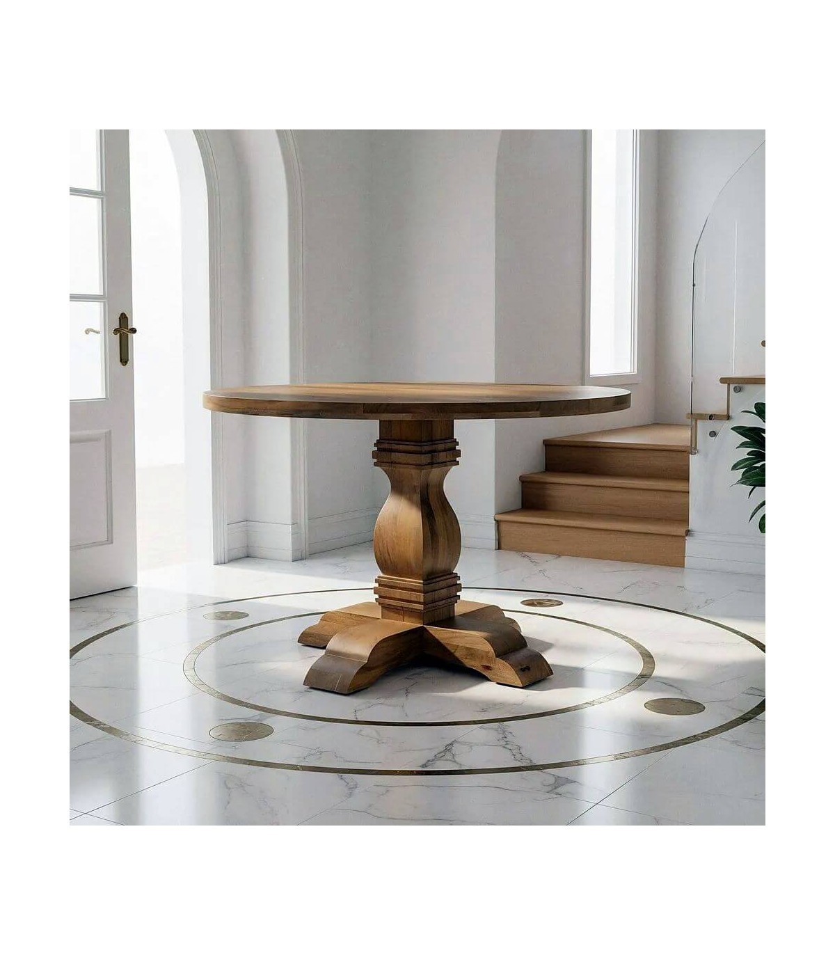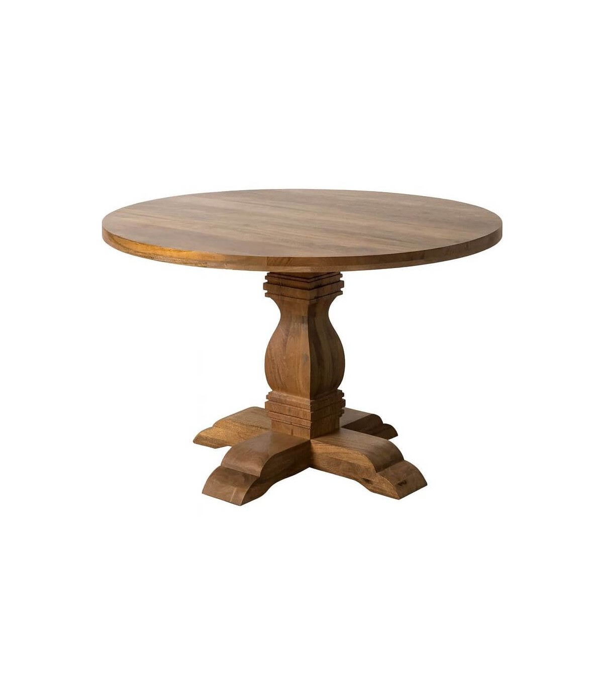 Esta mesa redonda de aire colonial combina sobriedad clásica con una presencia escultórica que transforma cualquier espacio. Su estructura maciza de mango y el trabajado pedestal central evocan la artesanía tradicional con un acabado cálido y sereno. Ideal para comedores que buscan equilibrio, armonía y una nota de distinción atemporal.