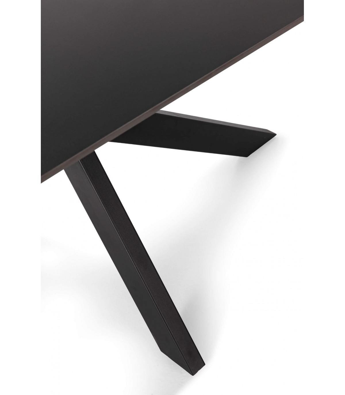 Mesa de comedor rectangular fija con sobre de cerámica negra y estructura de metal con patas cruzadas en forma de aspa. Su diseño minimalista, elegante y moderno ofrece un toque sobrio y actual al comedor, combinando funcionalidad con un estilo muy marcado. La base metálica aporta estabilidad, mientras que el sobre cerámico es resistente y fácil de limpiar.