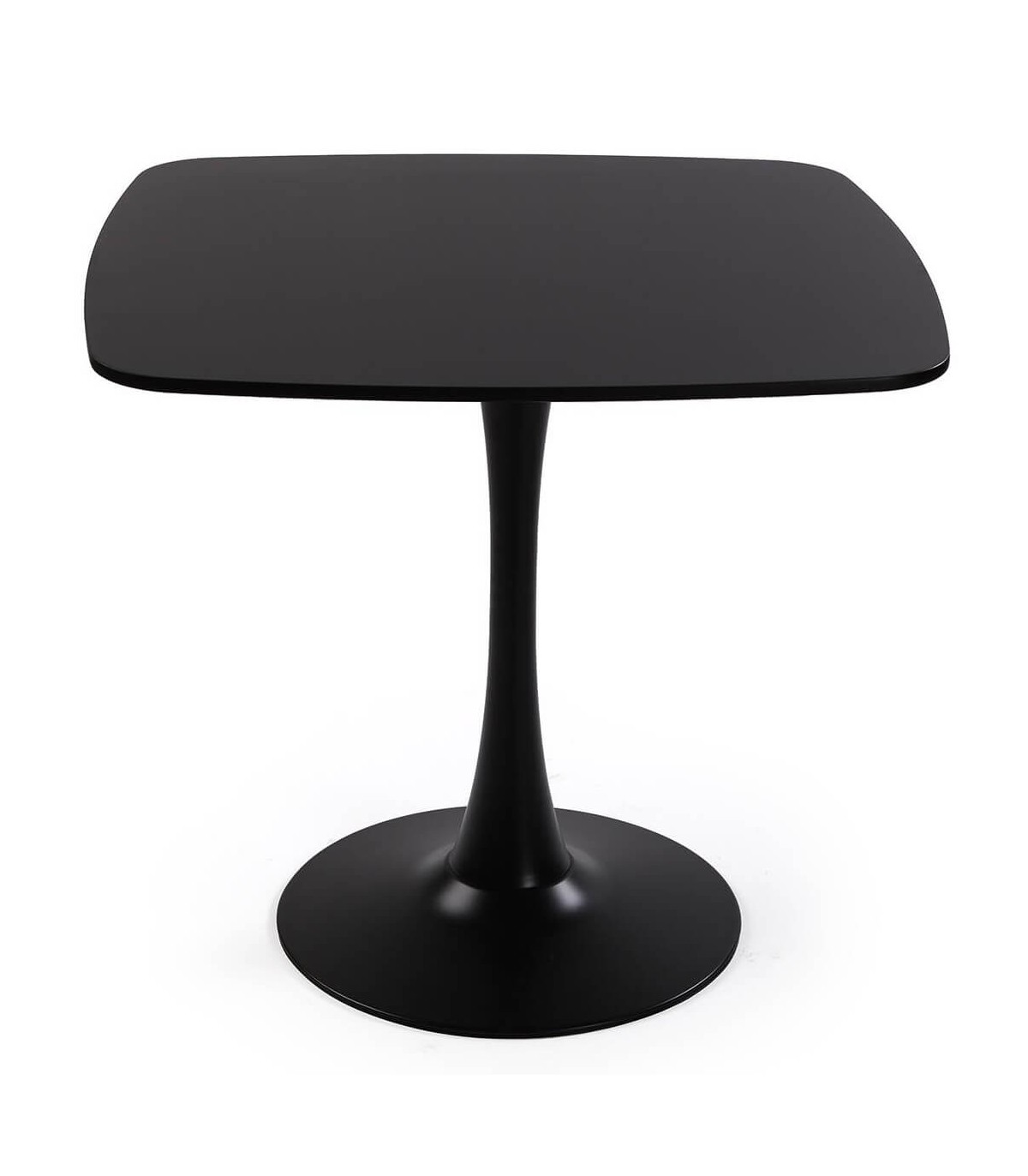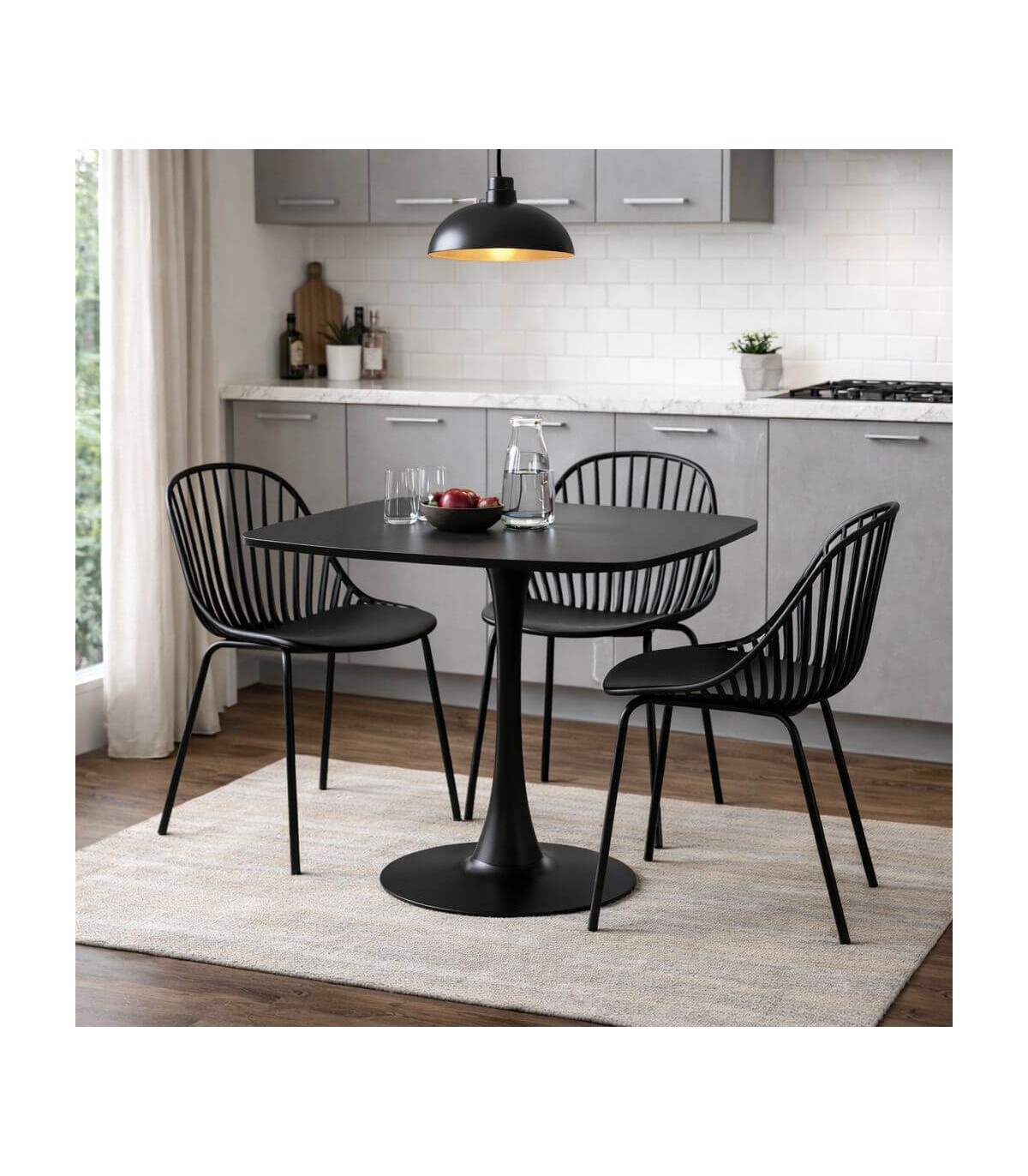 El sobre en madera MDF ofrece una superficie práctica para el uso diario y el mantenimiento sencillo. El acabado negro unifica el conjunto y aporta un look sobrio, actual y fácil de combinar con sillas distintas. Pieza ideal para crear un comedor funcional y elegante en espacios reducidos.