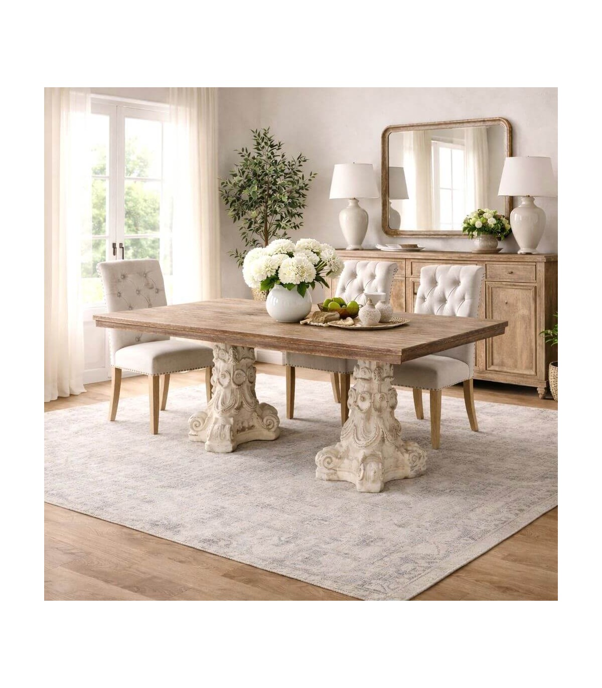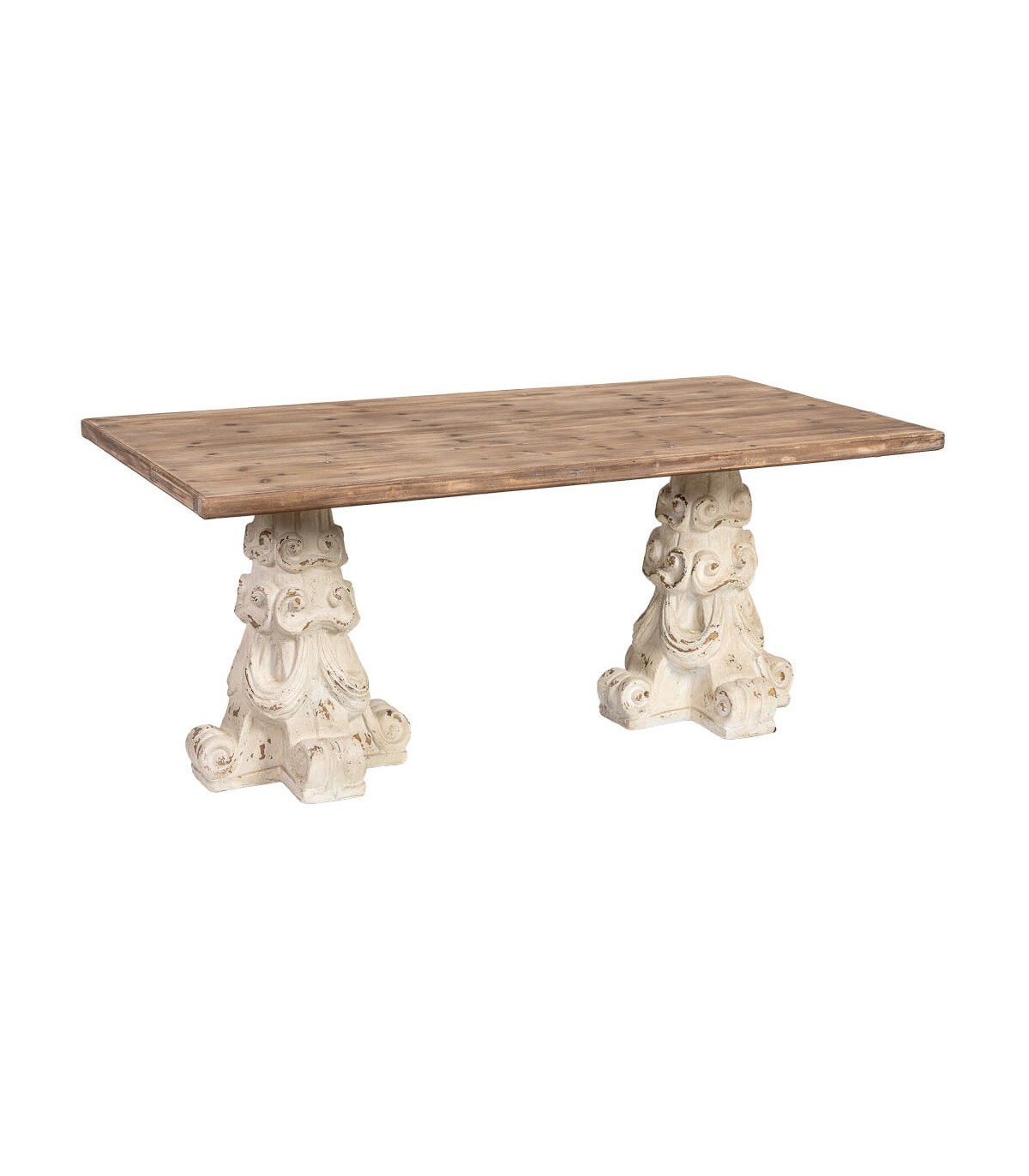 Los pies tallados en blanco vintage introducen un contraste suave que aligera el conjunto y refuerza su aire artesanal. Su formato rectangular permite una disposición cómoda para varios comensales, favoreciendo encuentros cotidianos en un ambiente acogedor. Una pieza pensada para interiores donde la tradición y la funcionalidad conviven con naturalidad.