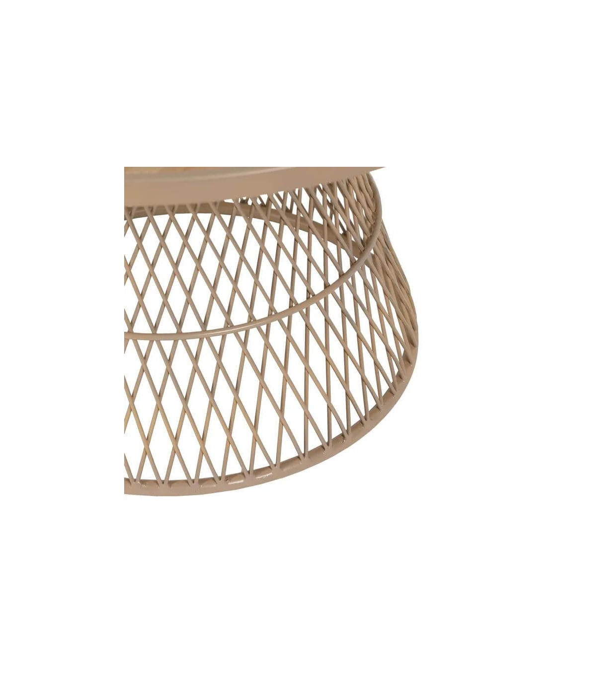 Mesa de centro realizada en metal lacado en beige con la tapa en ratán natural trenzado a mano, una mesa de centro pequeña perfecta para sofás con chaise longue.