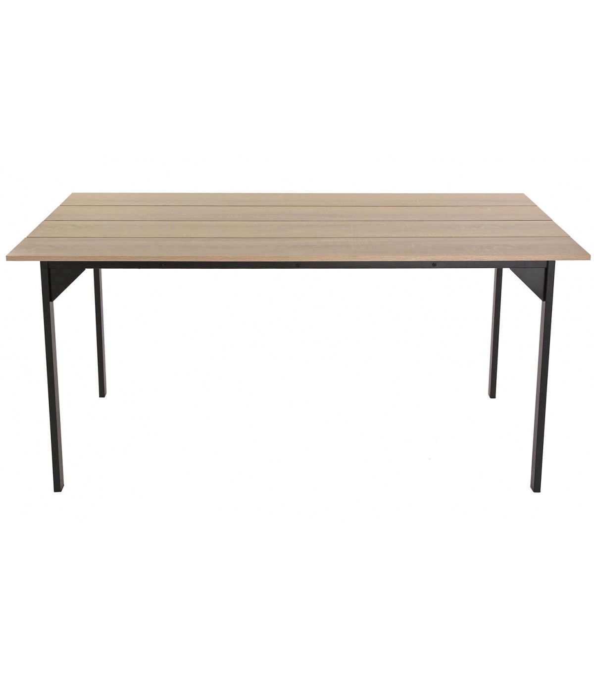 Mesa de comedor con la estructura en metal negro y la tapa en melamina imitación roble claro, muy práctica para la limpieza y muy resistente.