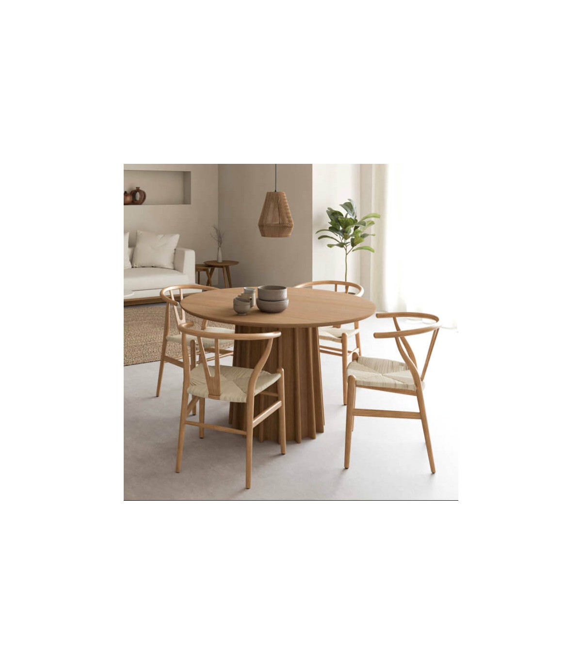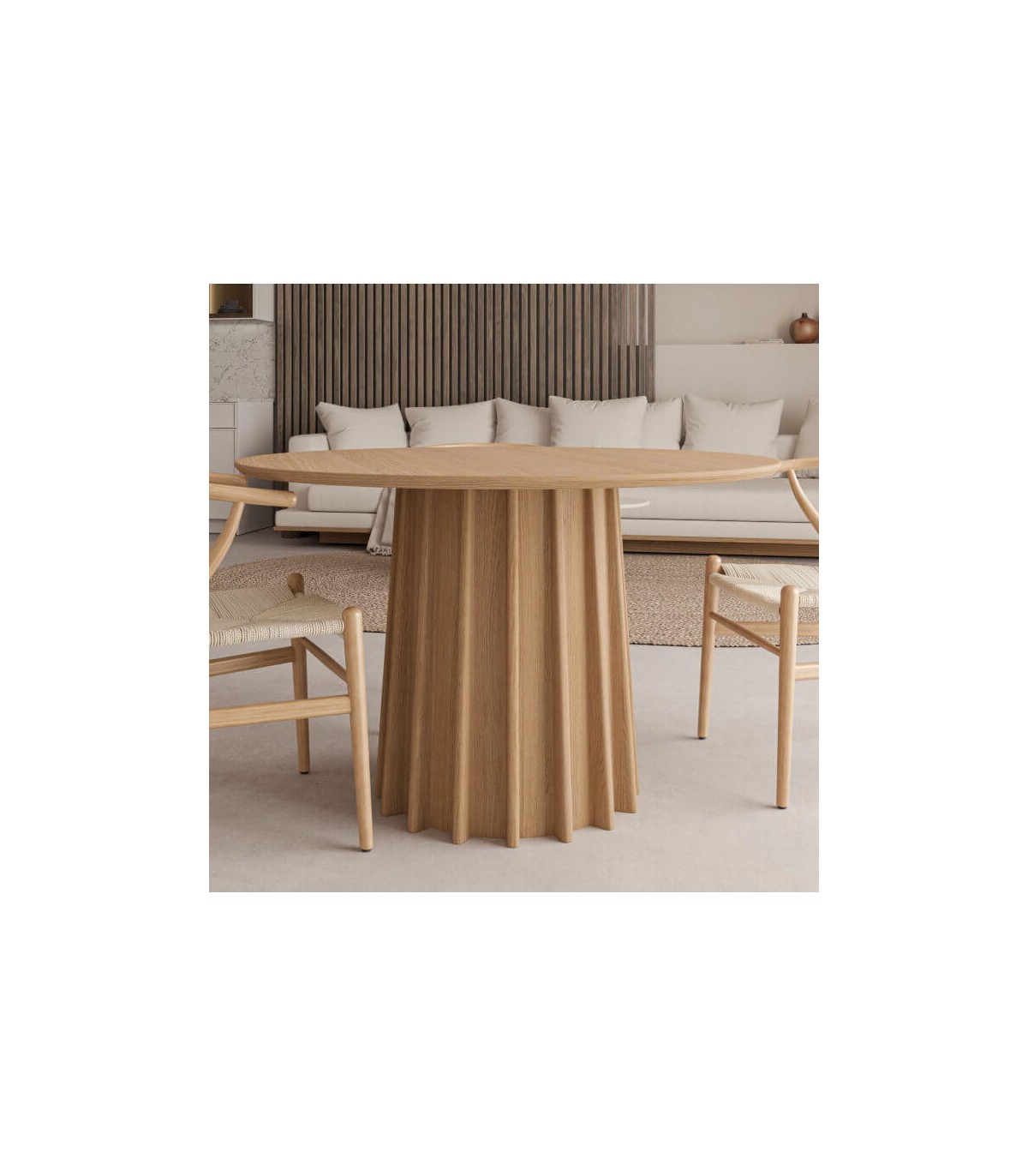 Mesa de comedor redonda pequeña madera de roble natural, una auténtica declaración de estilo y calidez, diseñada para enriquecer cualquier espacio del hogar con su presencia distintiva.