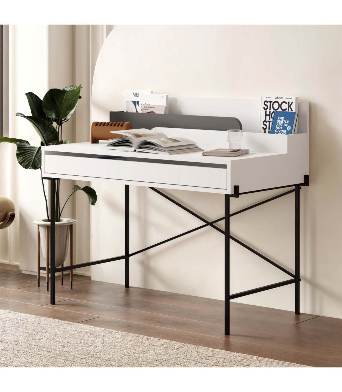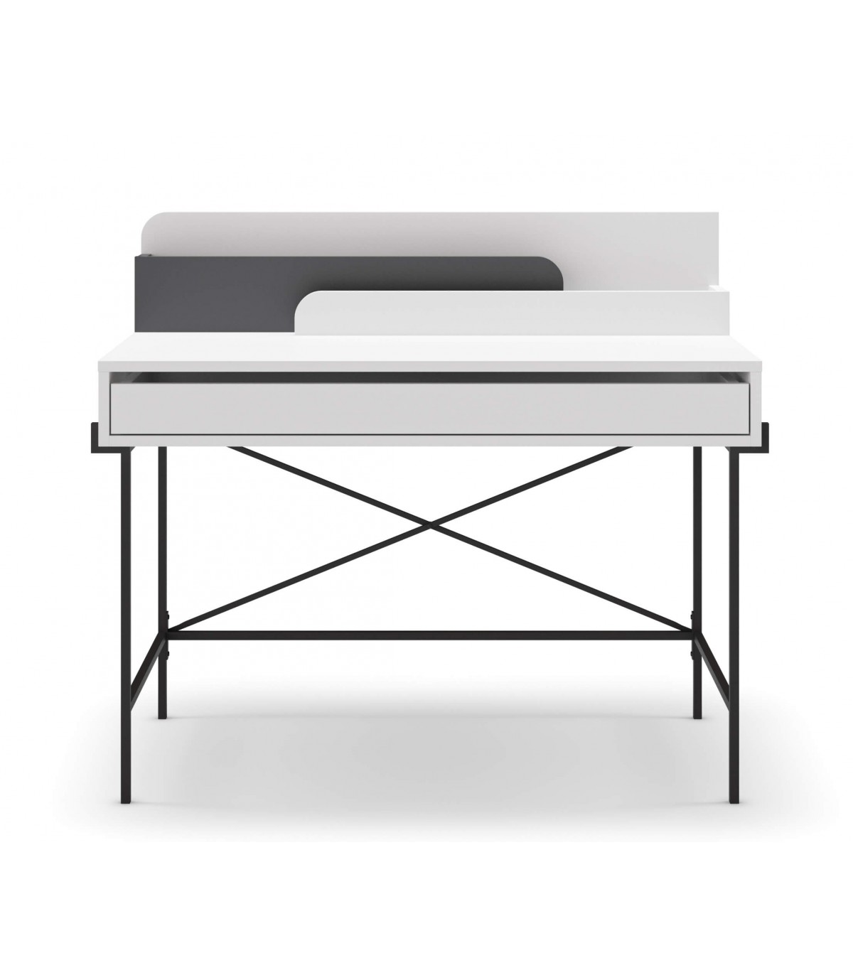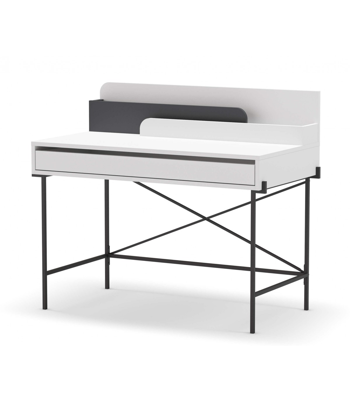 Mesa escritorio realizada en melamina blanca y gris y metal negro con 1 cajón, perfecta para montarte un buen espacio de trabajo en casa, cómoda y practica, encaja muy bien con todo tipo de decoraciones.