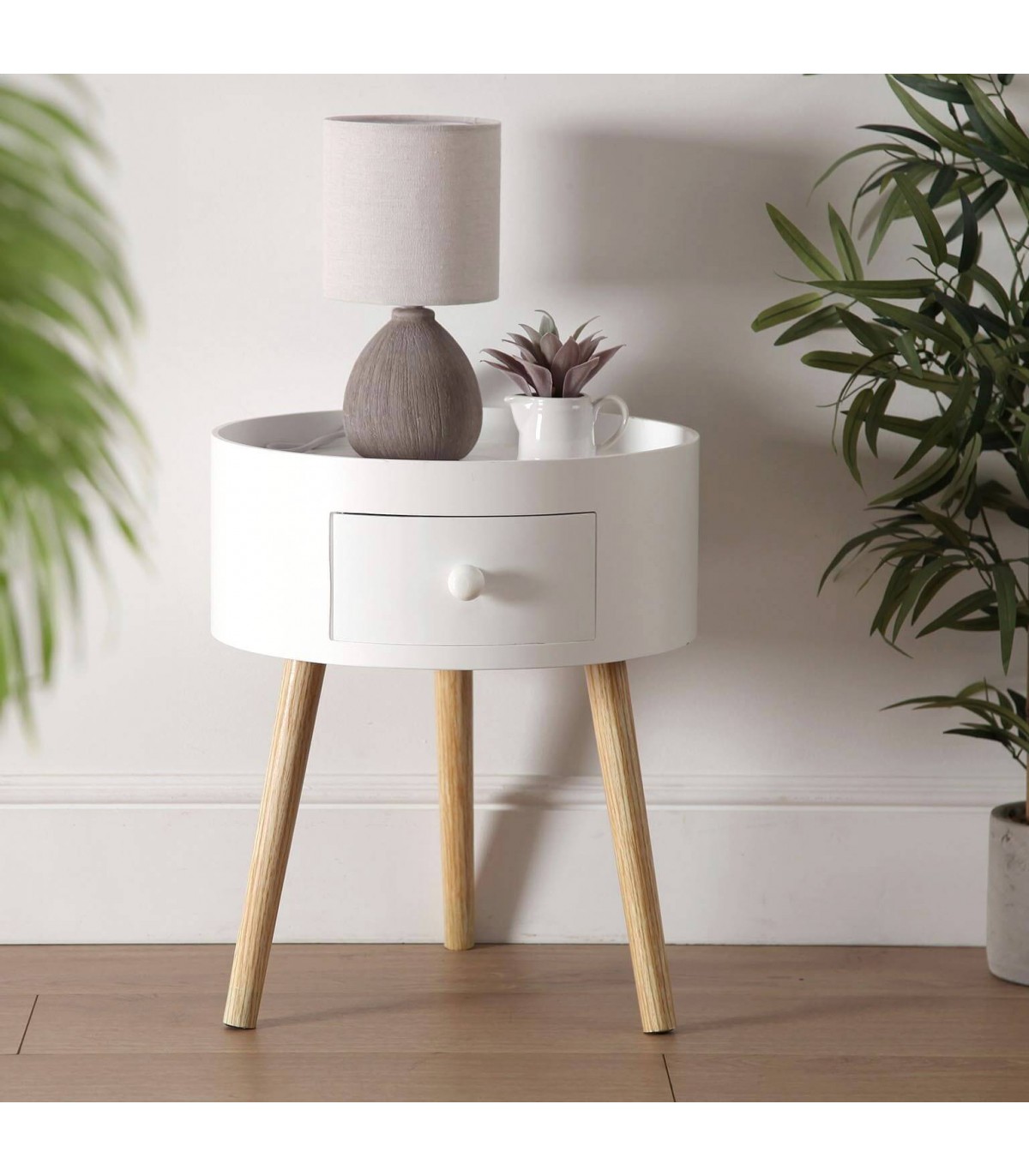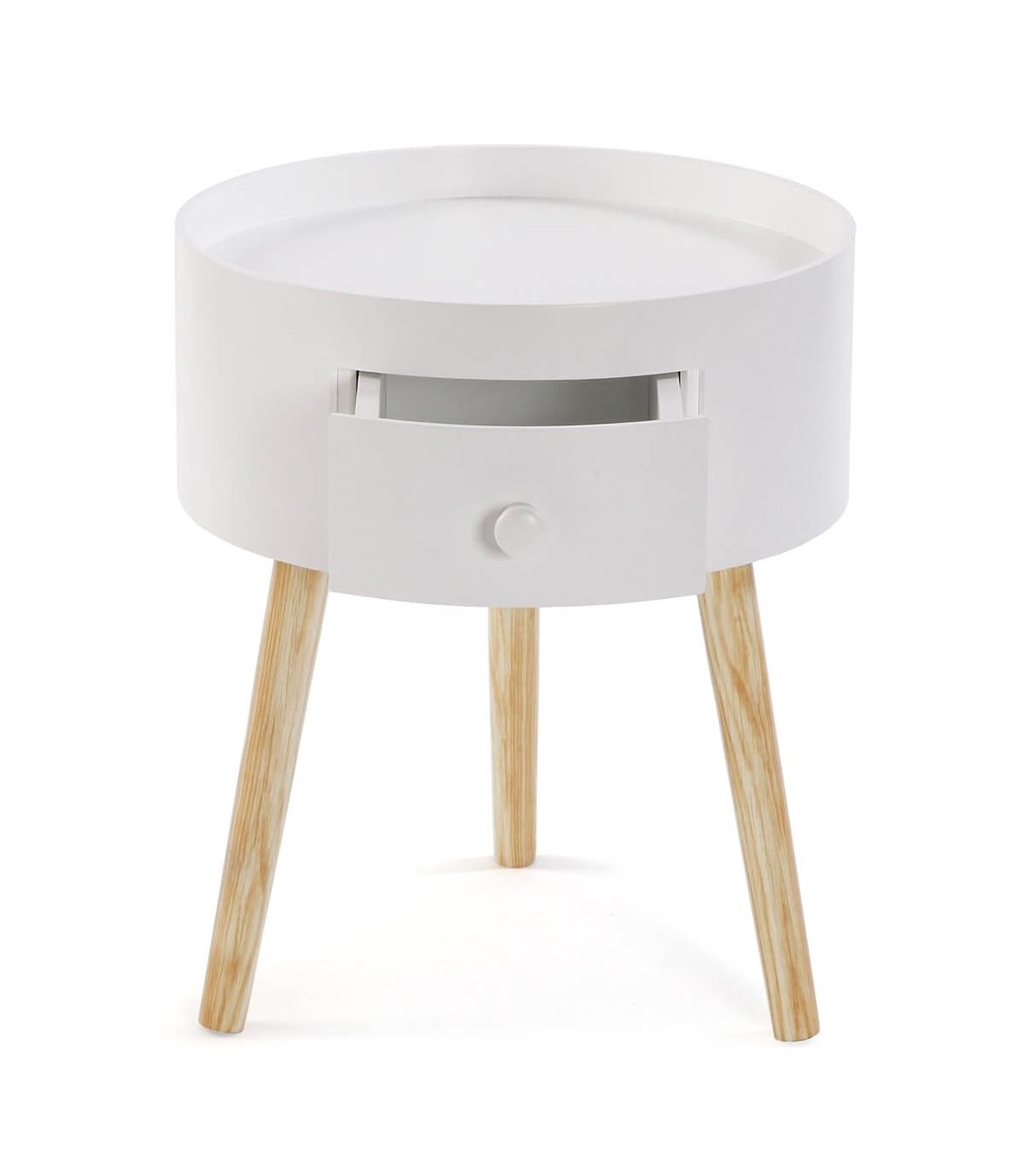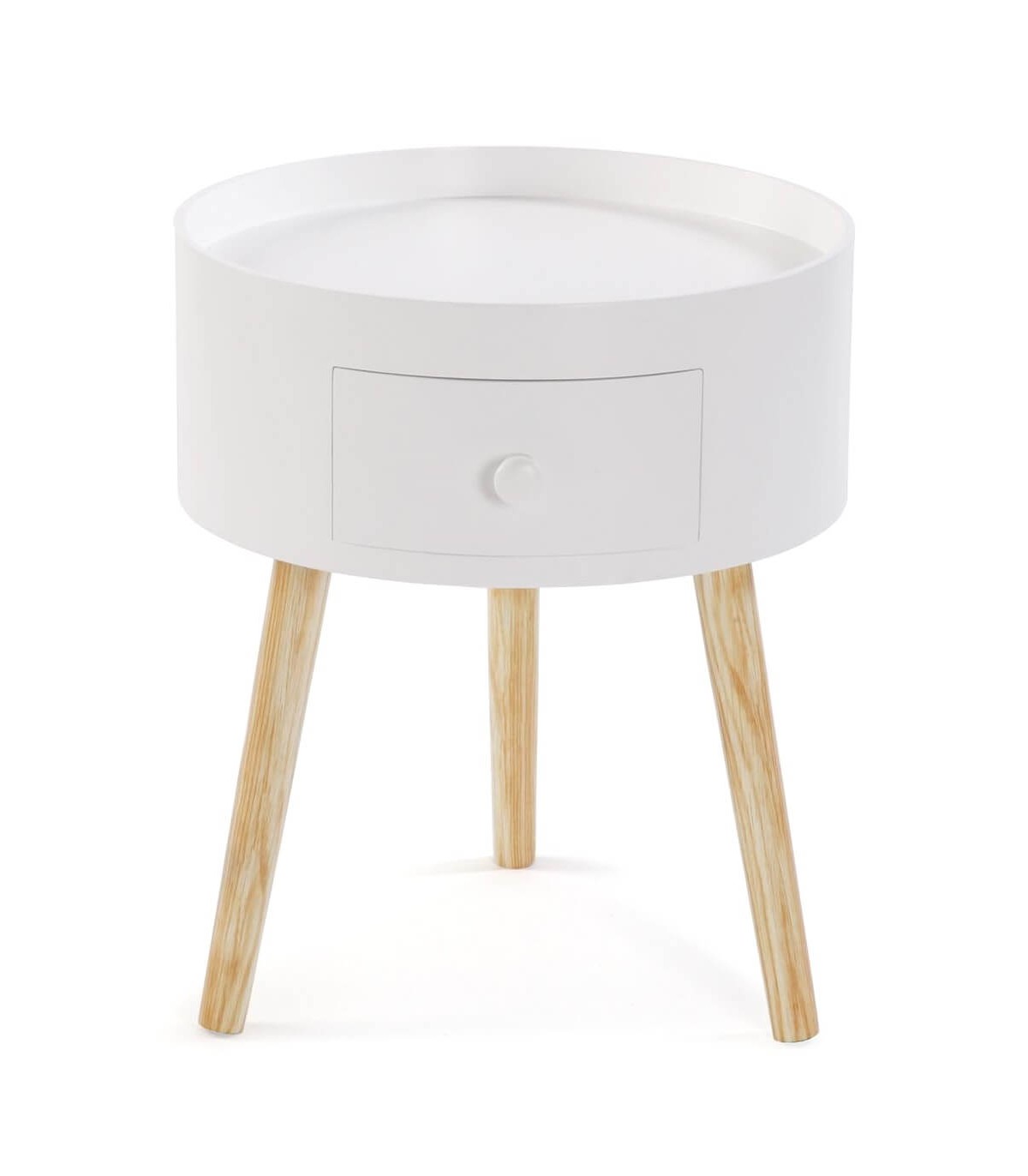 Mesa auxiliar redonda, 1 cajón, estilo nórdico.