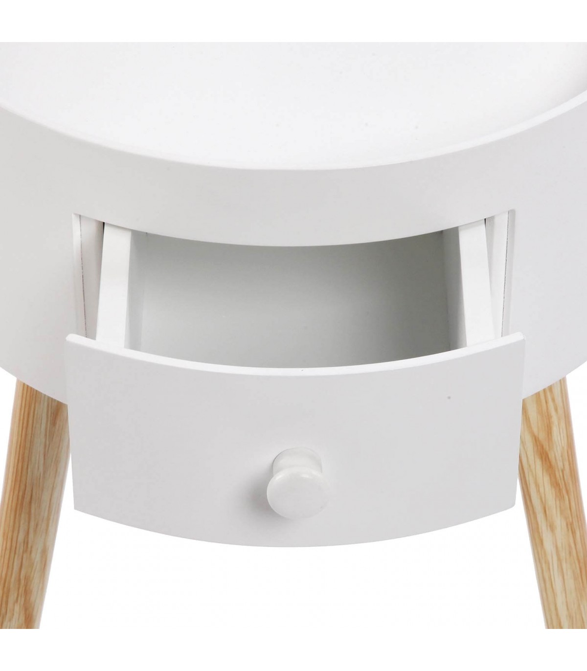 Práctica y bonita mesita auxiliar redonda de estilo nórdico con un cajón, realizada en madera de haya natural y mdf lacado en blanco, ideal para acompañar a la mesa de centro en salones pequeños, o como mesita de noche.