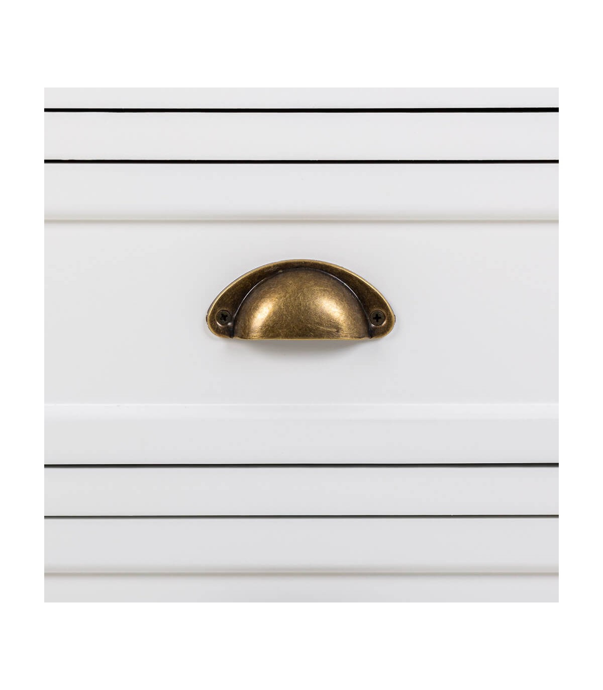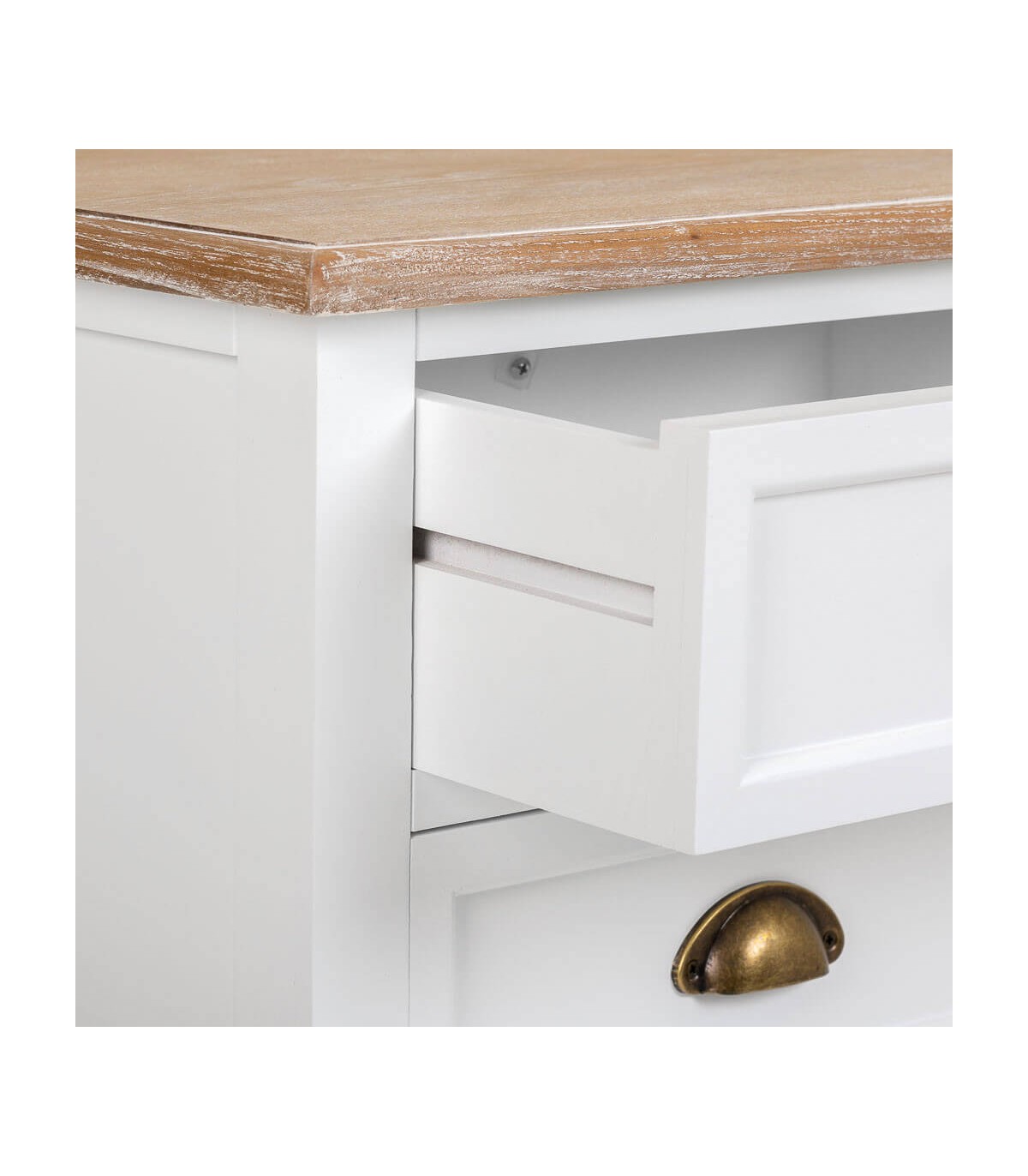 Acabado, tapa madera natural patinada en blanco, cuerpo lacado en blanco, tiradores bronce.