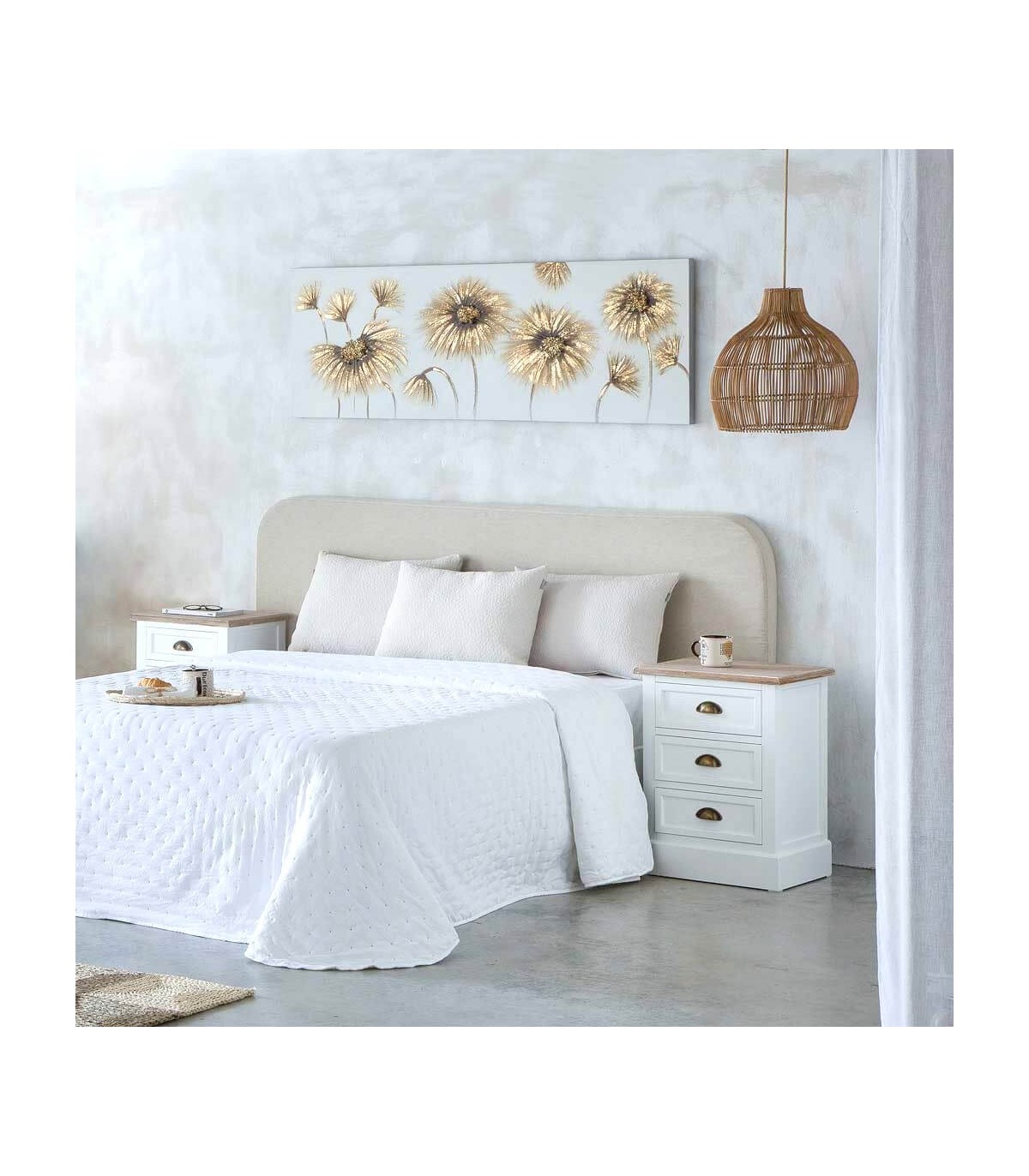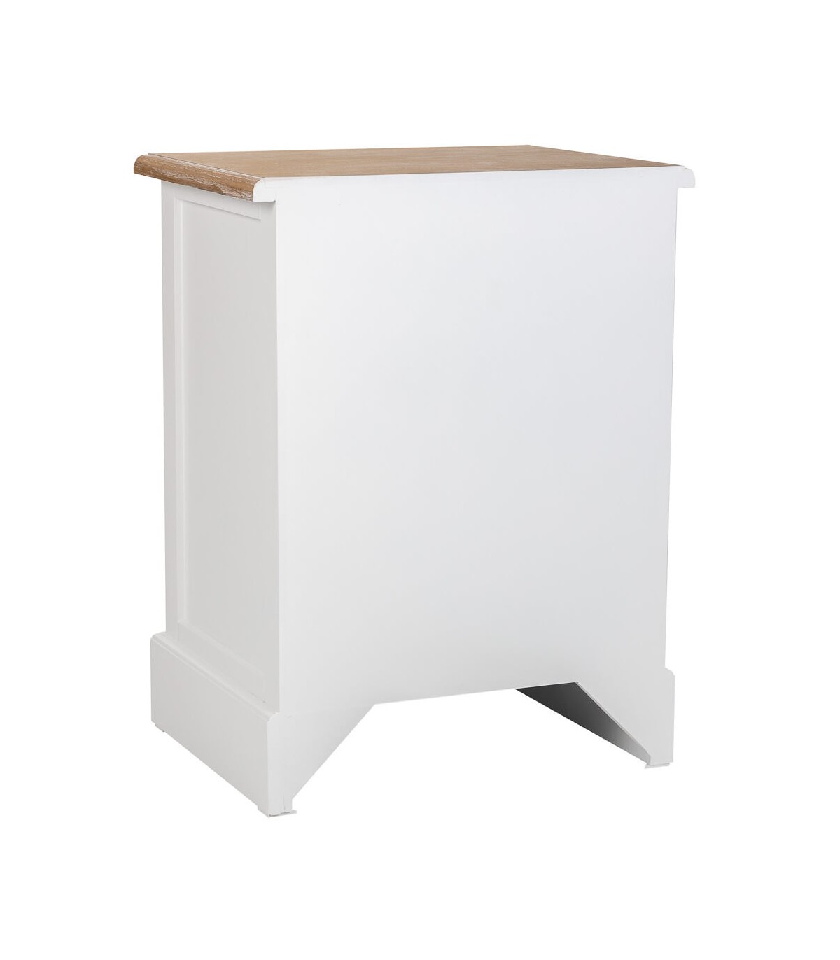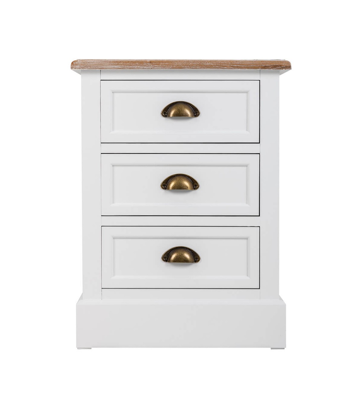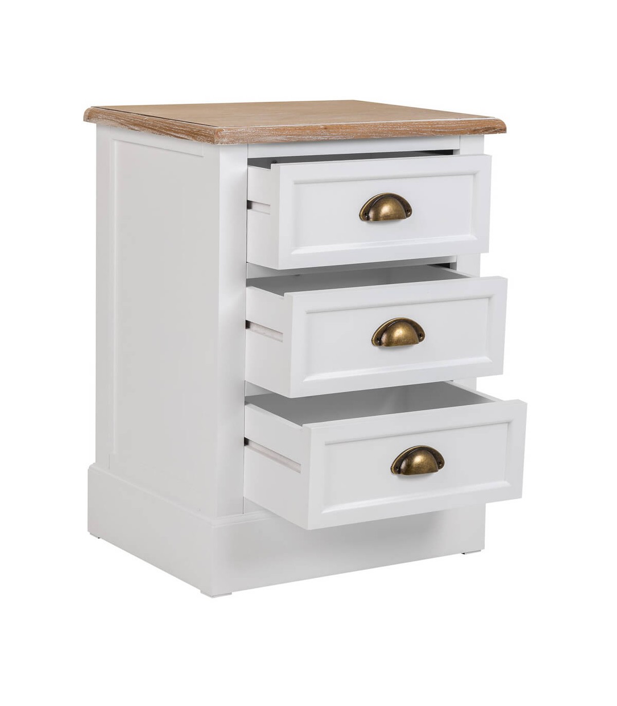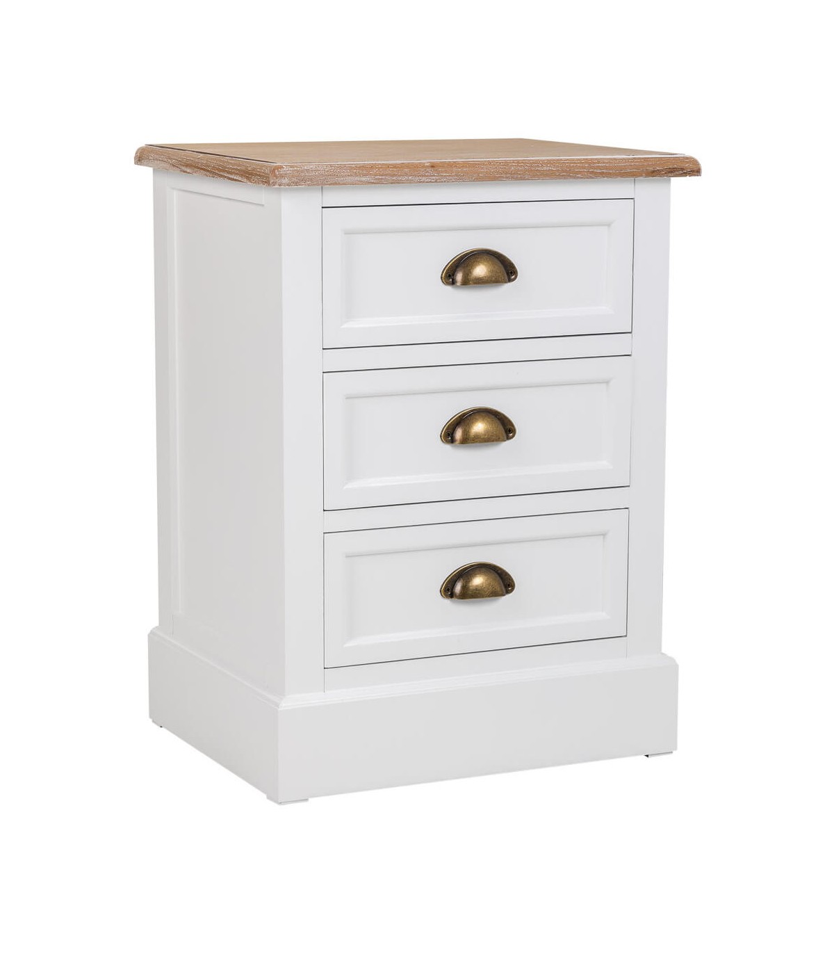 Mesita de noche de 3 cajones de nuestra colección Mirlo, una colección que se caracteriza por su luminosidad, realizada en madera lacada en blanco con la tapa en madera natural patinada en blanco, de líneas rectas con el contraste del tirador tipo concha en metal acabado bronce, una colección de muebles auxiliares con los que podrás darle un toque rústico mediterráneo a cualquier estancia de tu hogar.