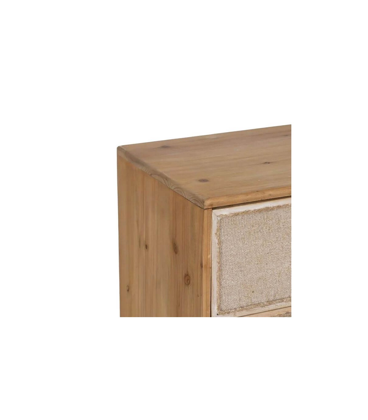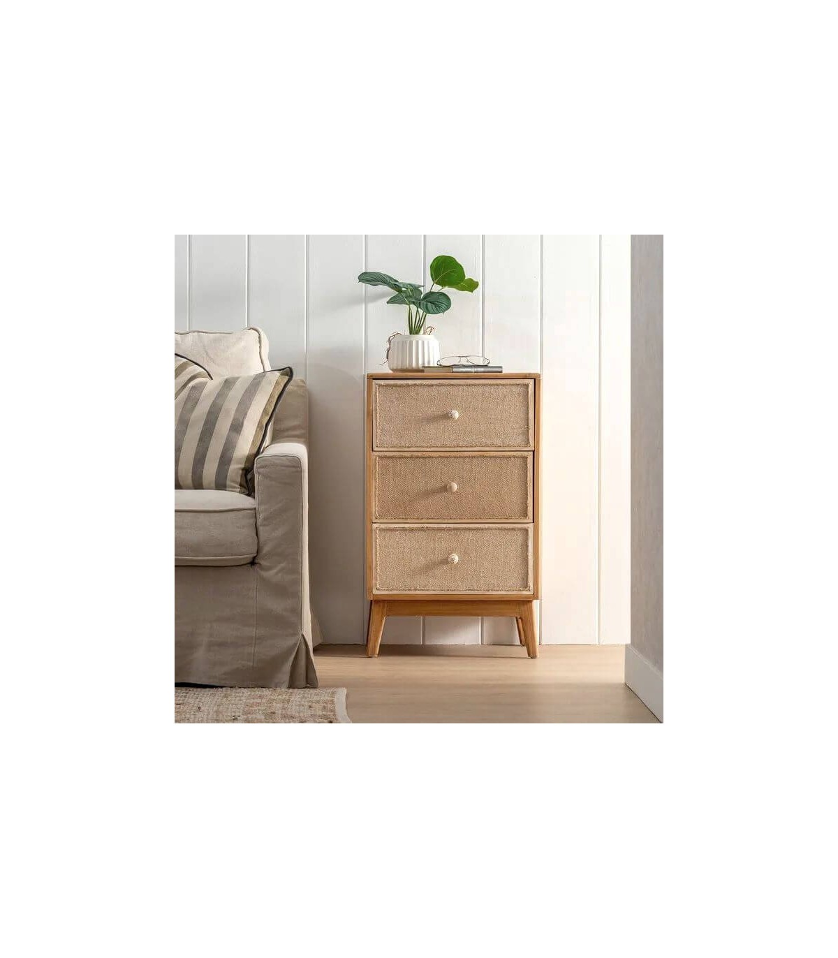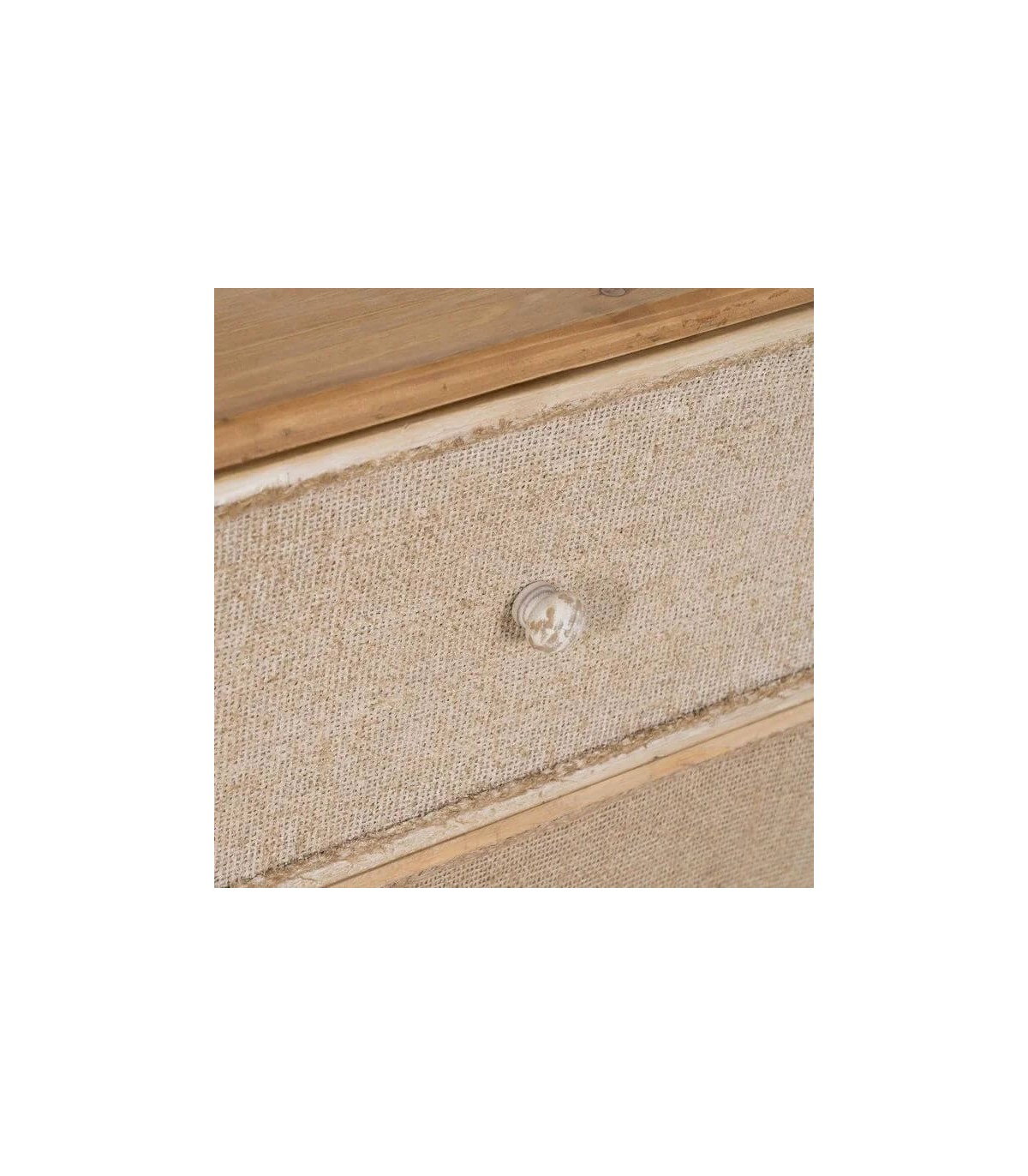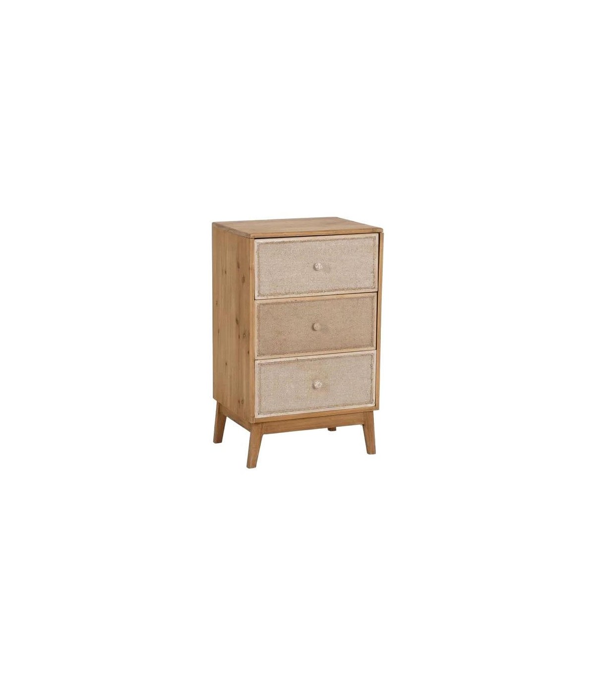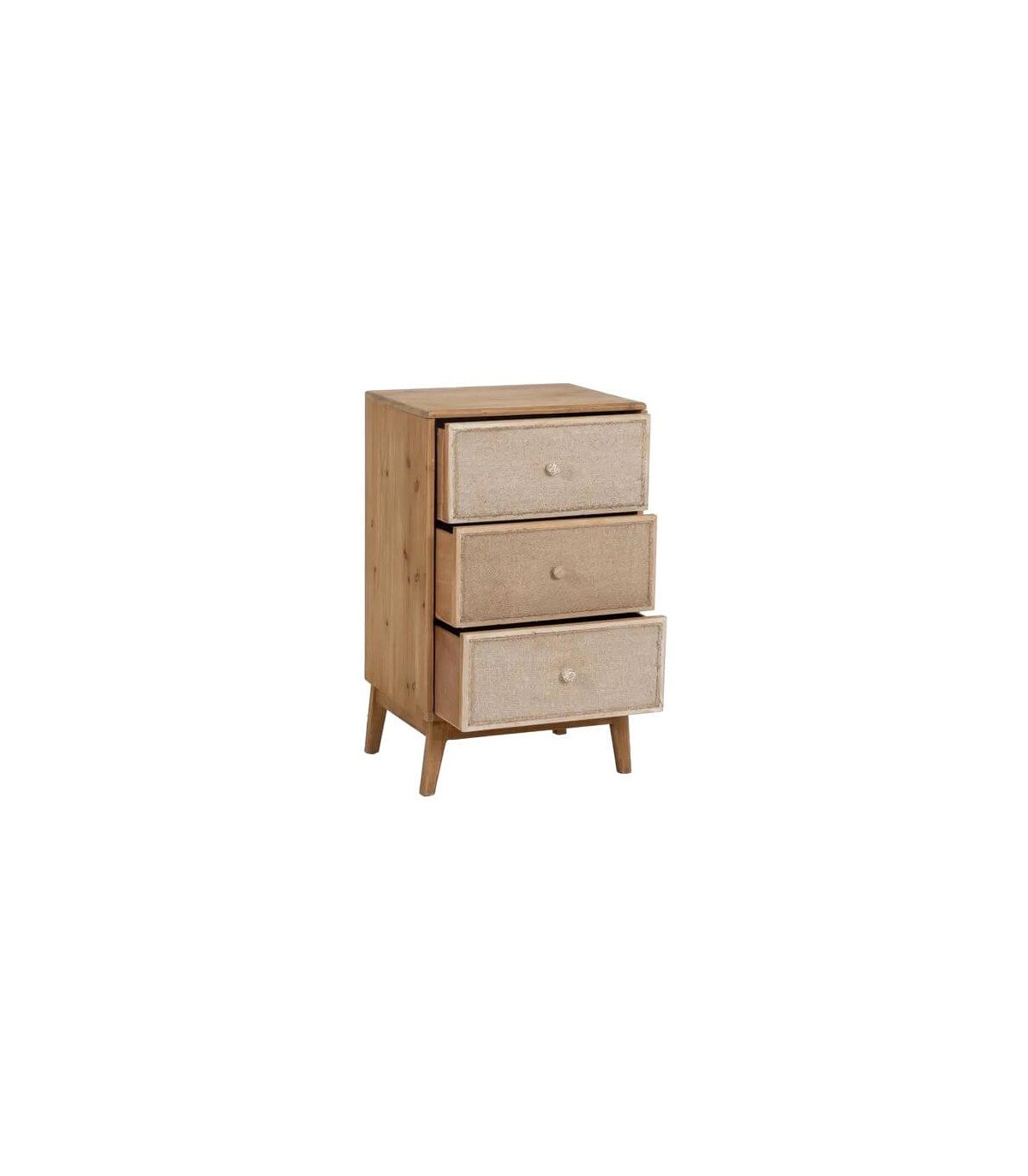 Mesita de noche, con 3 cajones, realizada en madera de abeto, con los cajones en tela de saco pintada en blanco roto, una mesita muy práctica y decorativa, ideal para tu dormitorio o como mesita auxiliar.