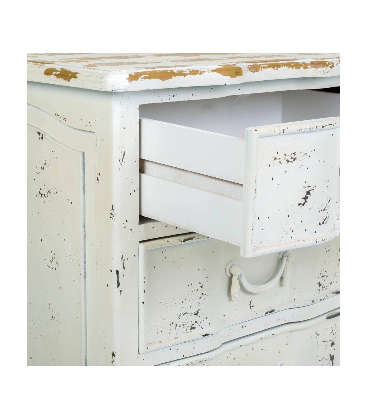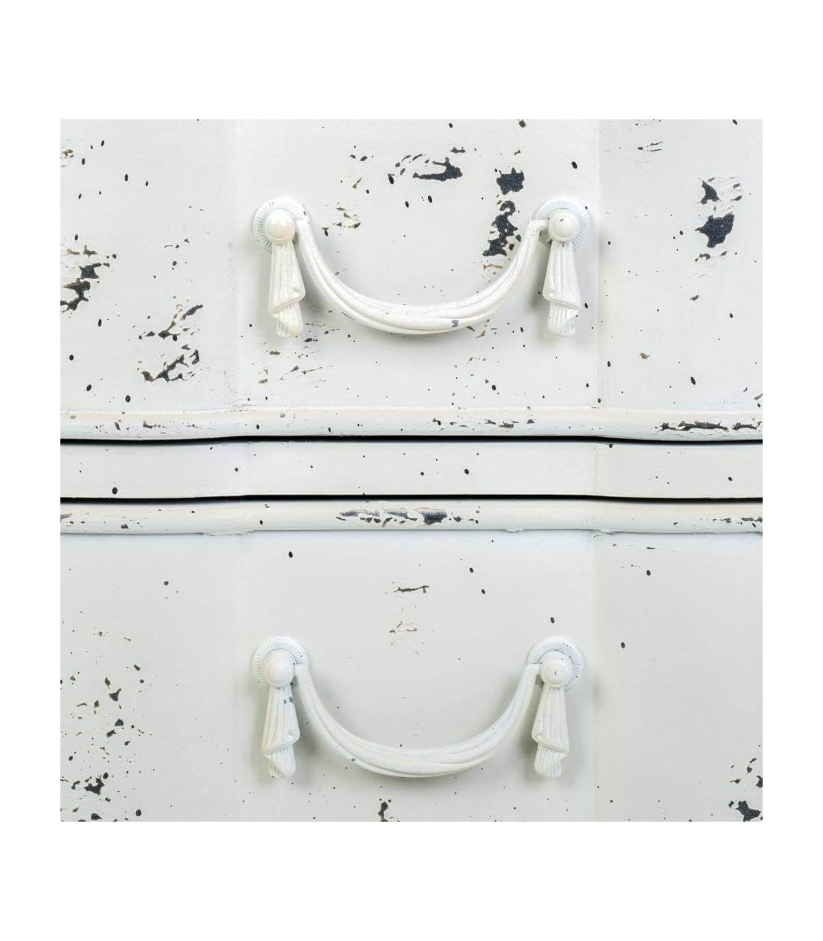 Acabado, tapa de madera patinada en blanco, cuerpo blanco decapado acabado vintage.