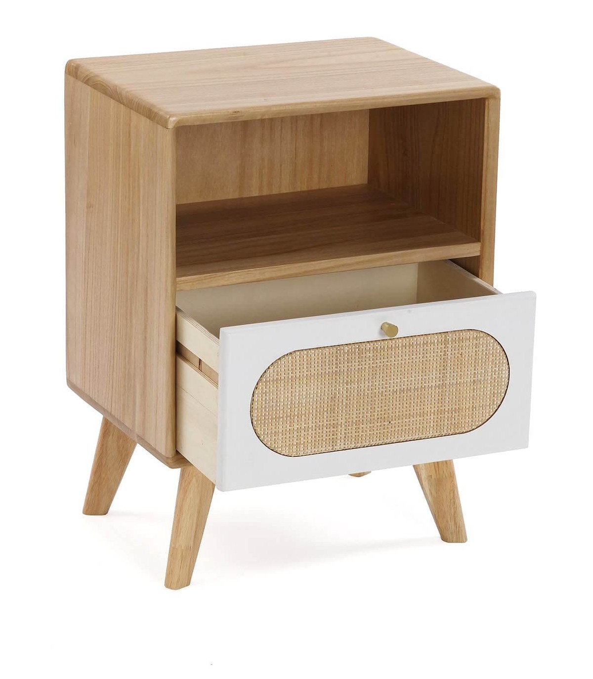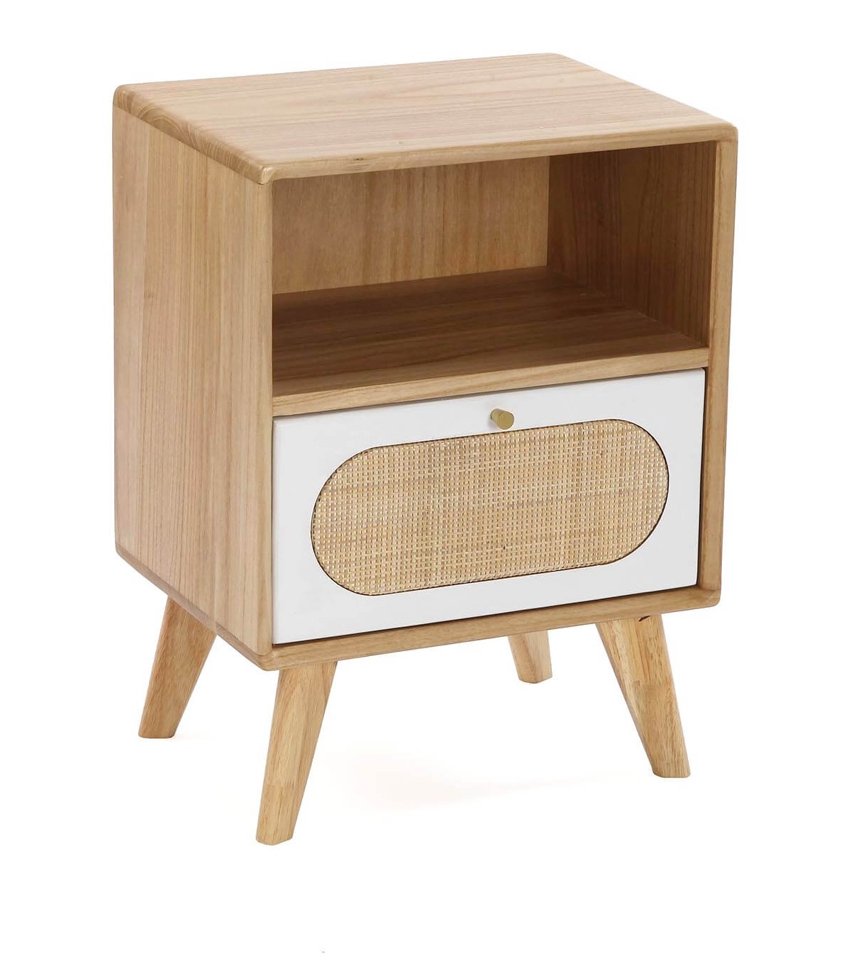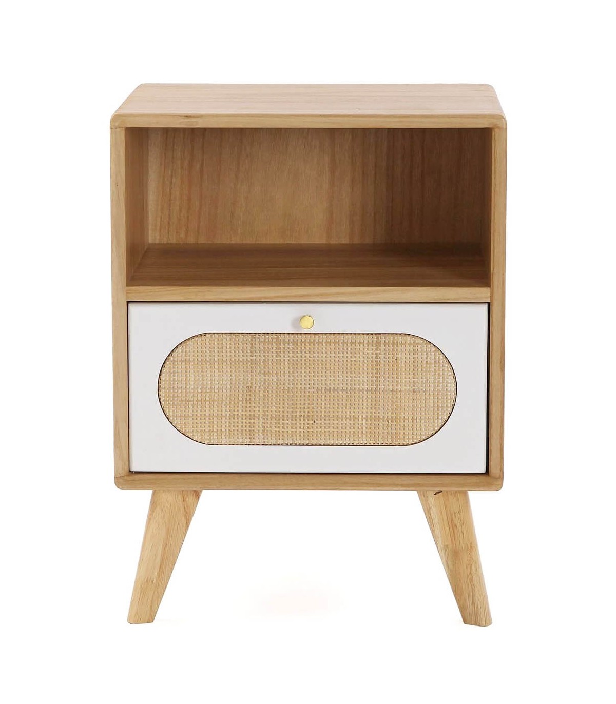 Mesita de noche con un cajón de nuestra colección manzon, una colección que se enclava en el estilo nórdico, realizada en madera de paulonia, en acabado natural y blanco, el detalle del ratán natural y los tiradores en color oro, una colección de muebles auxiliares muy actual, luminosa y vestida.