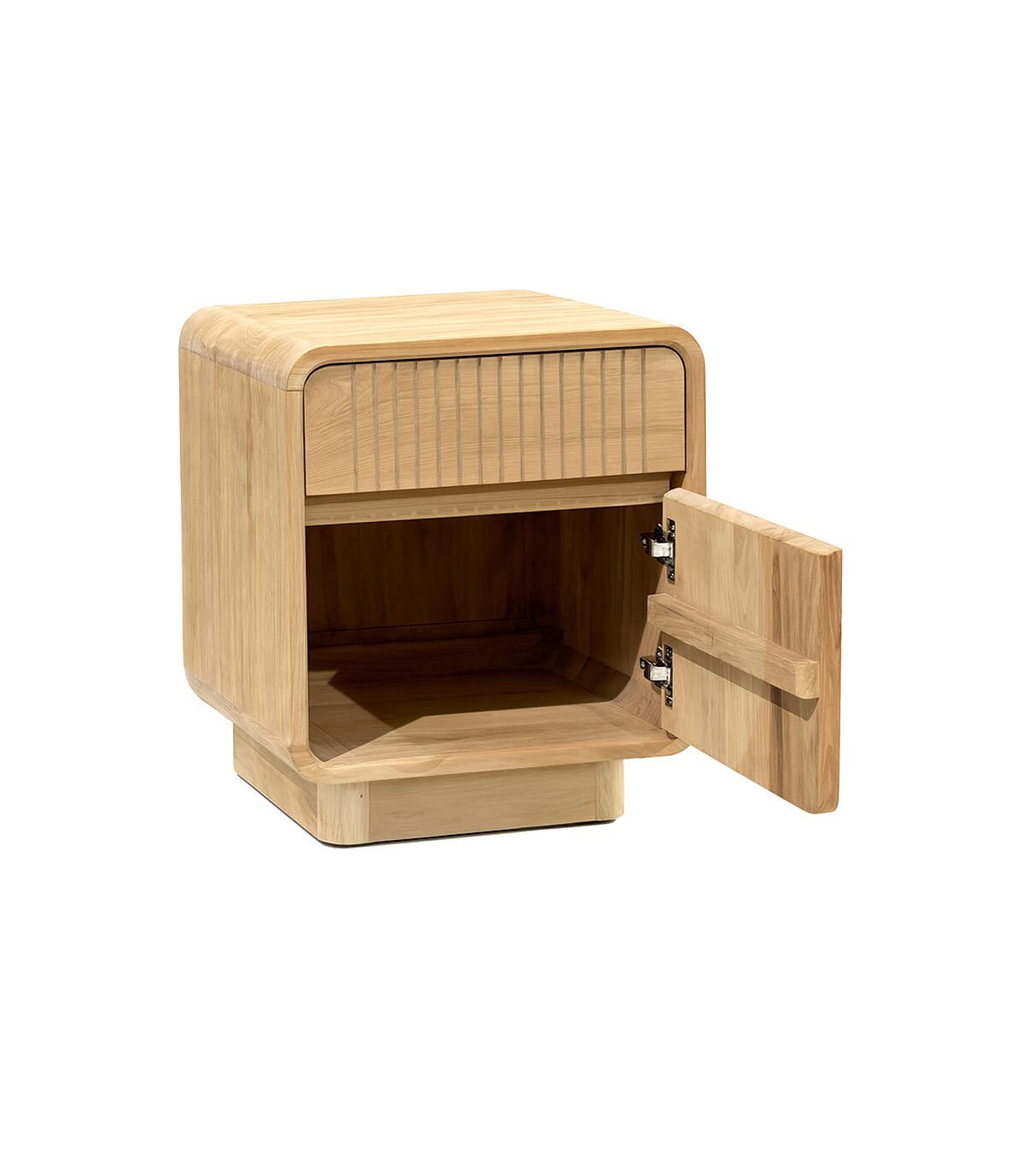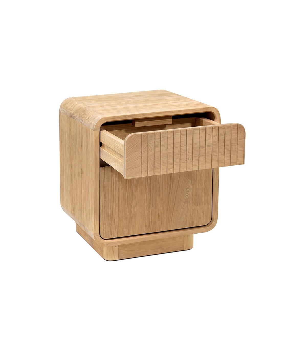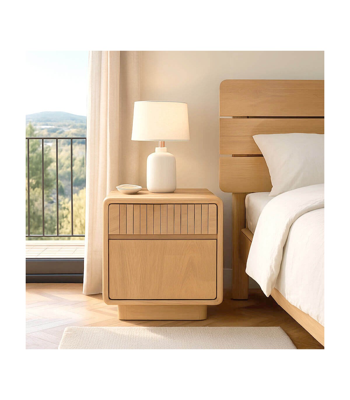 Mesita de noche con una estética serena y equilibrada que aporta orden y calidez al dormitorio, integrándose con naturalidad en espacios que buscan armonía y bienestar. Su diseño compacto y de líneas suaves destaca por la belleza auténtica de la madera, transmitiendo sensación de equilibrio y calma visual.