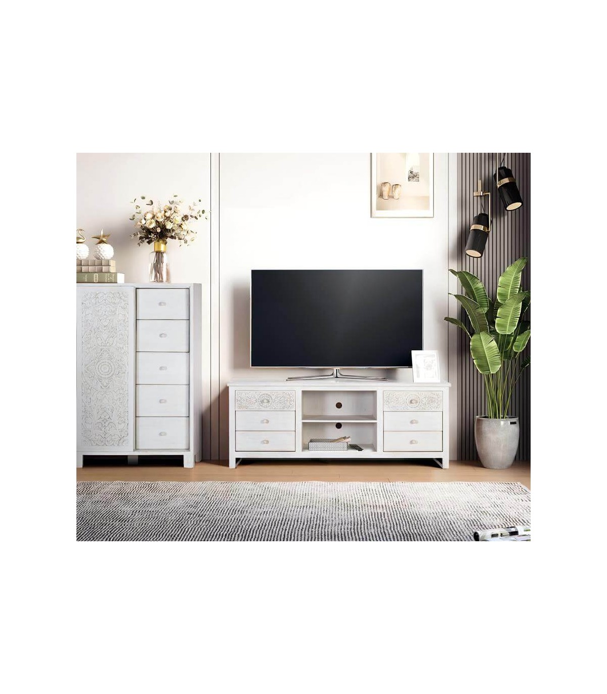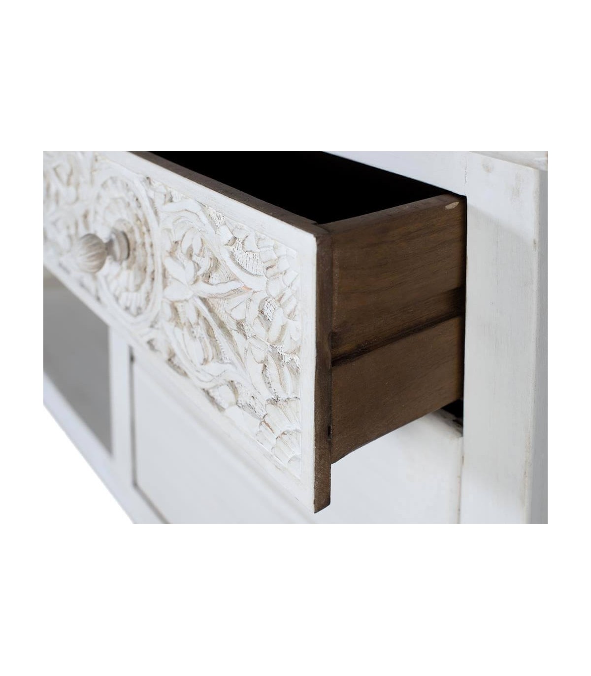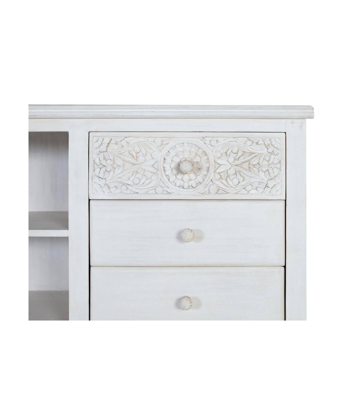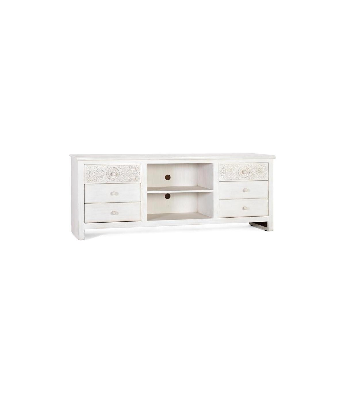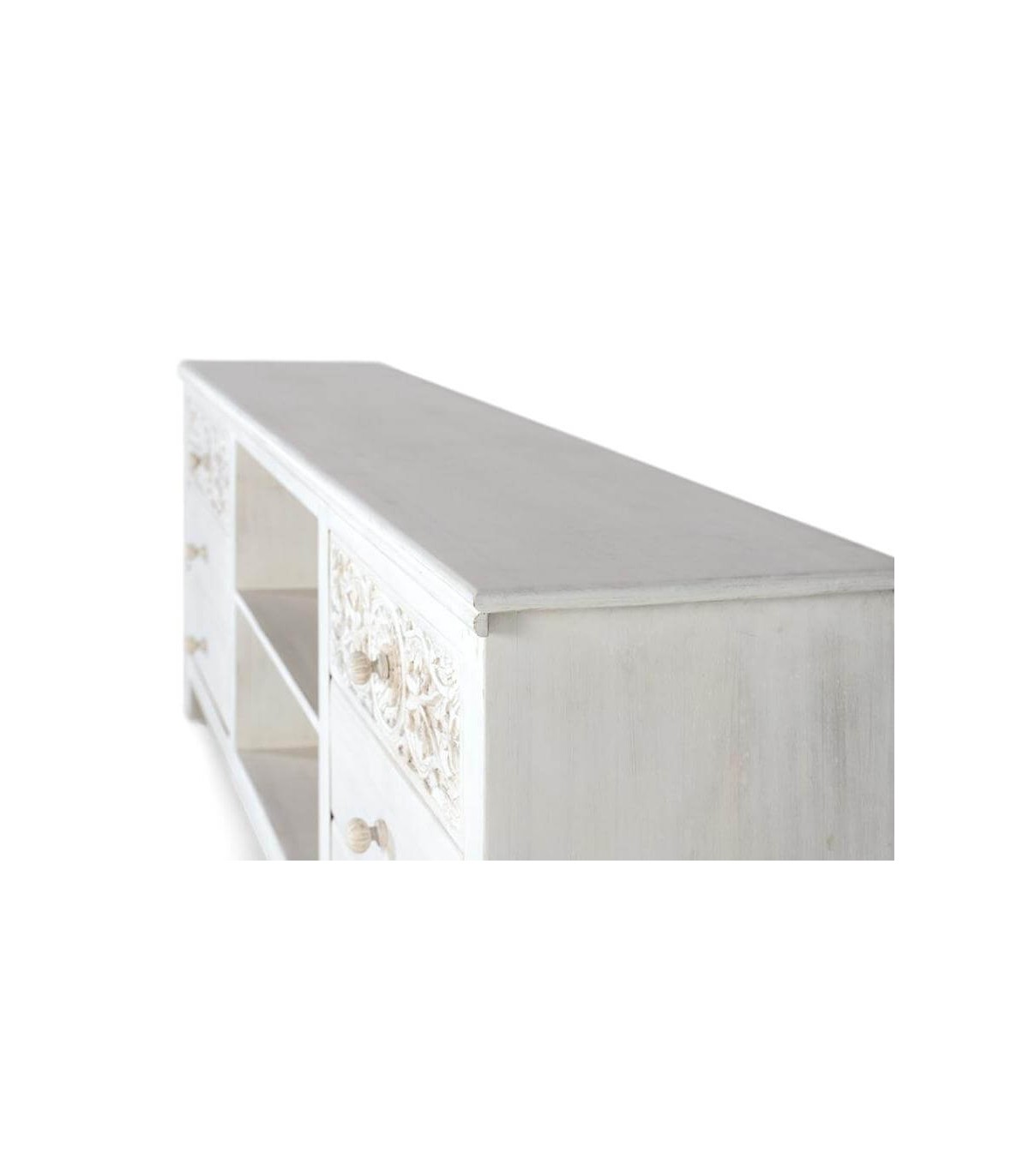 Mueble de TV realizado en madera maciza de mango, con detalles tallados a mano acabado blanco patinado, un mueble muy rico en detalles, una colección muy robusta y vestida, la talla del los frentes acabado en blanco patinado aportará luminosidad a tu decoración.