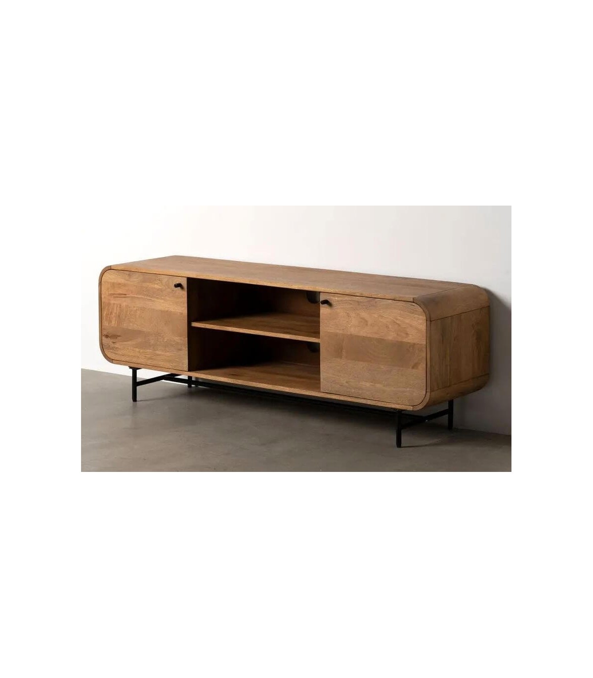 Mueble de TV con 2 cajones realizado en madera maciza de mango con las esquinas redondeadas y metal negro. Forma parte de una colección de muebles pensada para tu salón con alguna pieza auxiliar para tu dormitorio, realizada en madera maciza de mango natural y metal negro con todas las esquinas redondeadas de estilo colonial con un punto industrial.