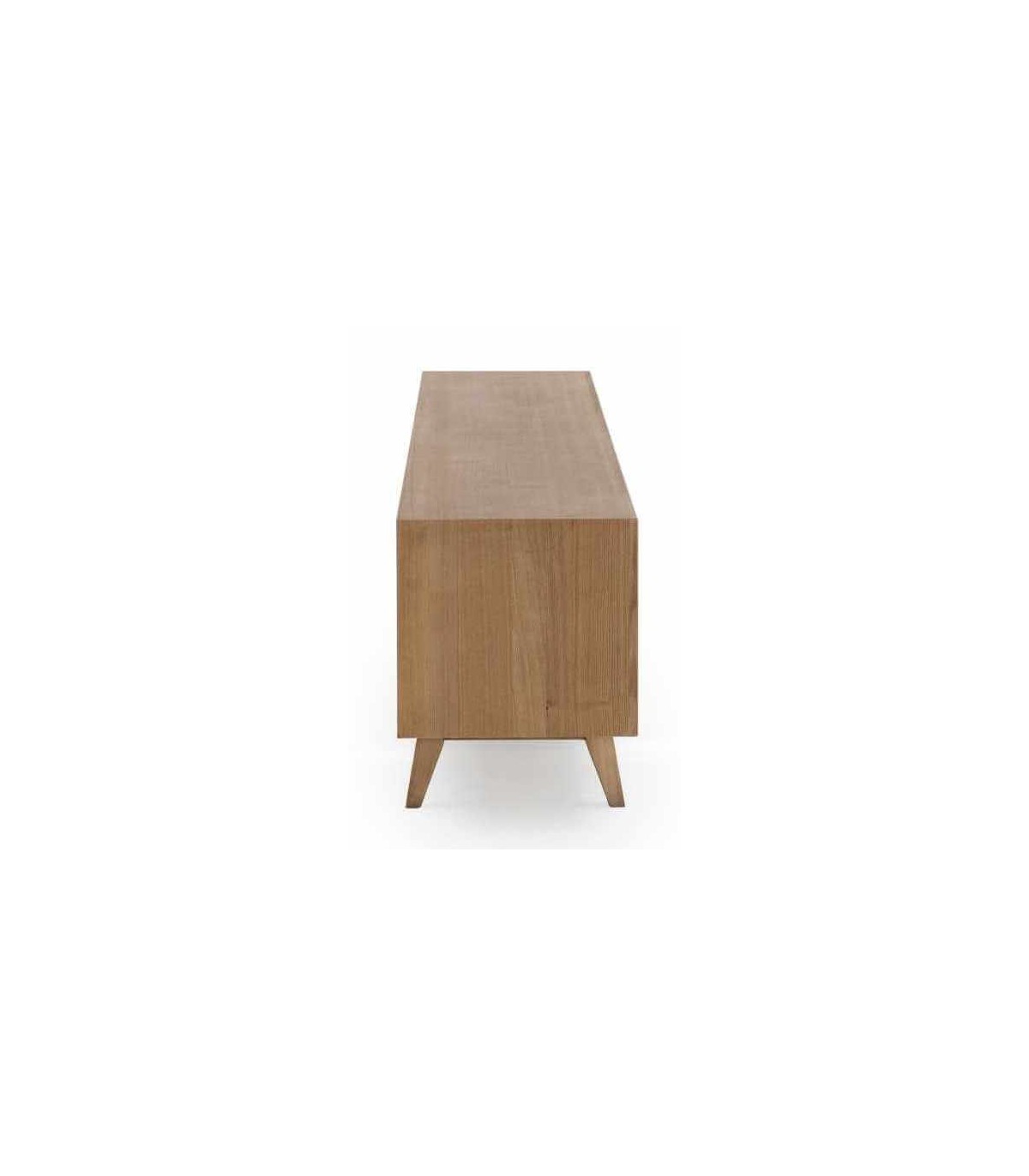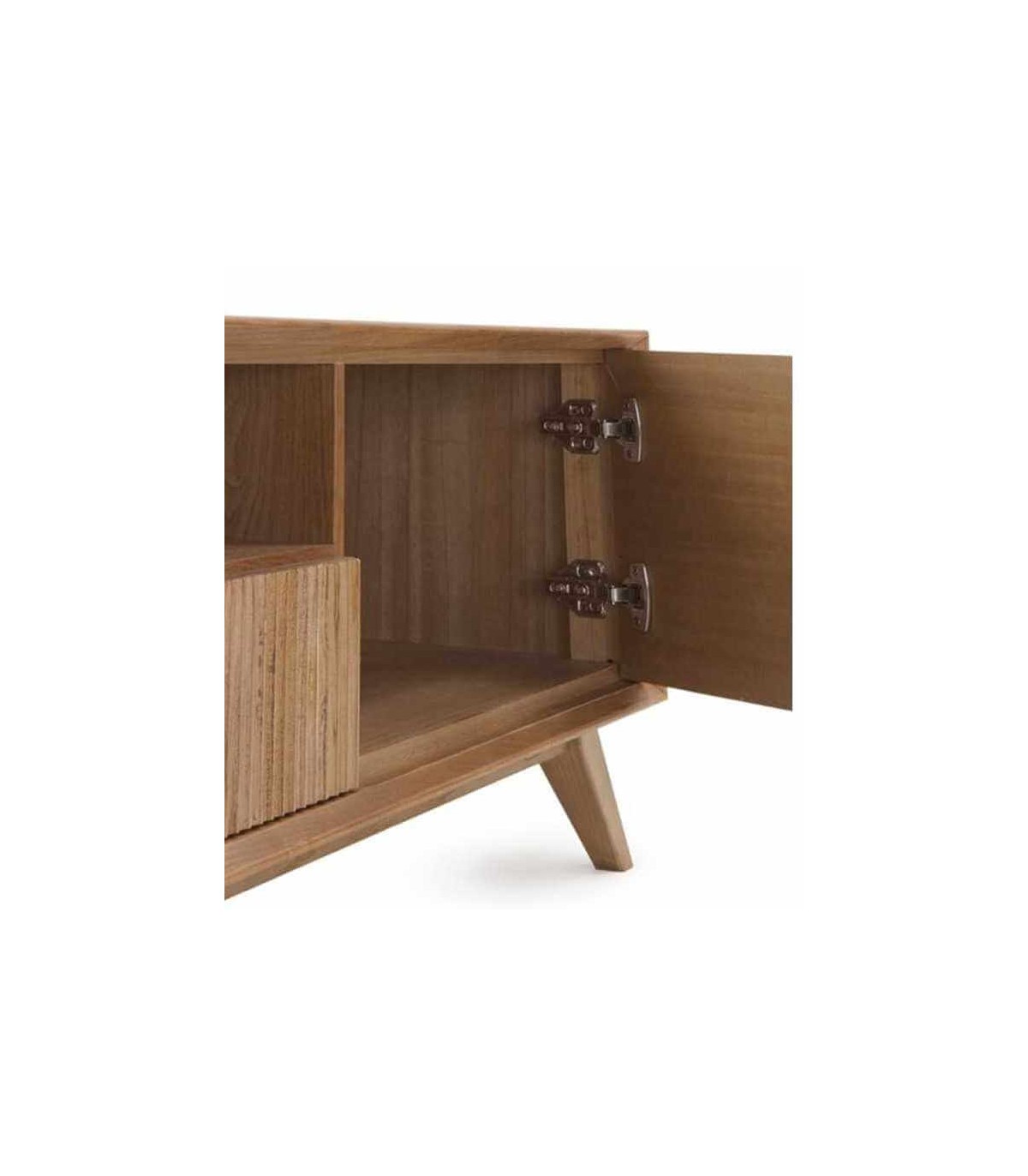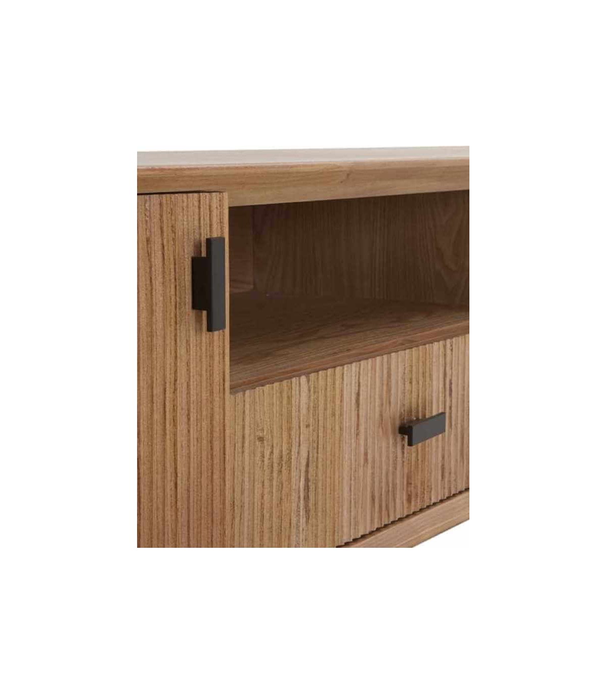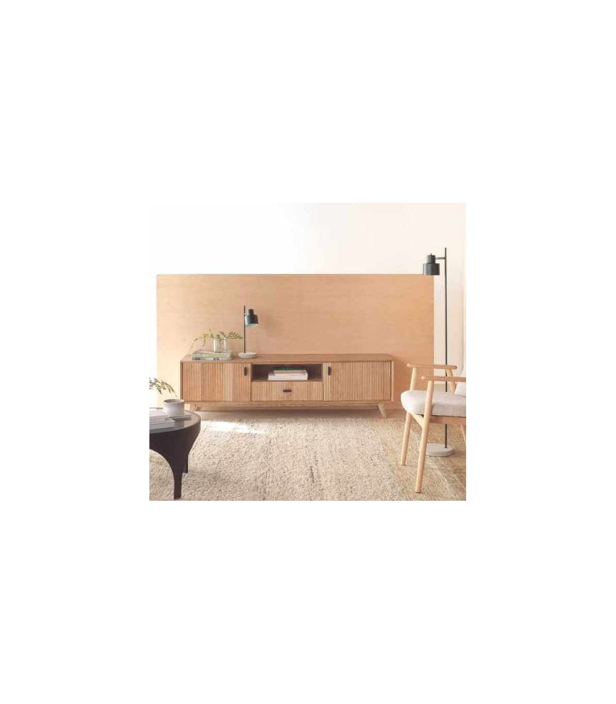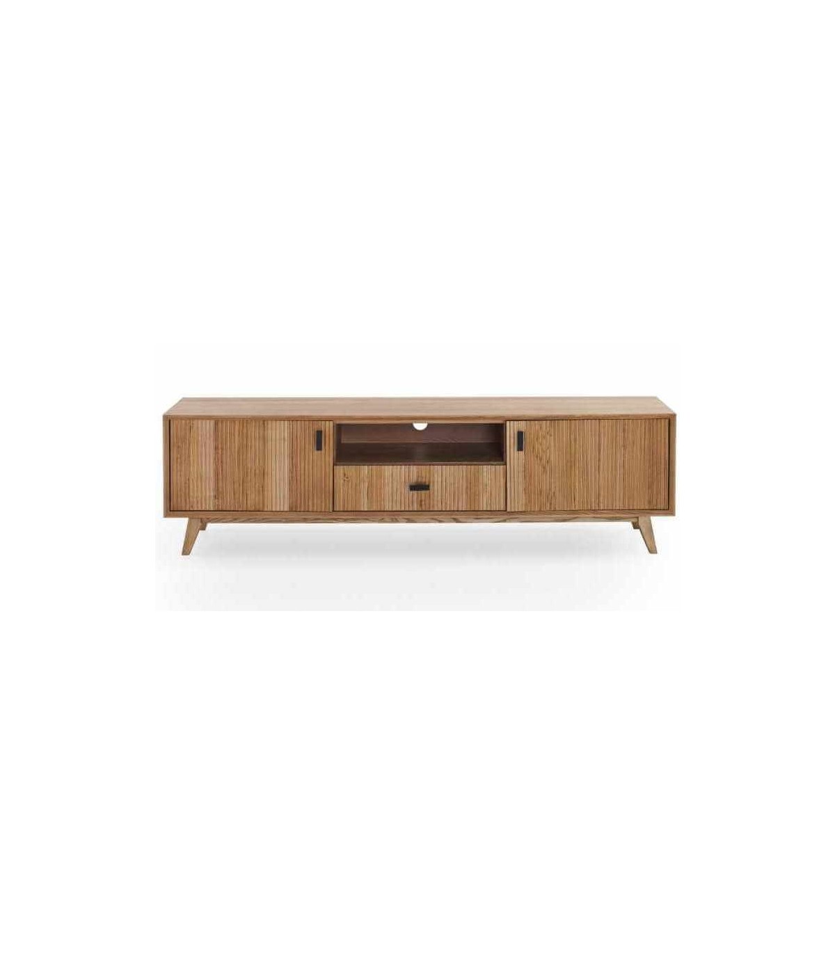 Mueble de TV realizado en madera de fresno natural con el frente de las puertas acanaladas y unos bonitos tiradores en metal negro, perfecto para un salón, para los que quieren un mueble práctico y decorativo.