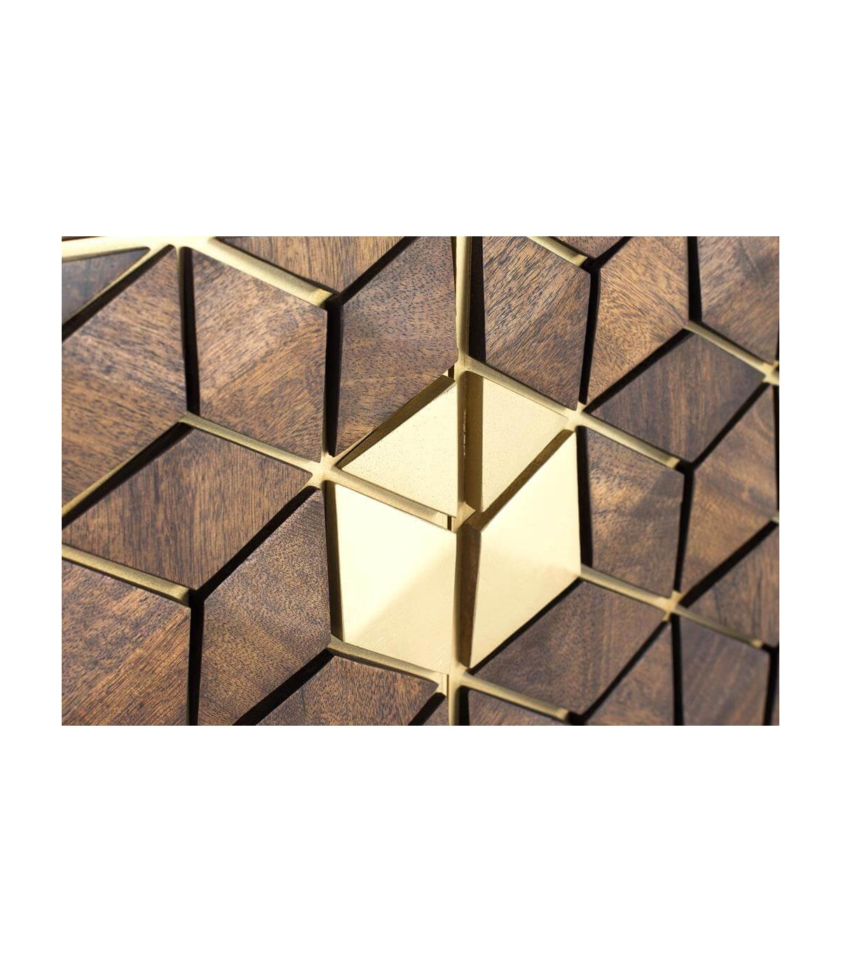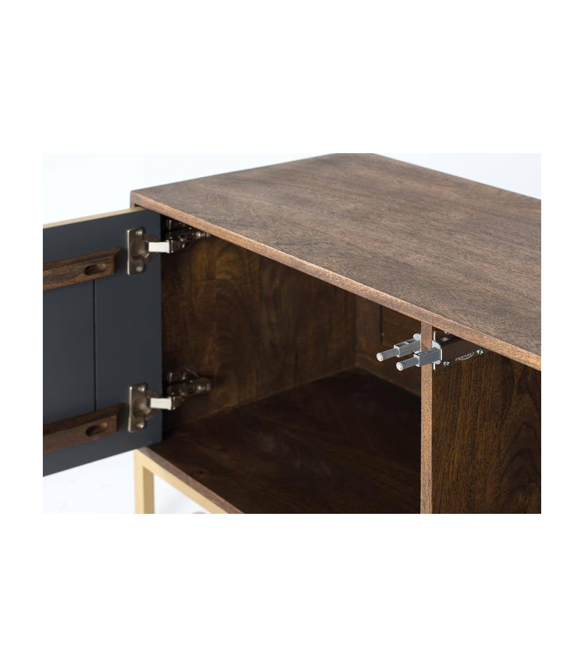 Mueble de TV de nuestra colección de muebles Zenda, una colección de estilo art decó con un ligero toque colonial, realizada en madera maciza de mango, jugando con los contrastes de la madera en color nogal y oro y el metal en oro a juego, no lleva tiradores las puertas se abren por el método PUSH.