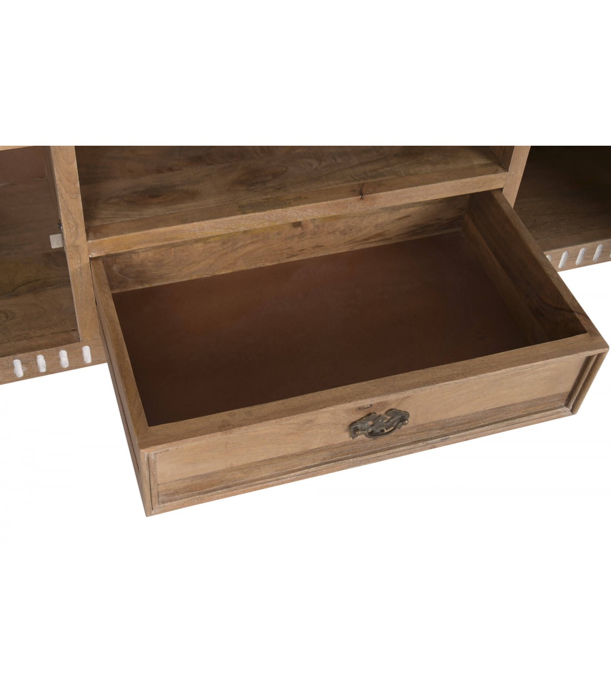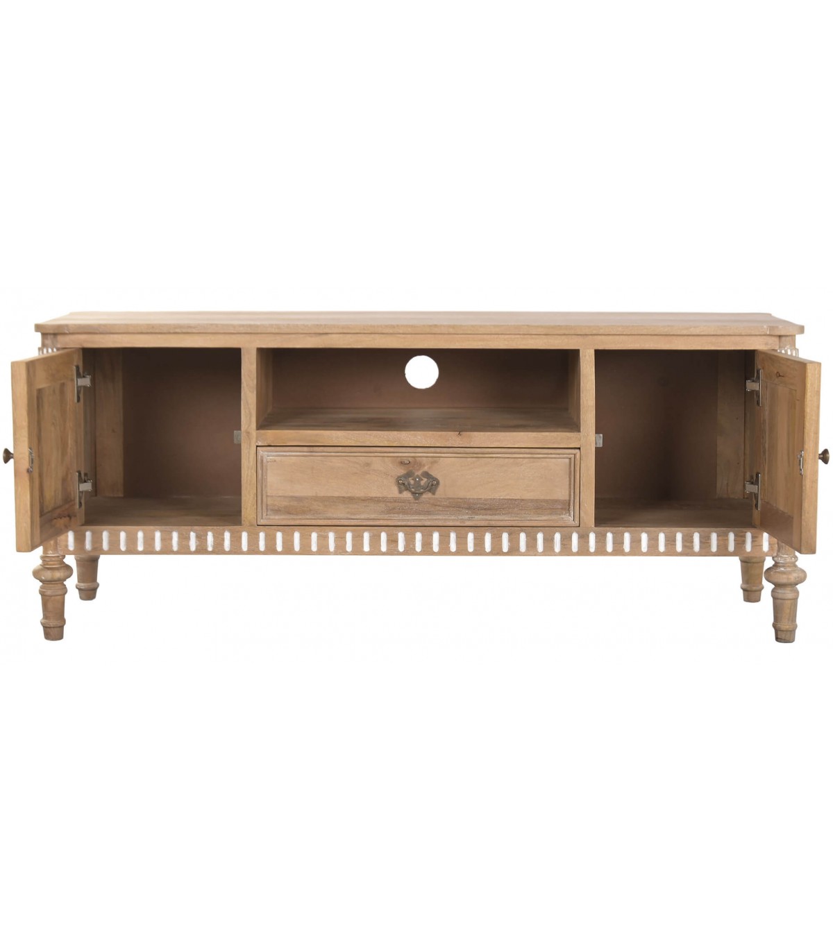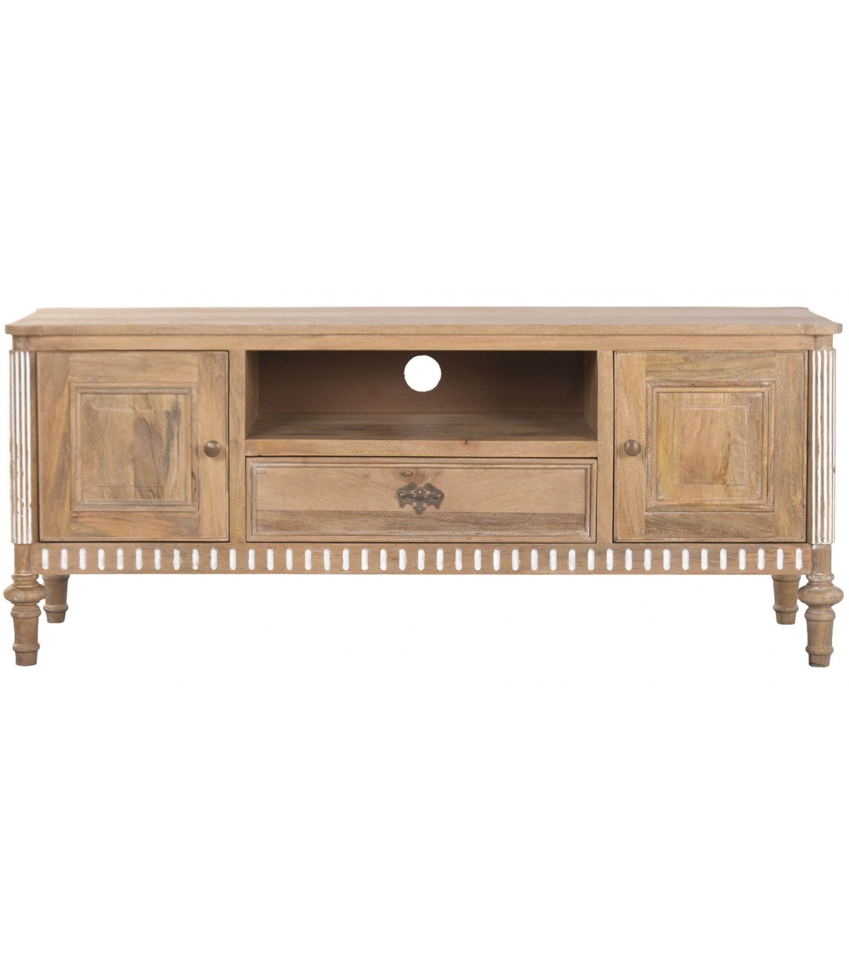 Este mueble de televisión de inspiración provenzal aporta equilibrio y serenidad al salón gracias a su diseño clásico y proporciones contenidas. La madera maciza de mango en acabado natural transmite calidez visual y una sensación de hogar auténtico. Los detalles torneados patinados en blanco suavizan el conjunto y refuerzan su carácter artesanal.