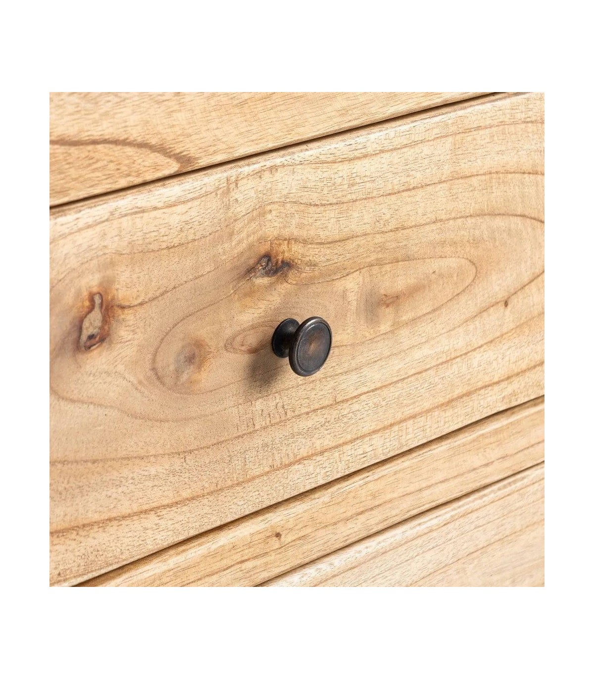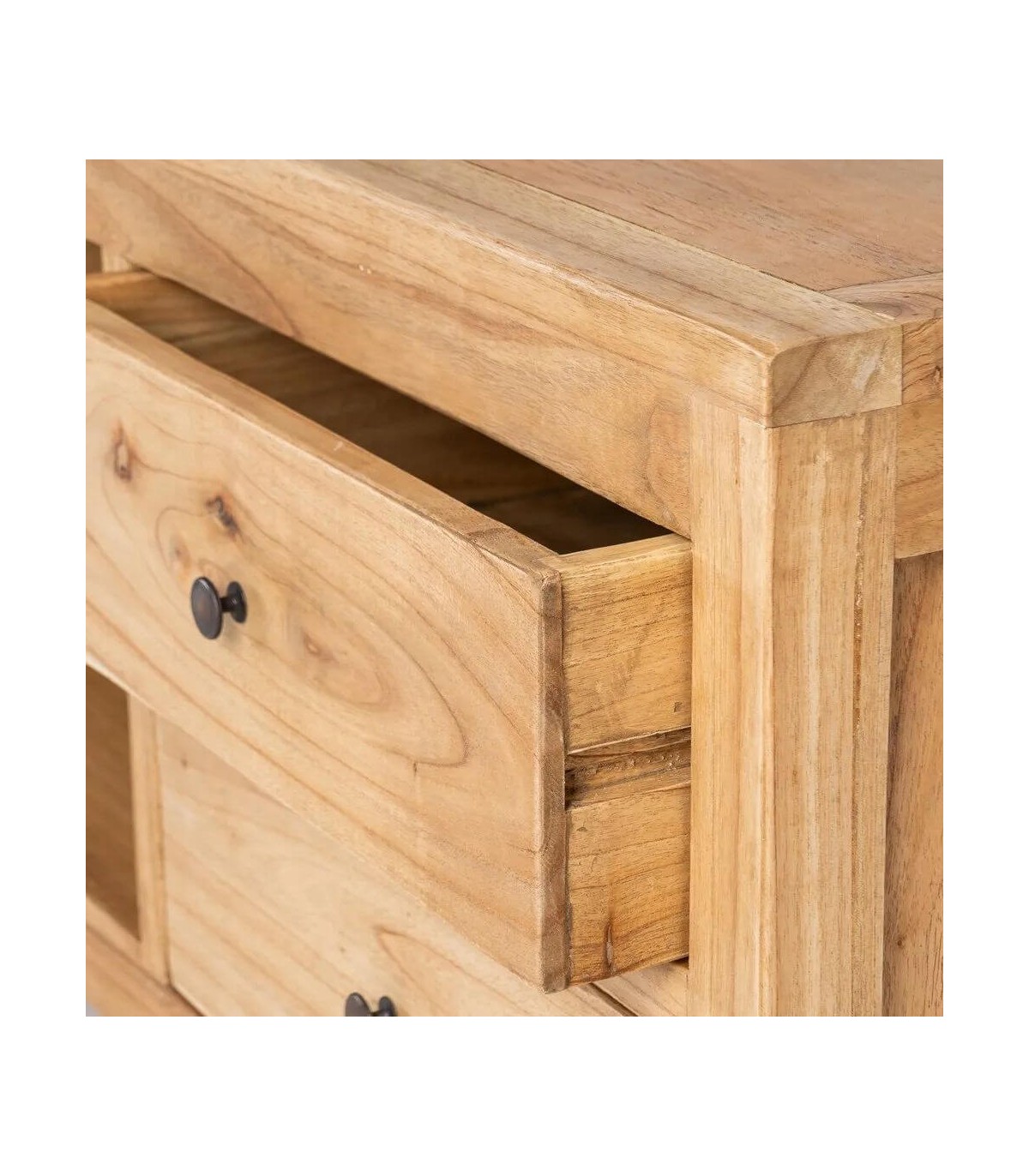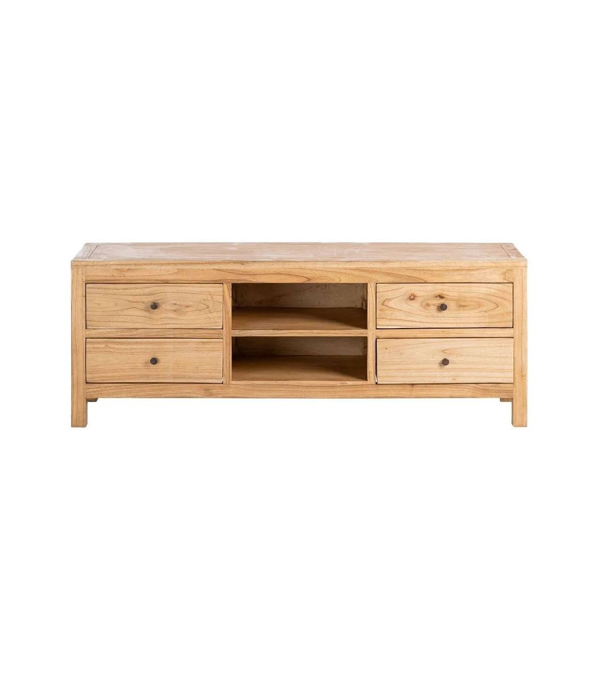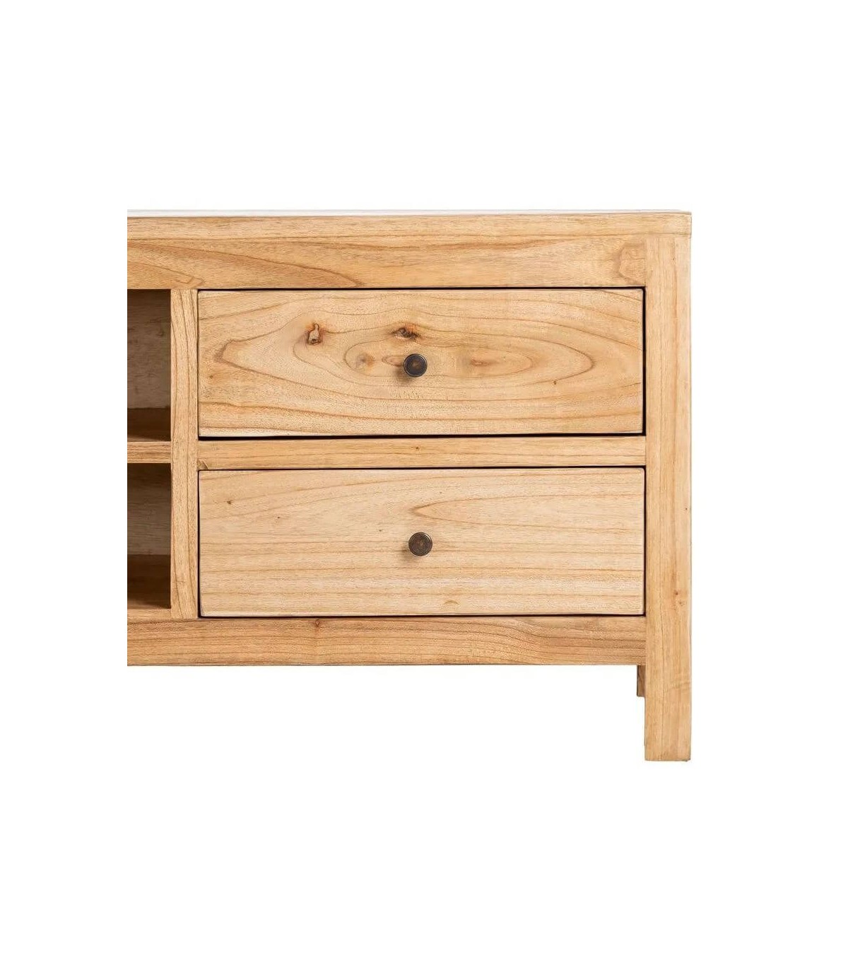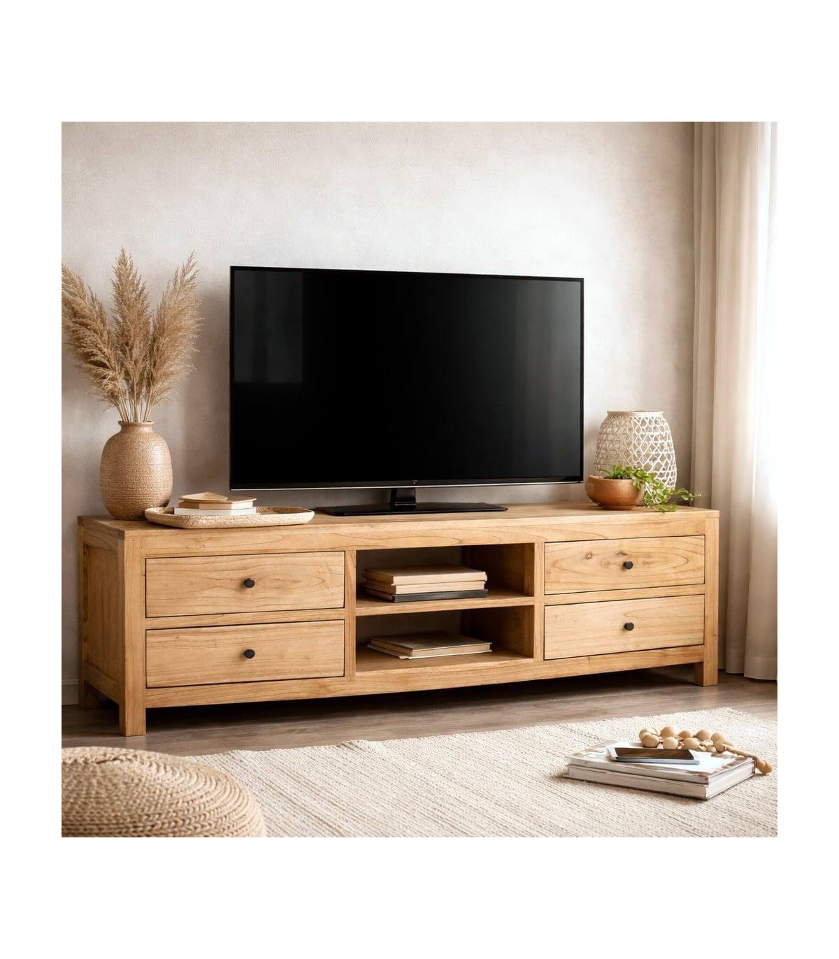 Mueble de televisión de estilo boho pensado para aportar orden y calidez al espacio principal del hogar con una estética natural y equilibrada. Su diseño de líneas rectas y proporciones amplias destaca por la belleza de la madera de mindi en tono natural claro, transmitiendo sensación de armonía y solidez visual.