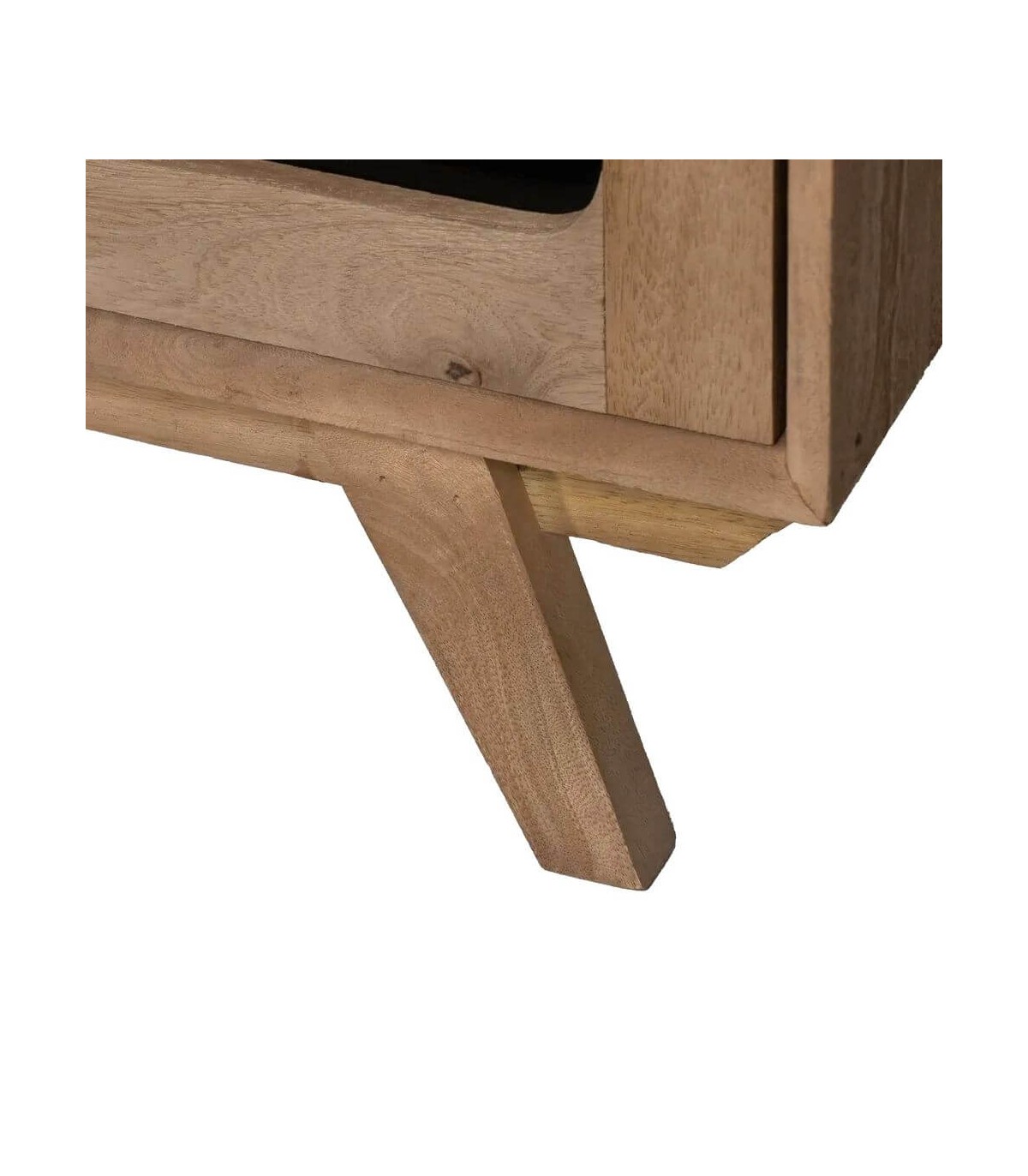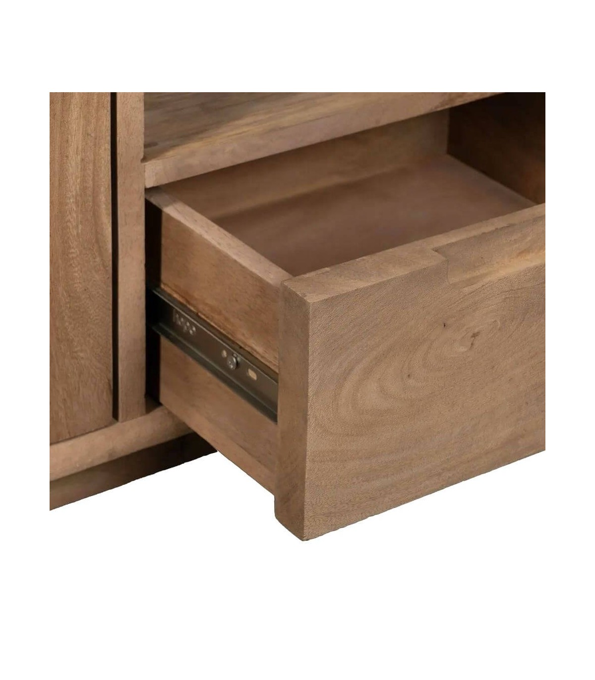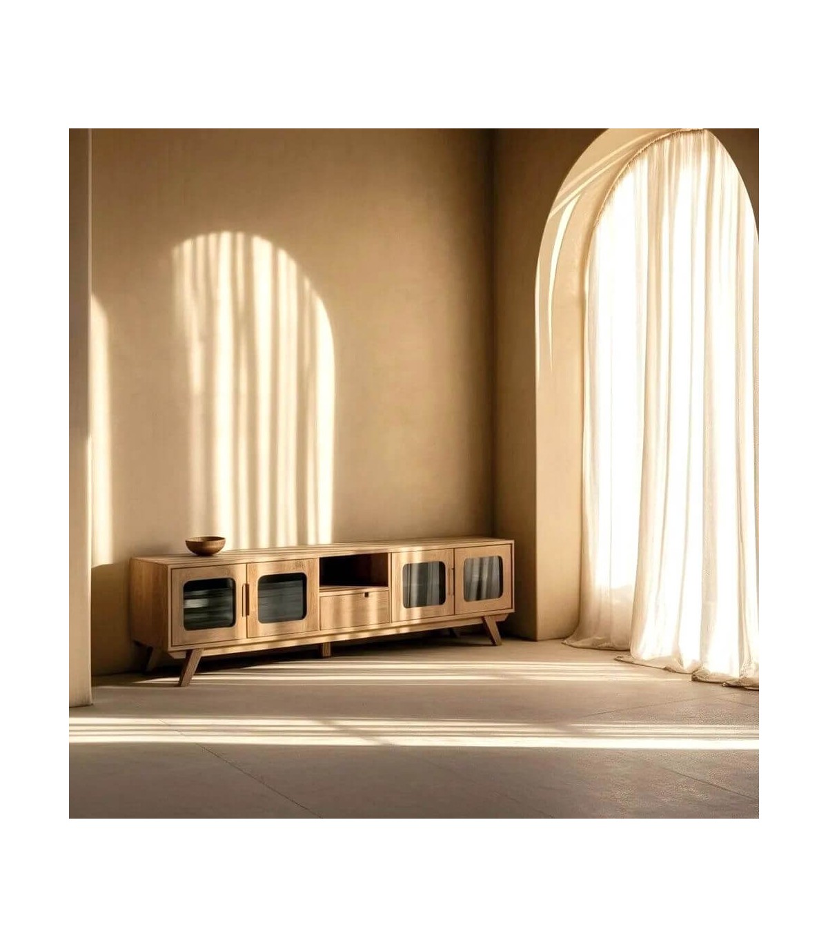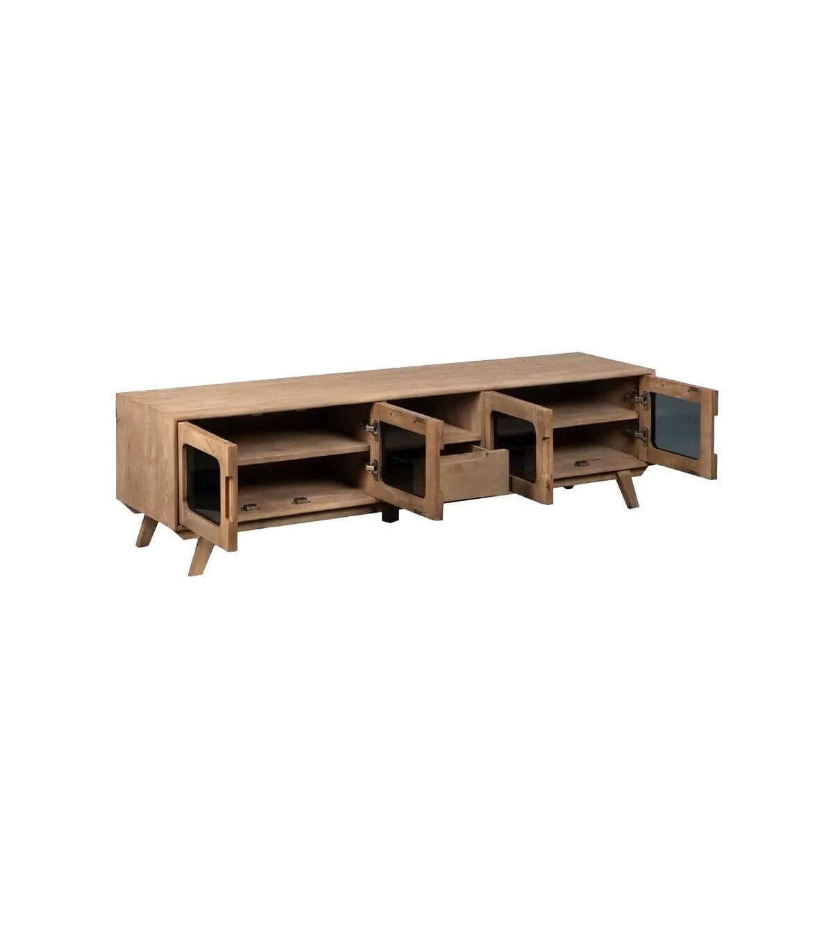 El mueble de TV de gran formato combina diseño bohemio y funcionalidad, ofreciendo espacio amplio para organizar con equilibrio y estilo el salón. Sus cuatro puertas en madera maciza de mango se acompañan de un cajón central que facilita el orden, manteniendo la estética ligera.
